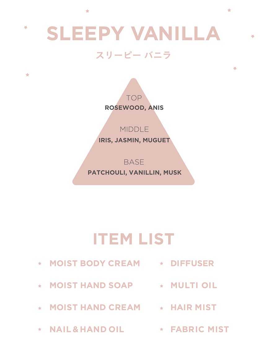 在睡前的時光,以舒緩的香氣將幸福感充滿,推出如大人的甜點般的自我保養系列。這款布品噴霧提供兩種香氛選擇。對衣物或其他容易有異味的地方輕輕噴灑,即可讓房間散發淡淡香氣。柔和甜美、包覆感十足的「SLEEPY VANILLA」香氛,以及清爽舒適、空間中漫開的「FLOWER BLISS」香氛兩種香味可供選擇。也是送禮的推薦商品。