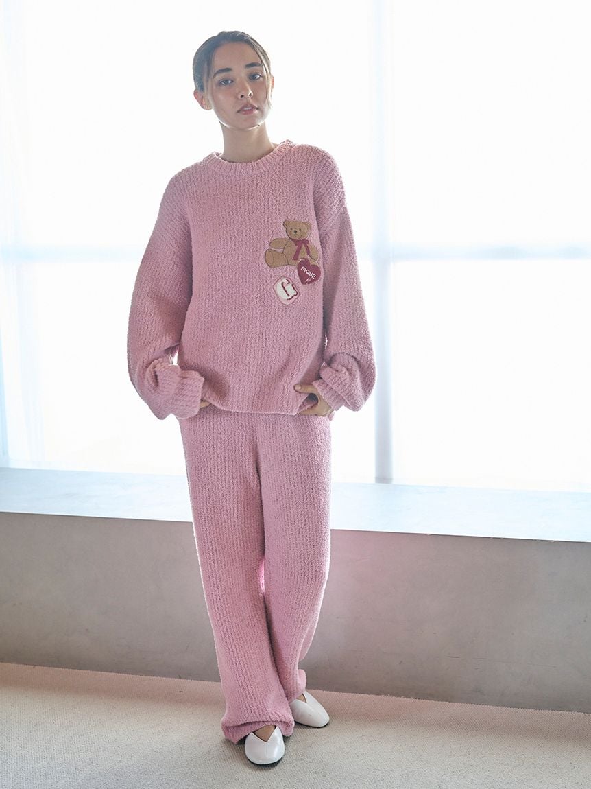 靈感來自女孩最愛的小熊玩偶與可愛房間布置的系列。採用寶寶絨立體羅紋針織長褲,左腰點綴品牌刺繡,後口袋以小熊玩偶造型的毛巾繡(sagara)呈現可愛細節。剪裁為俐落、活動方便的直筒版型。提供米白、粉色、海軍藍三色,可與同系列針織外套或上衣搭配,也能與同系列「Favorite」圖案單品組合穿著。