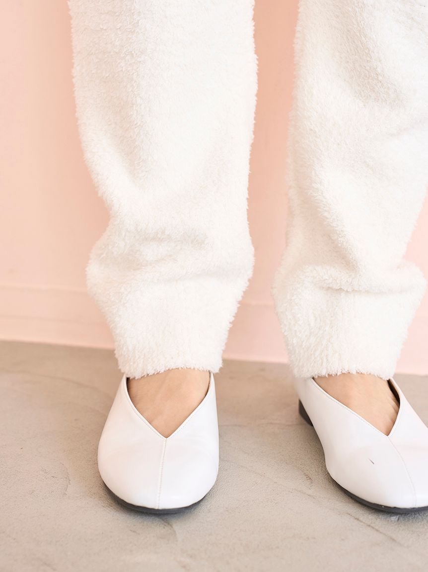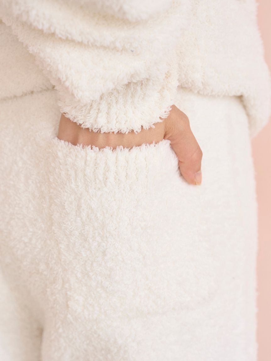 為辛勞一天畫下甜蜜句點。本系列以甜甜圈提花織物詮釋品嚐甜甜圈前的幸福心境。採用蓬鬆暖意滿溢的毛絨材質製成長褲,左腰處點綴甜甜圈提花圖案與刺繡標誌。收束褲腳的寬鬆剪裁,確保家務時活動自如。