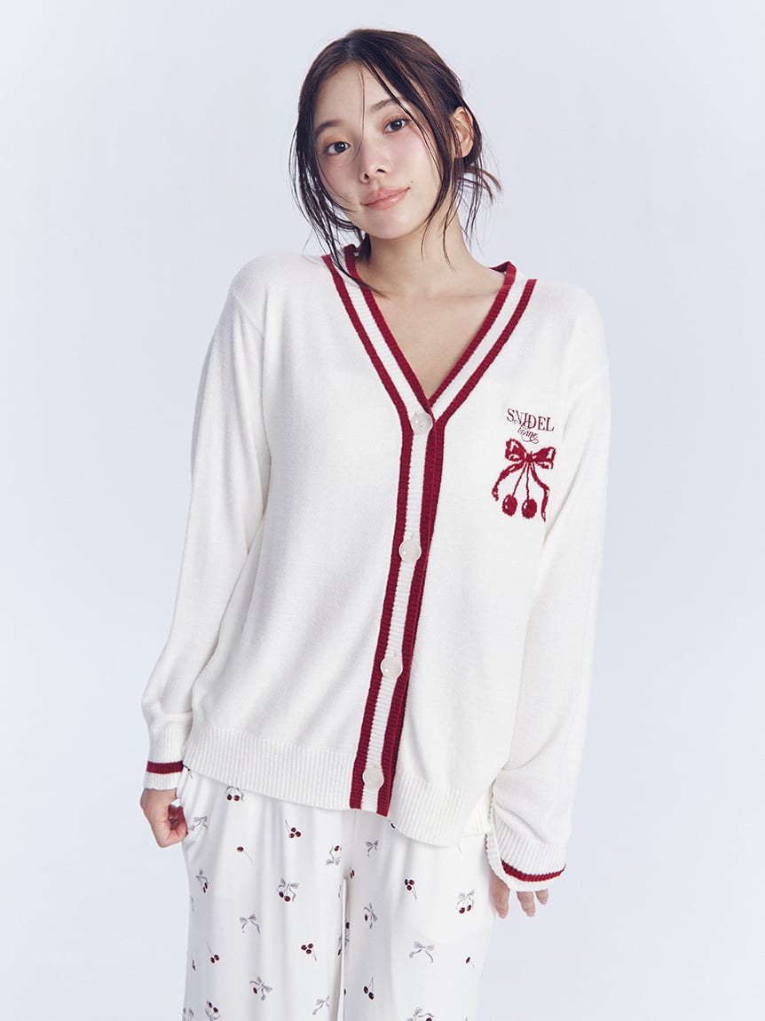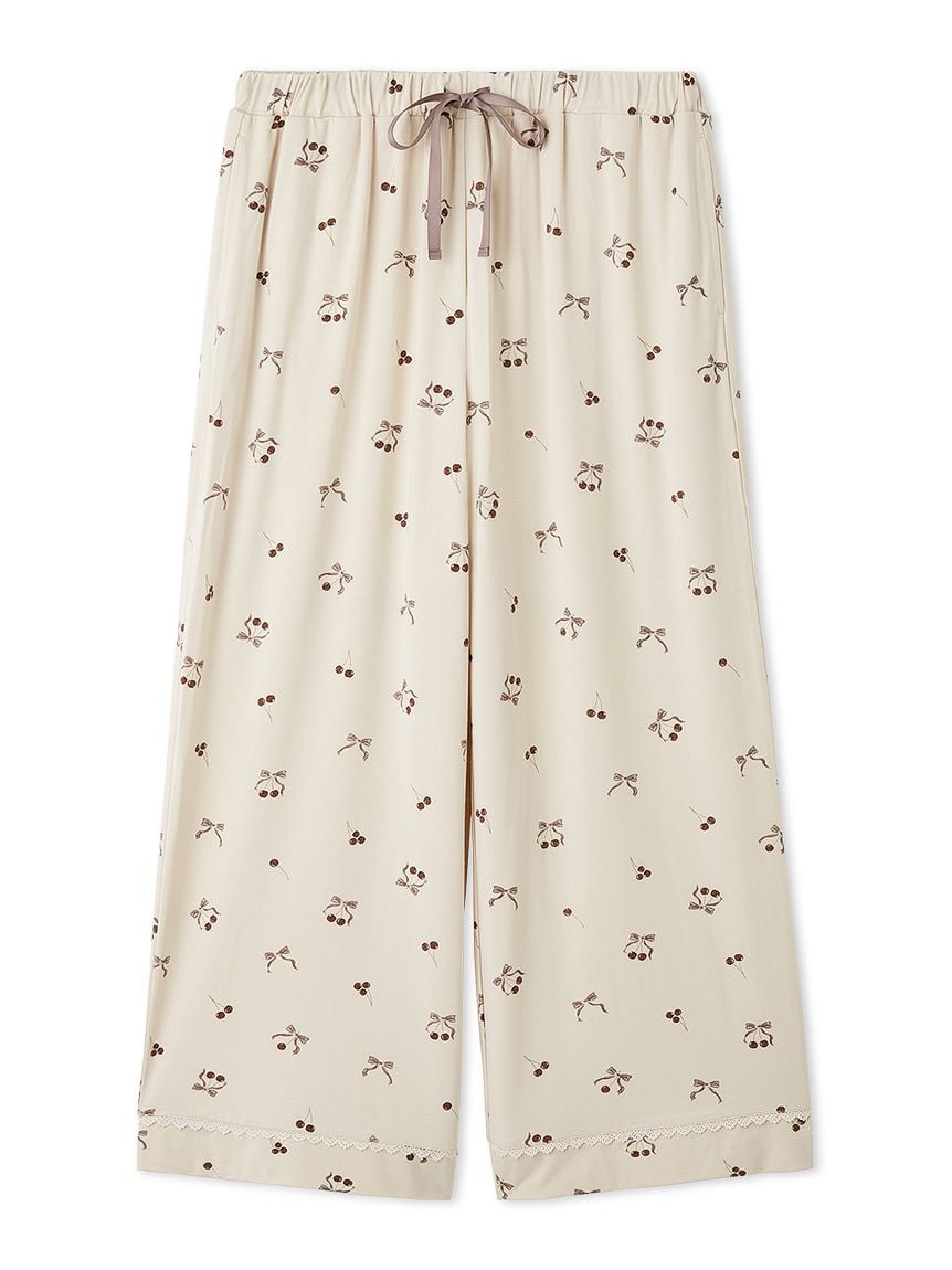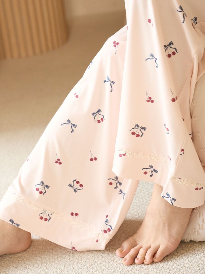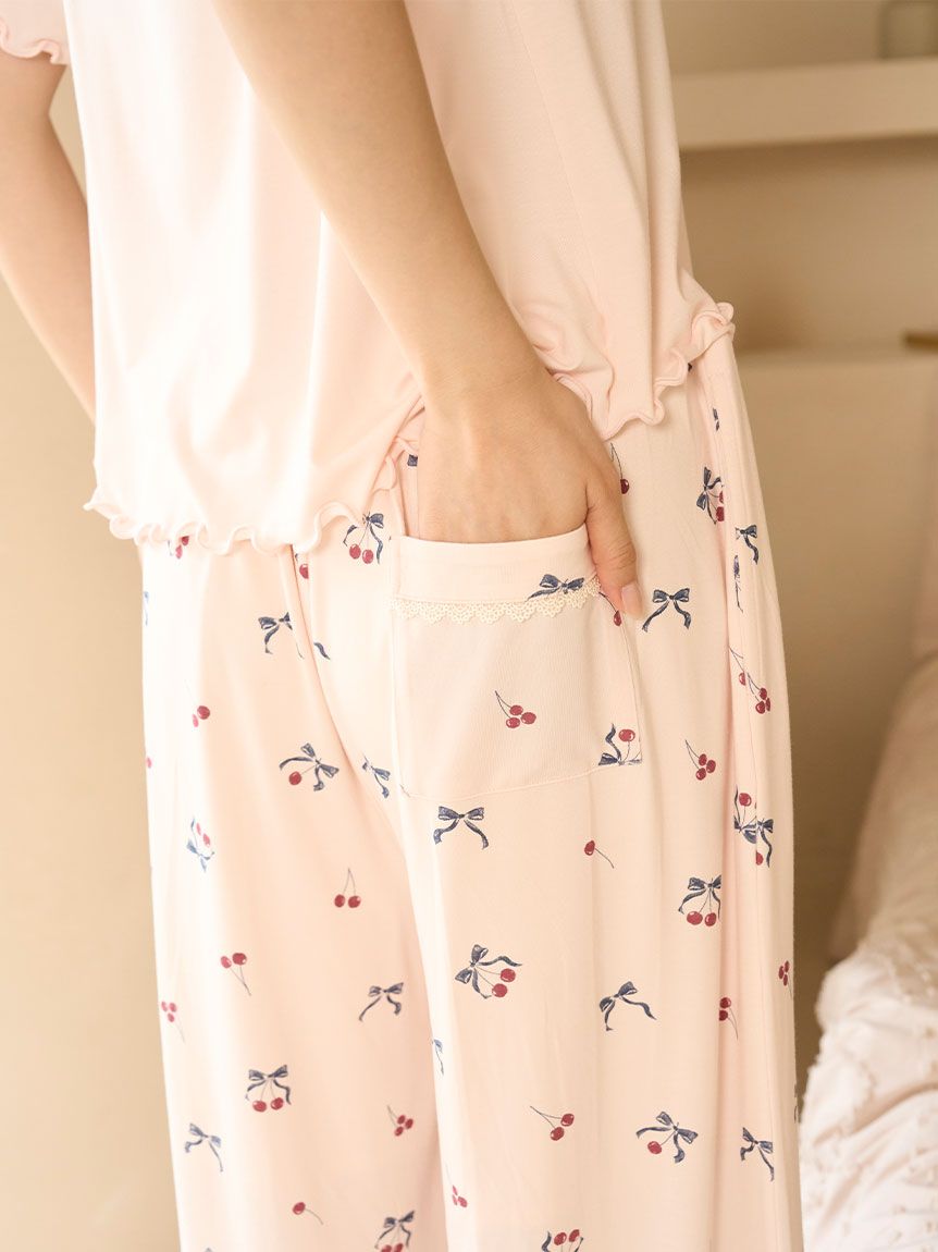 使用涼感接觸冷感嫘縈針織布的睡衣系列長褲。褲腳點綴蕾絲,營造甜美可愛的女孩感。櫻桃與蝴蝶結的印花設計增添趣味印象。
