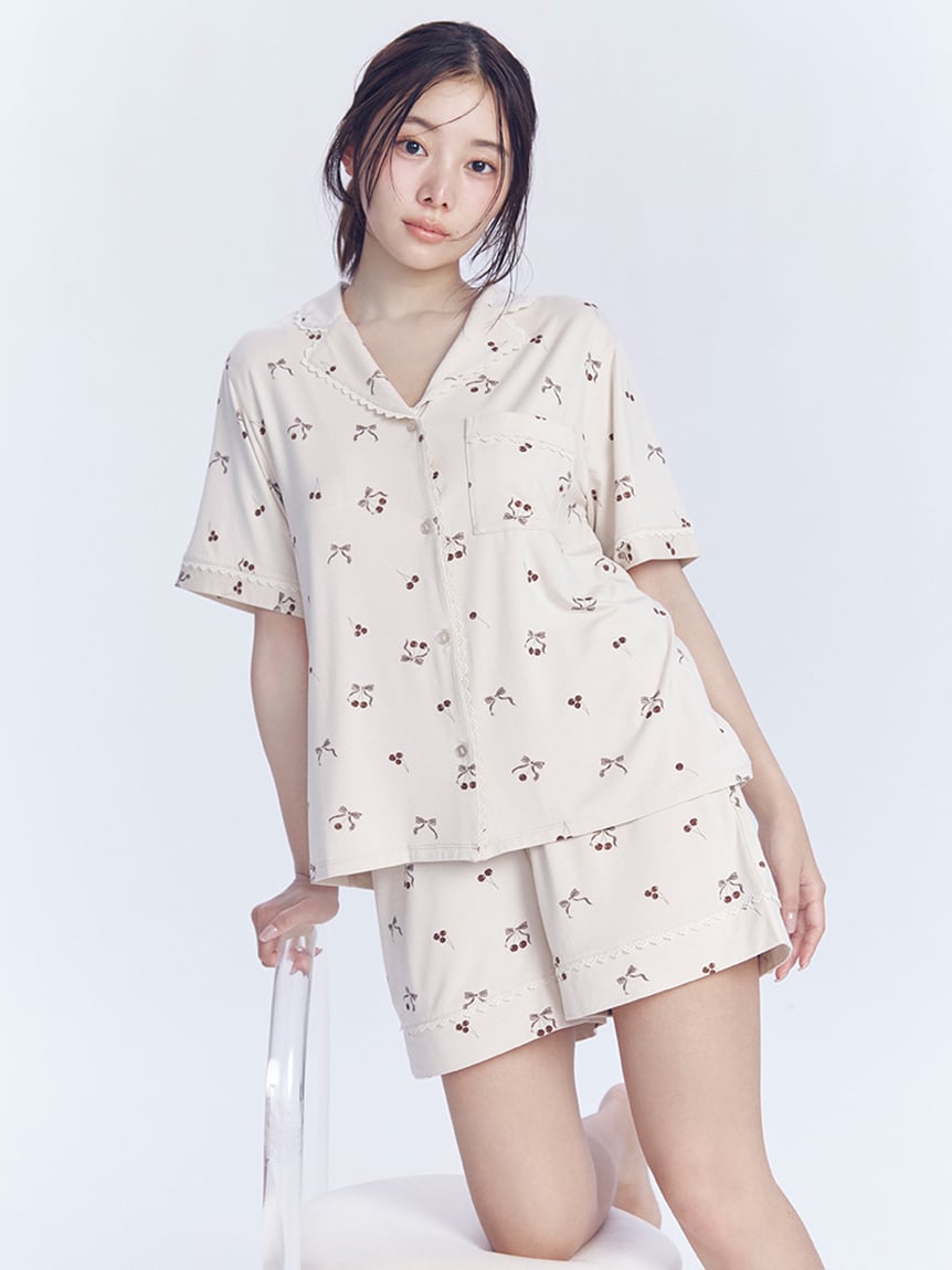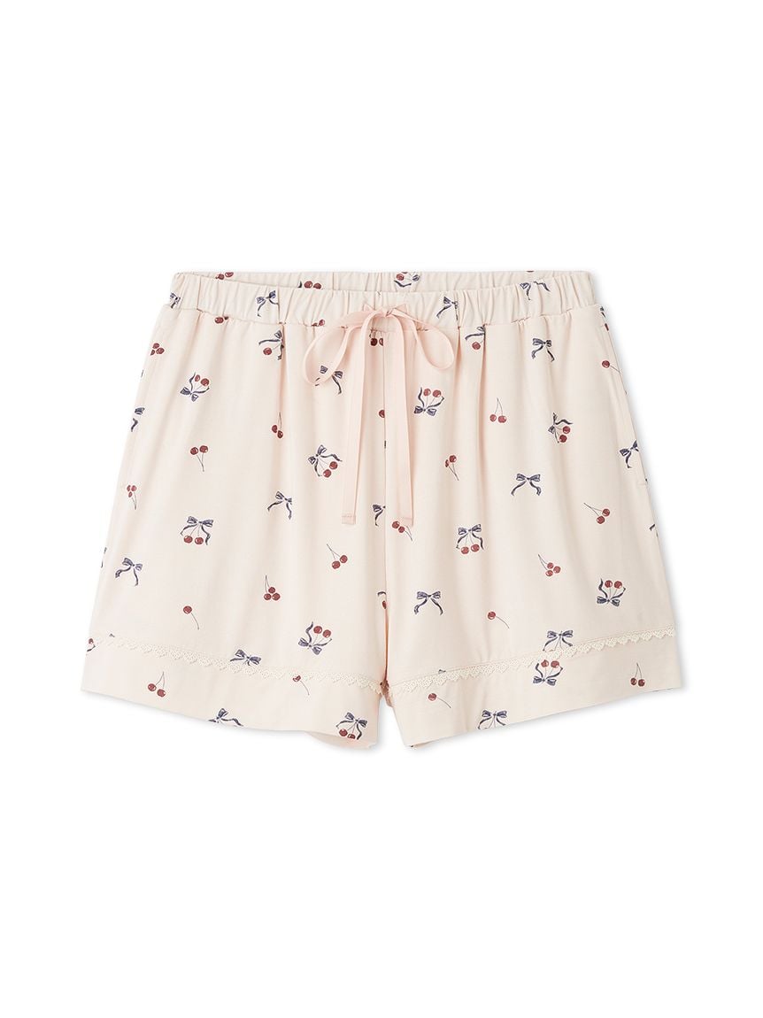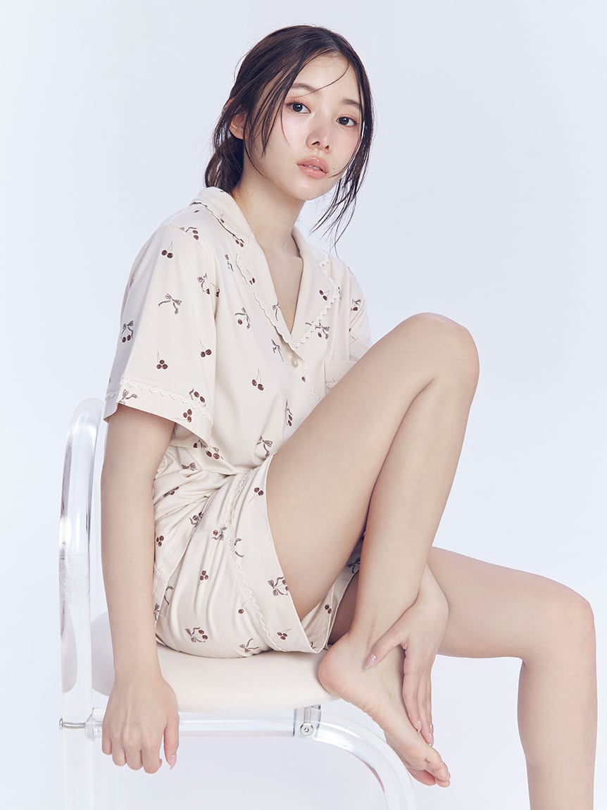 使用涼感接觸冷感嫘縈針織布的睡衣系列短褲。褲腳點綴蕾絲,營造甜美女孩感。櫻桃與蝴蝶結的印花設計增添可愛印象。