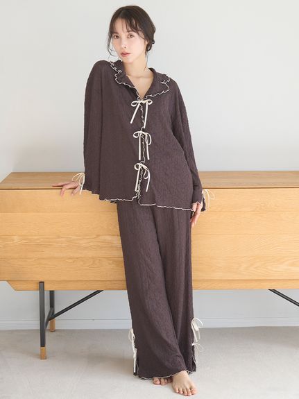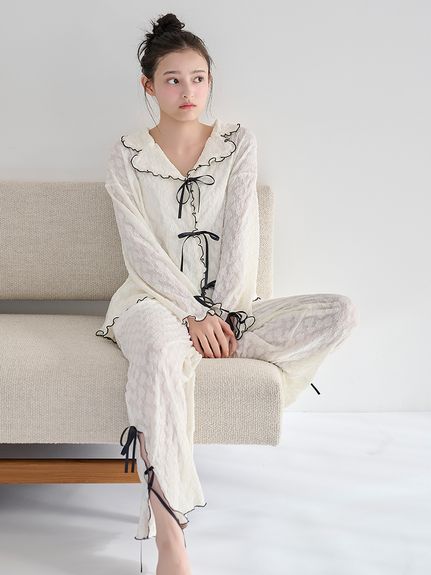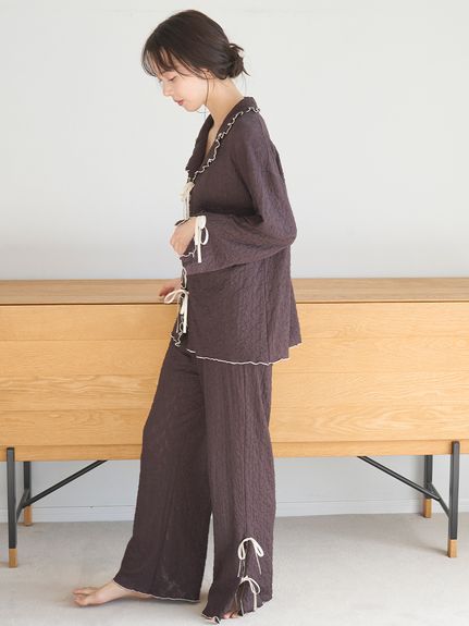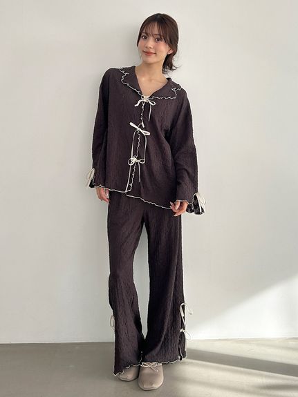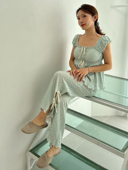 腰部點綴細緻小荷葉邊,營造華麗氛圍的長褲設計。