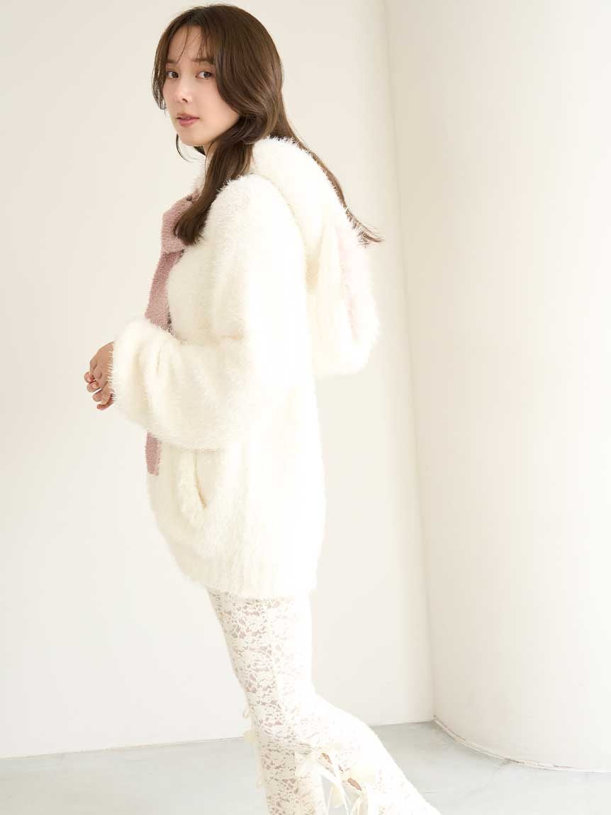 以長絨柔軟針織材質製成的連帽外套,版型寬鬆,附有實用口袋。