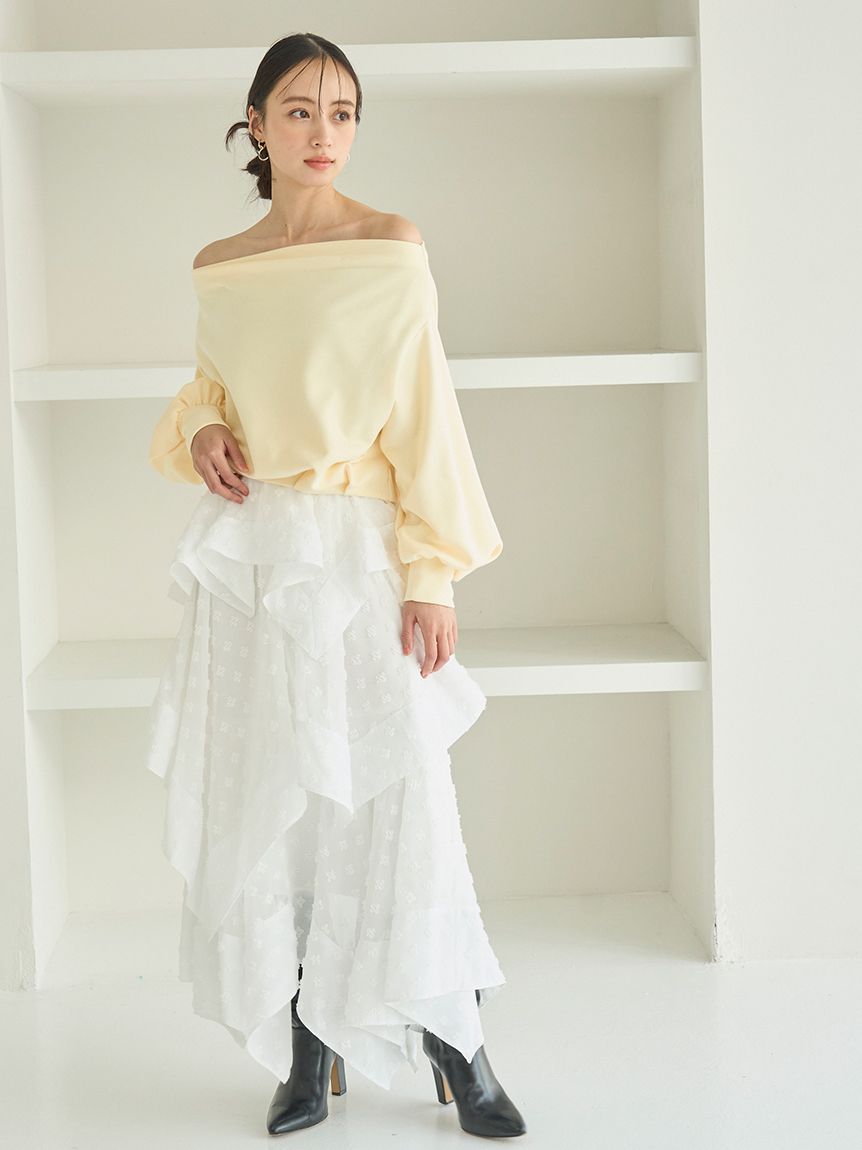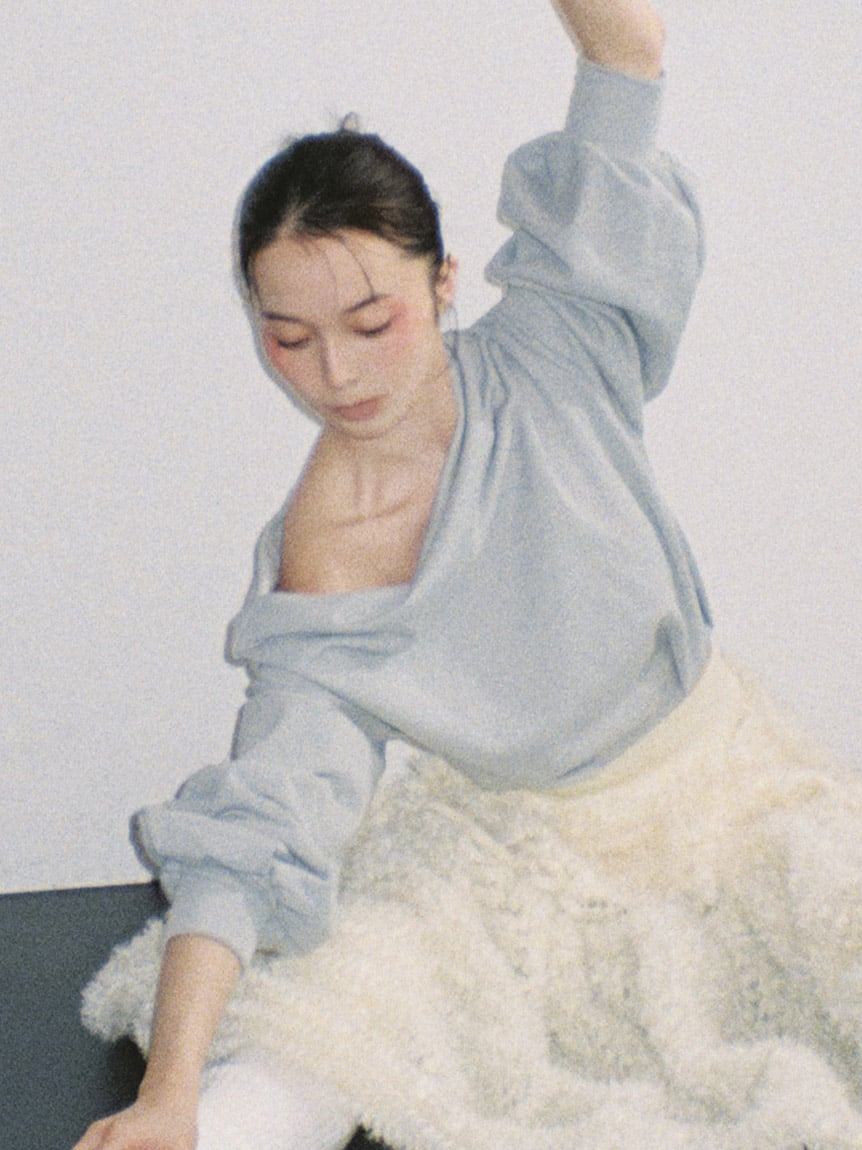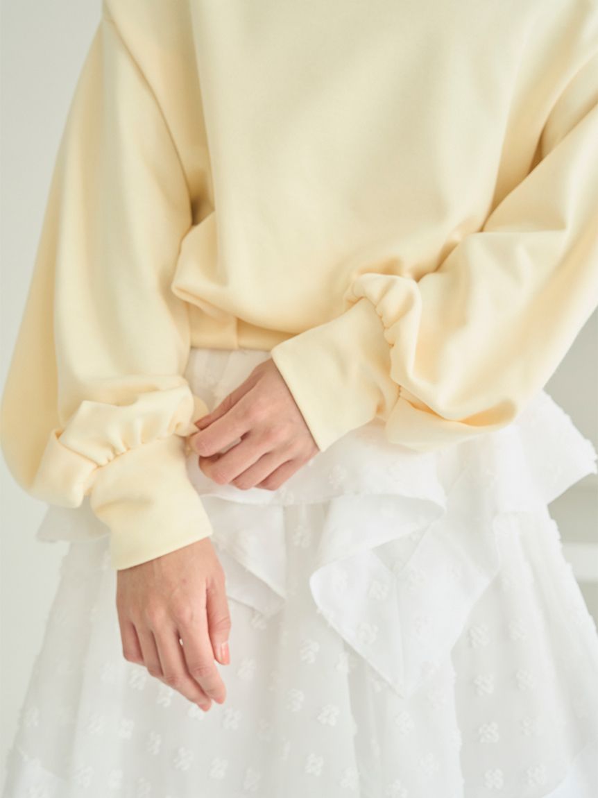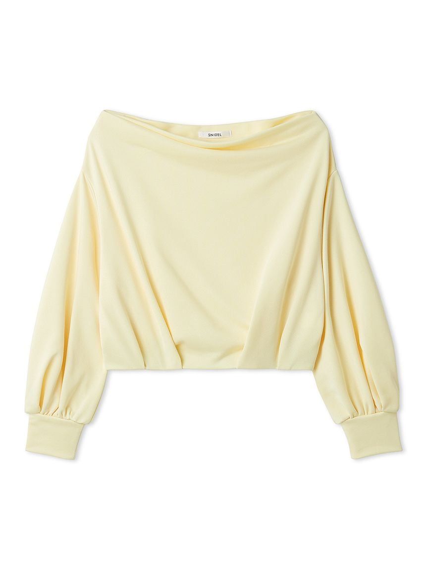 下擺抓褶,營造蓬鬆圓潤感,展現女性柔美氣息的一字肩抓褶衛衣登場。