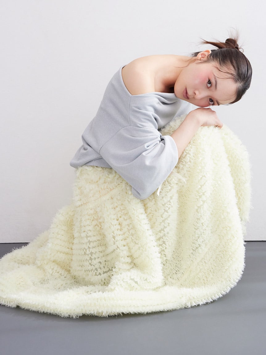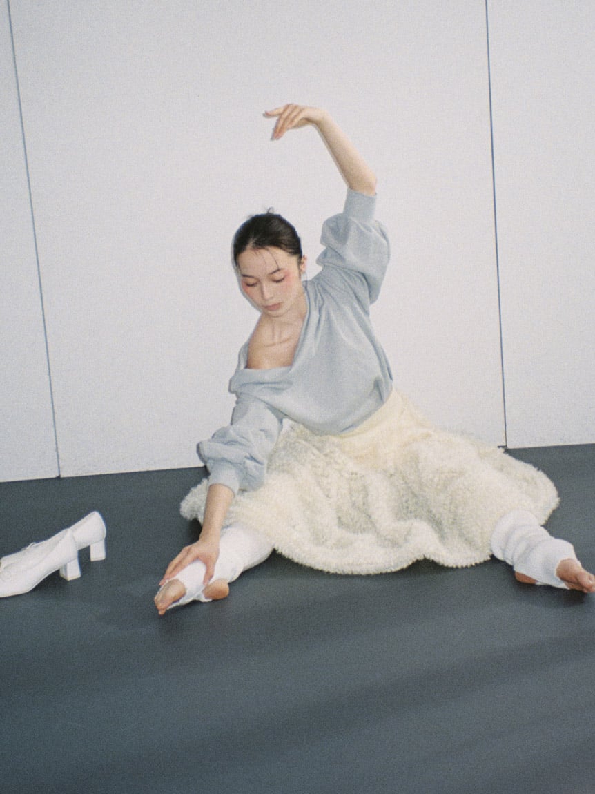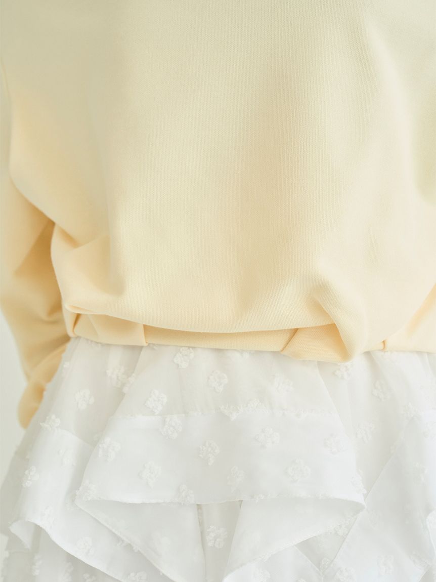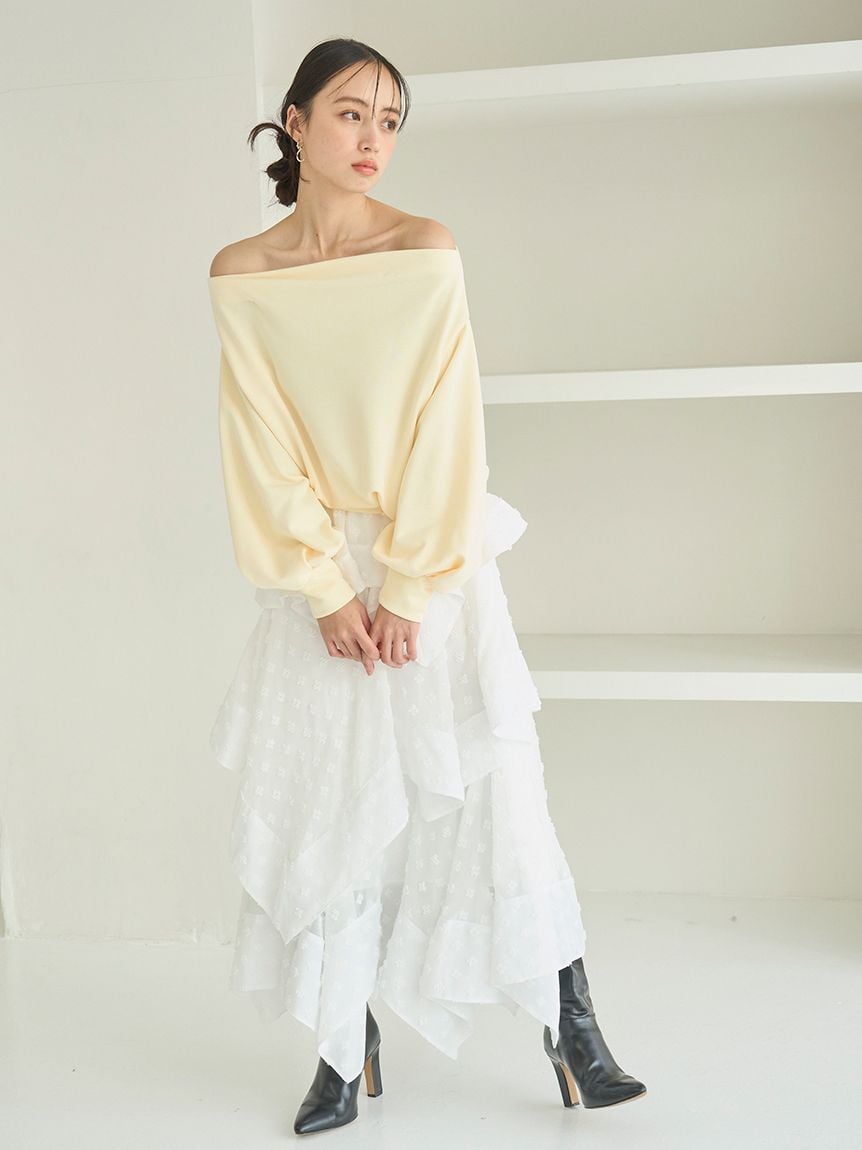 下擺抓褶,營造蓬鬆圓潤感,展現女性柔美氣息的一字肩抓褶衛衣登場。