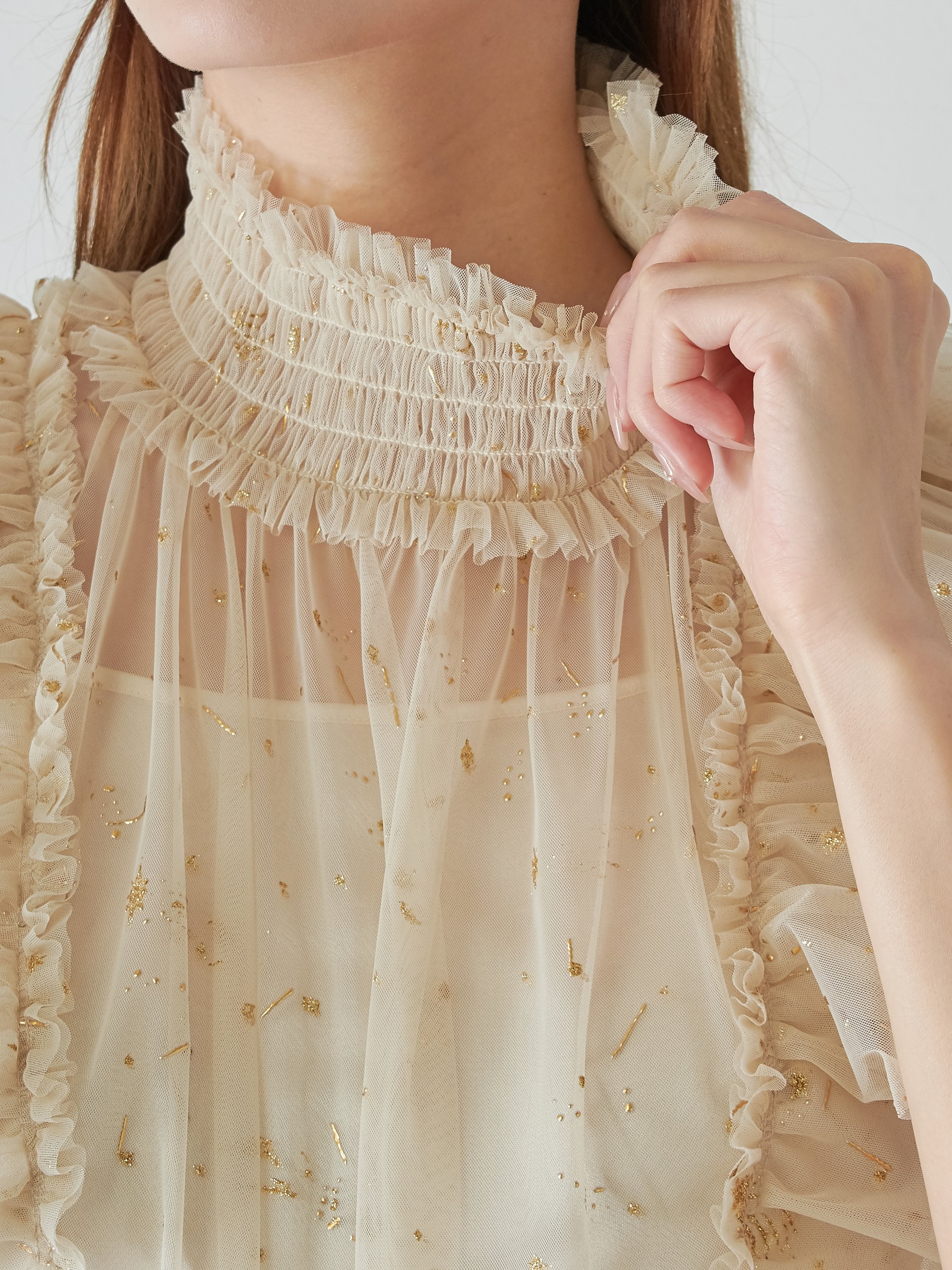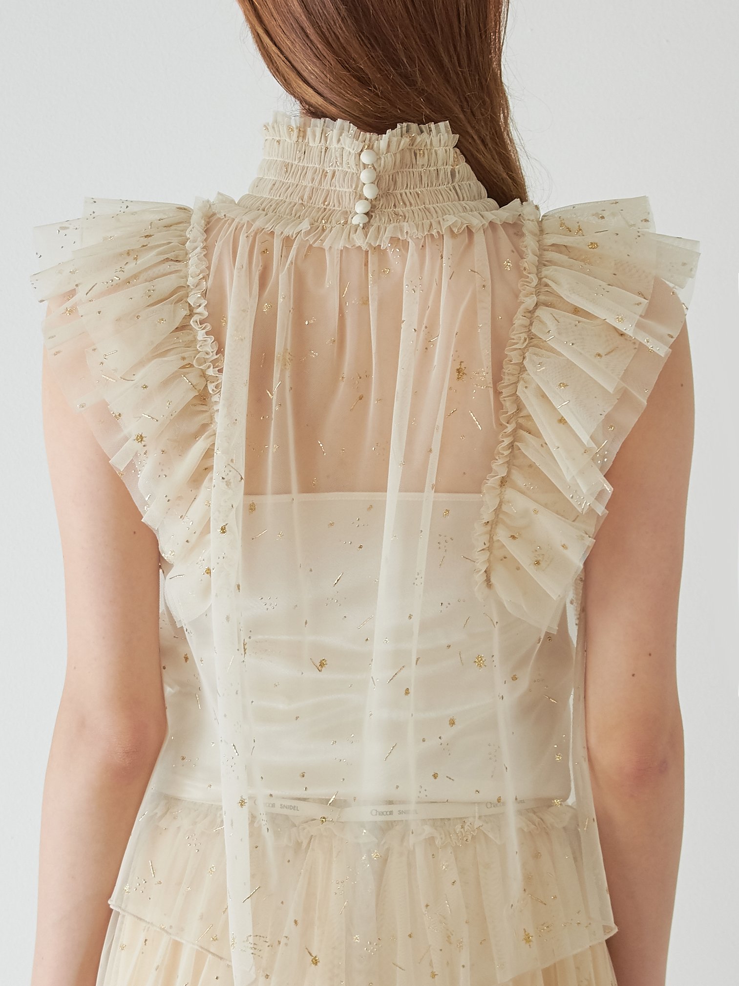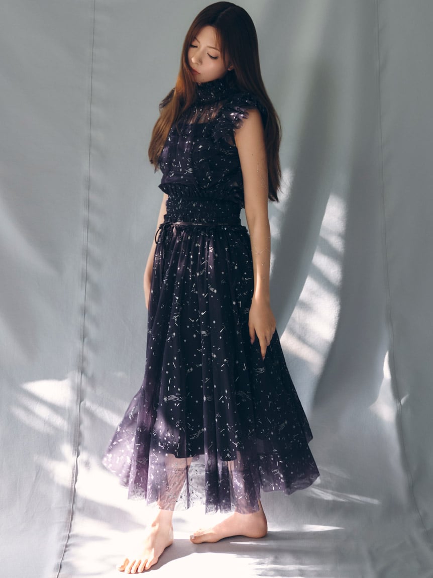 採用柔軟薄紗疊合素色薄紗,並加入閃亮亮片印花,靈感來自星空與流星,呈現精緻浪漫的感覺。高領皺褶設計搭配豐富荷葉邊袖,打造華麗的臉部線條。