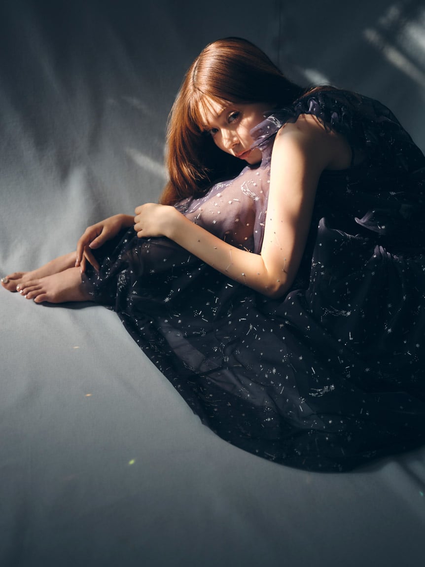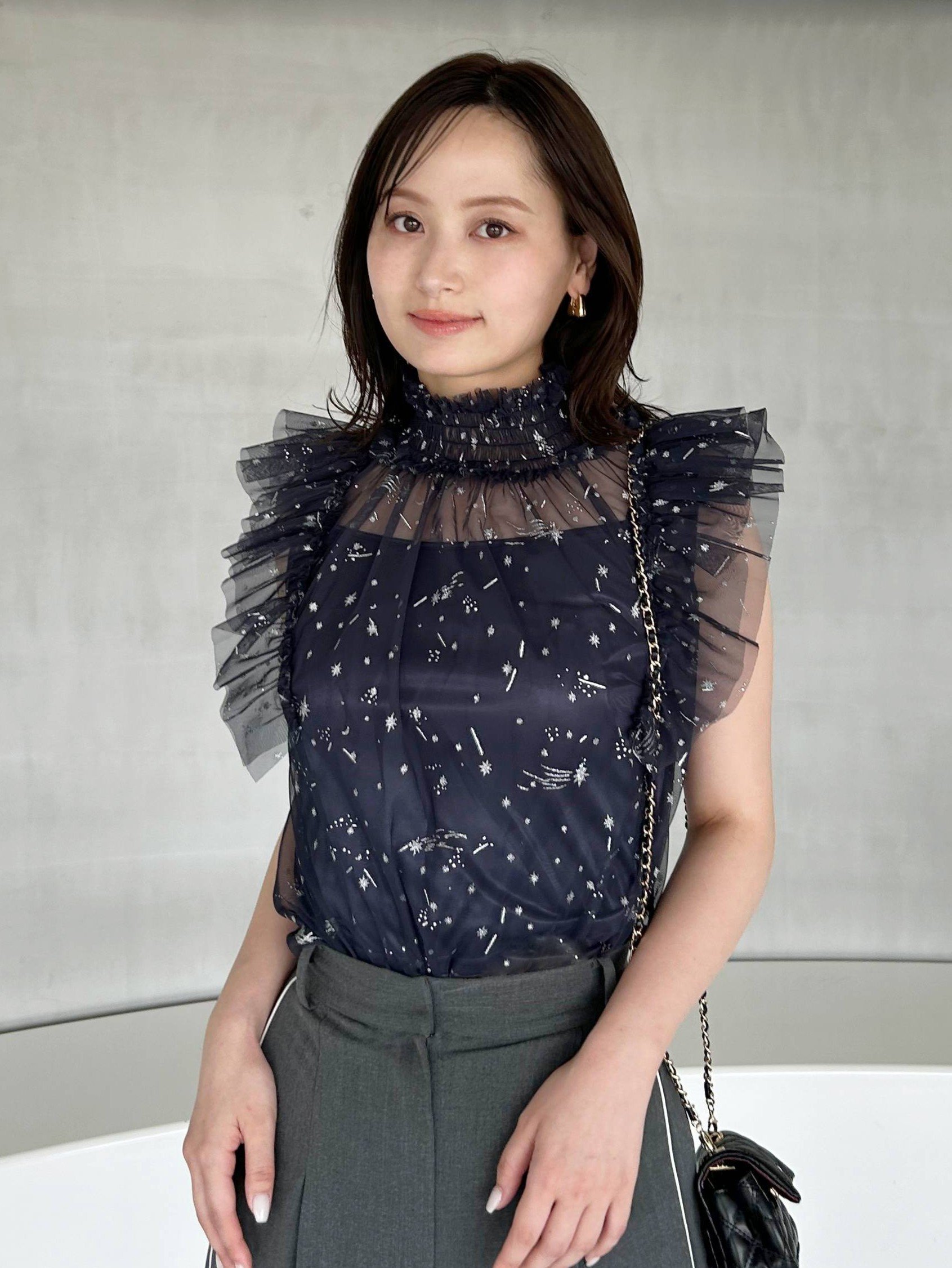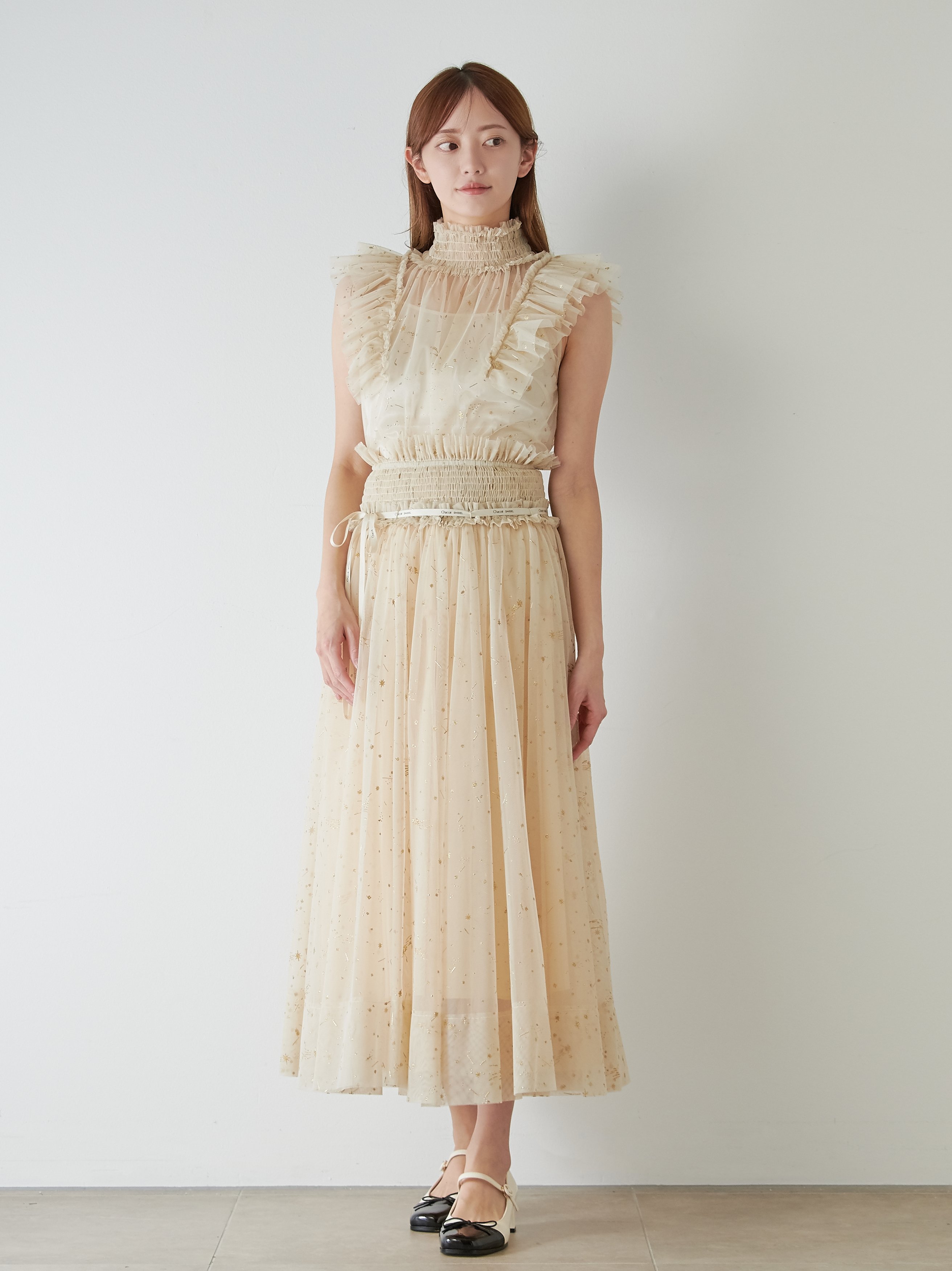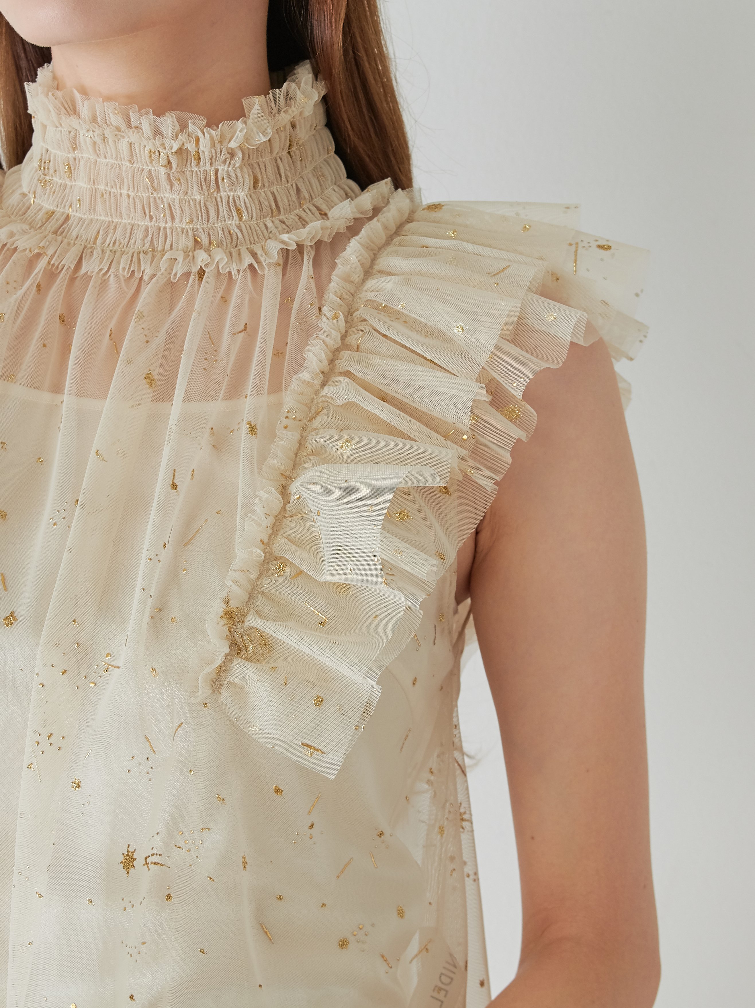 採用柔軟薄紗疊合素色薄紗,並加入閃亮亮片印花,靈感來自星空與流星,呈現精緻浪漫的感覺。高領皺褶設計搭配豐富荷葉邊袖,打造華麗的臉部線條。