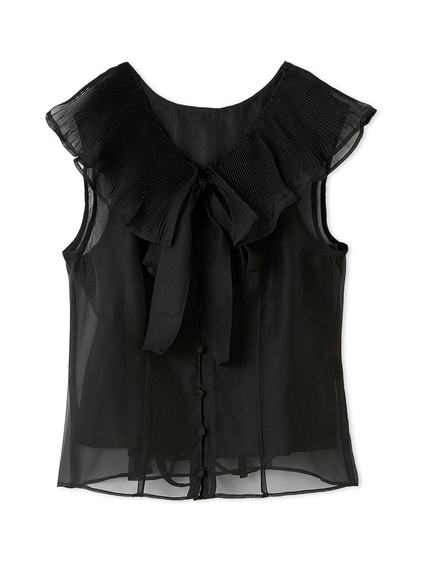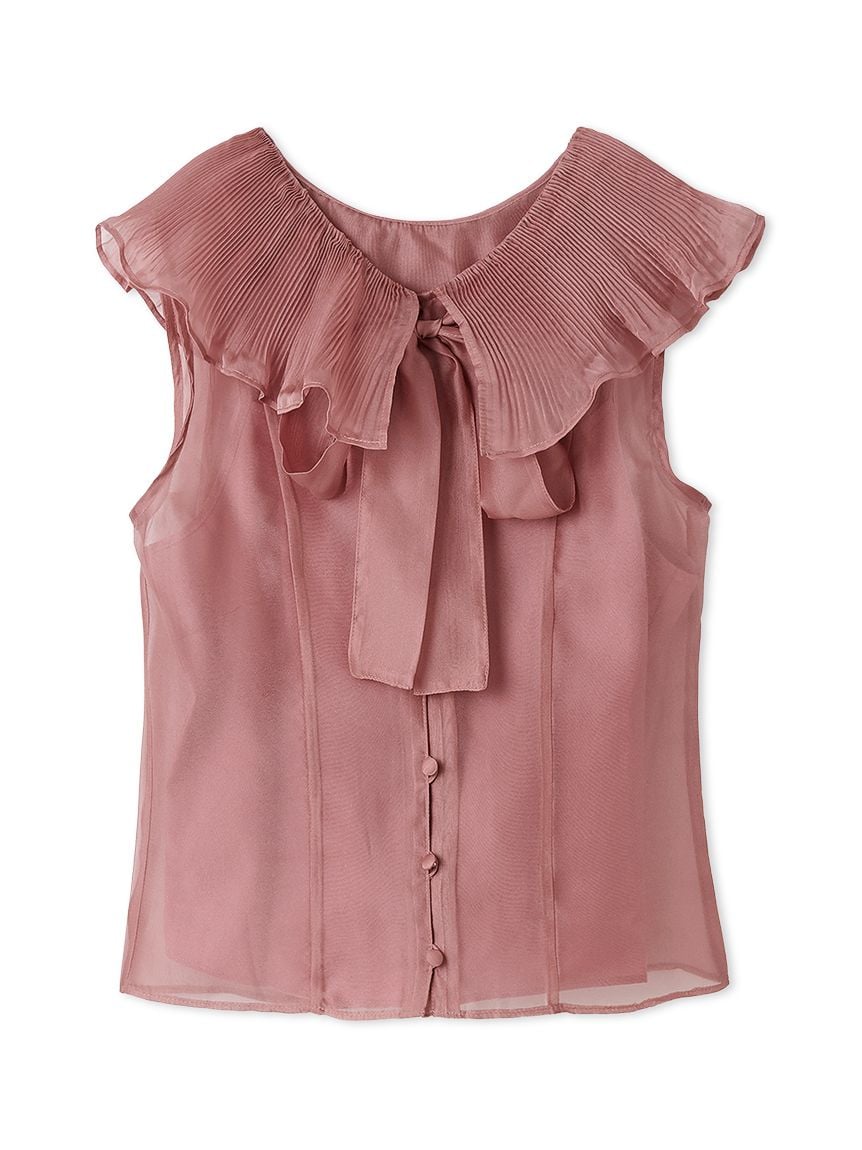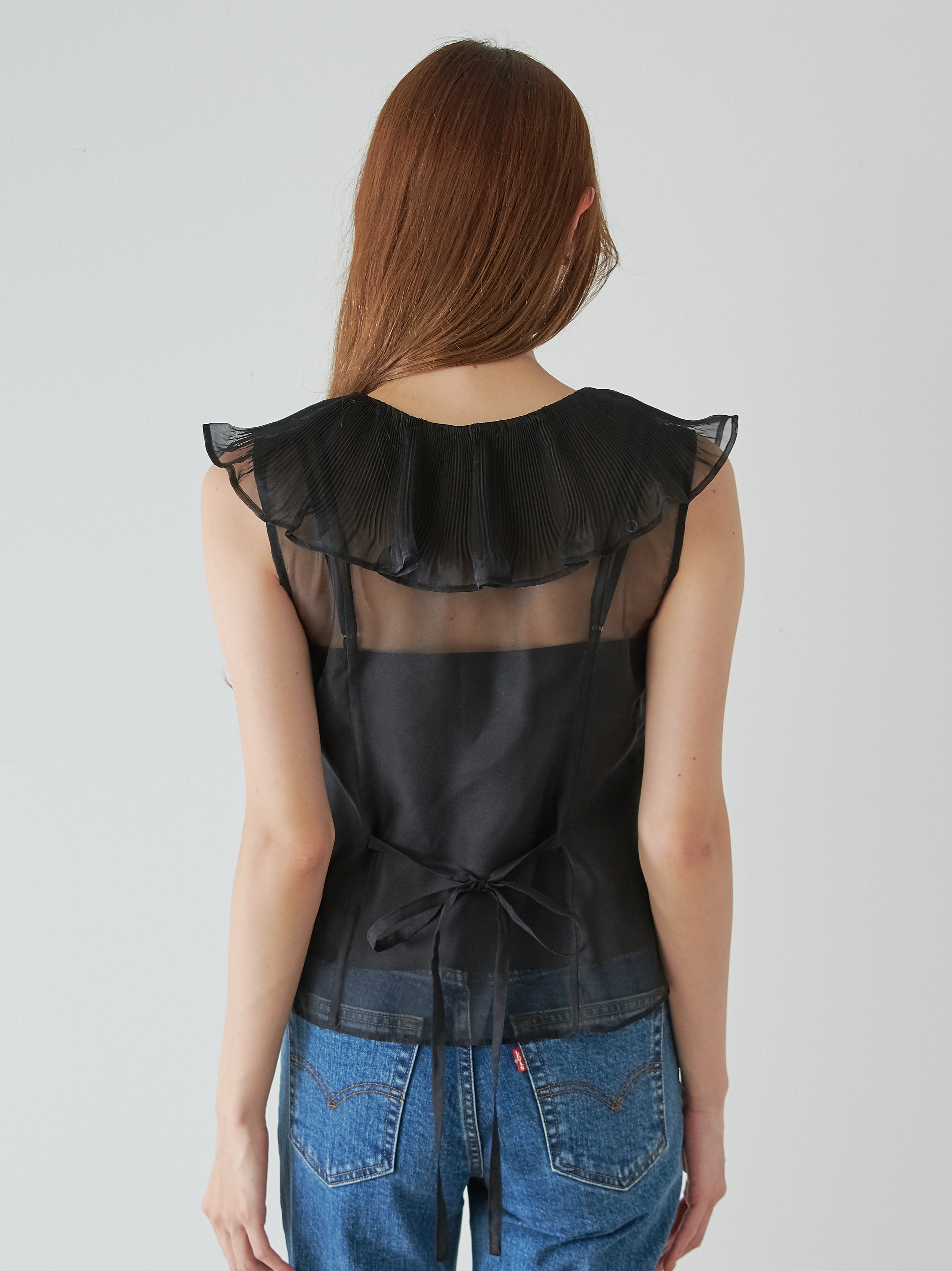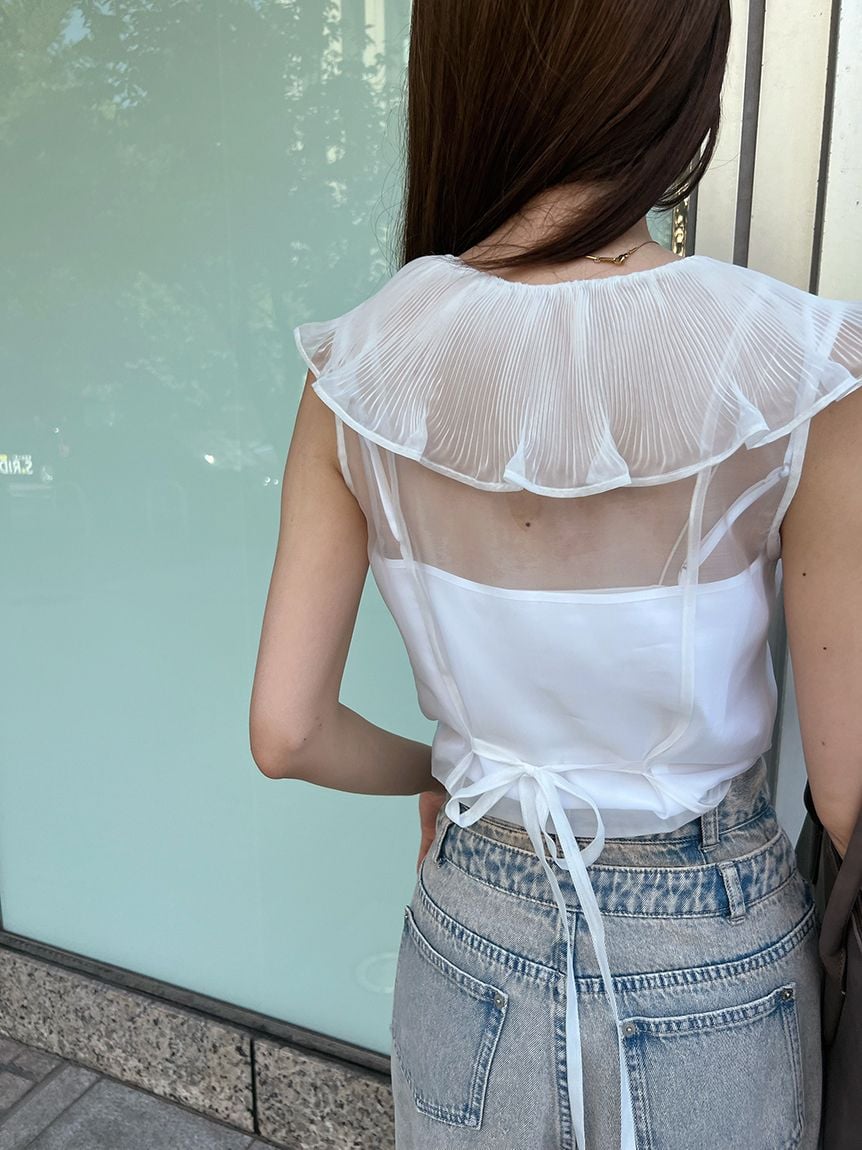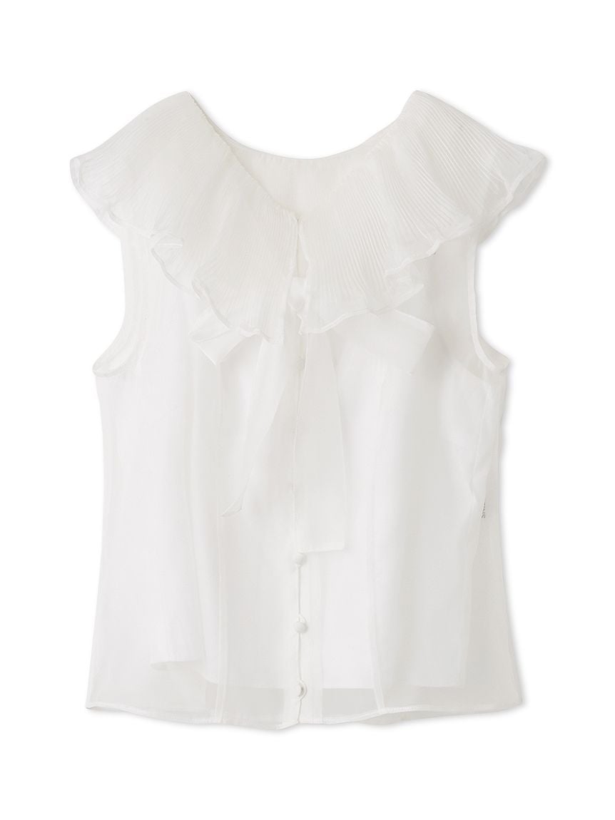 【細緻百褶大領片設計無袖透膚感襯衫】