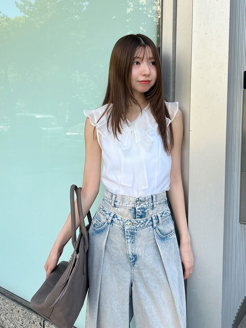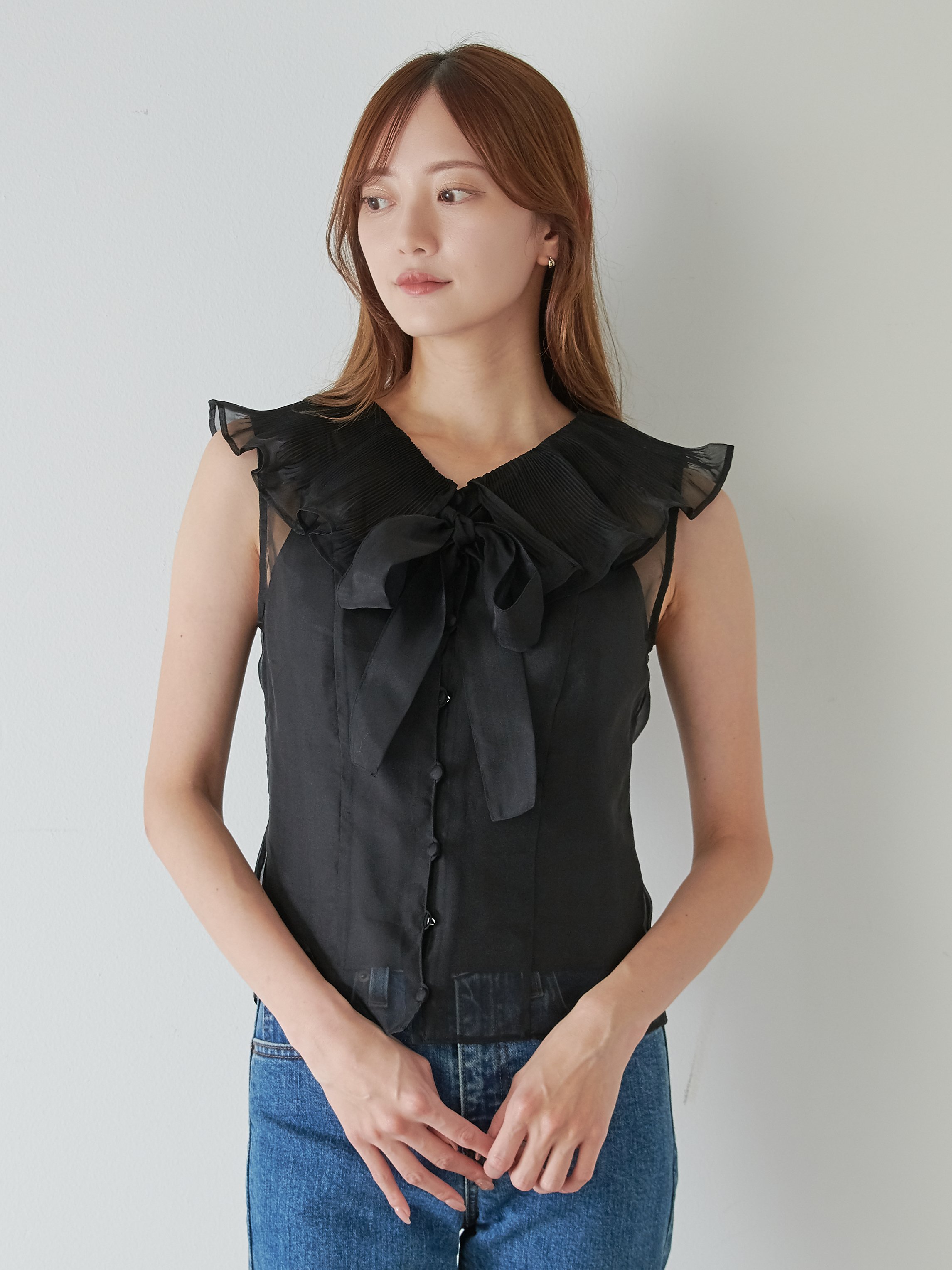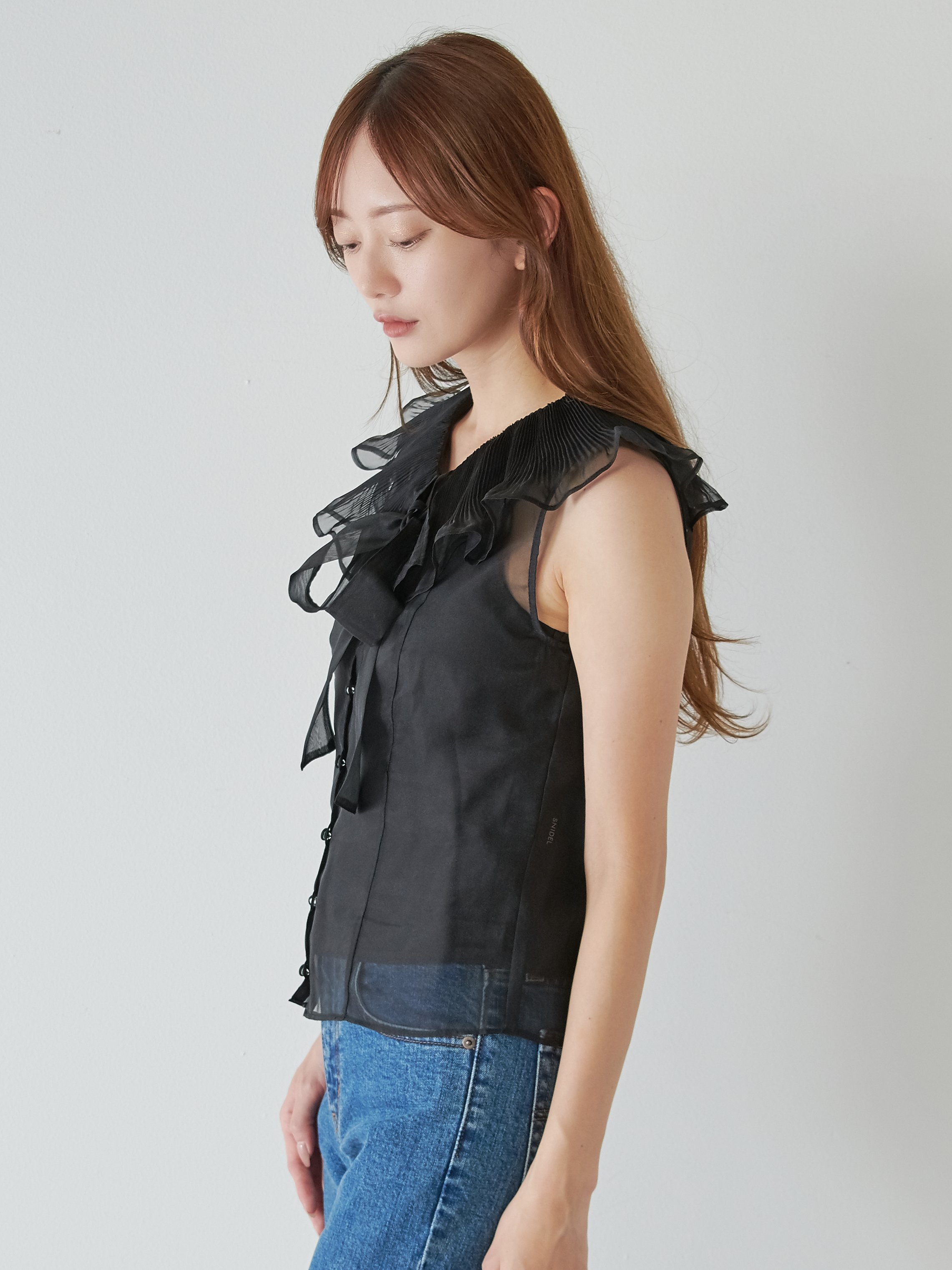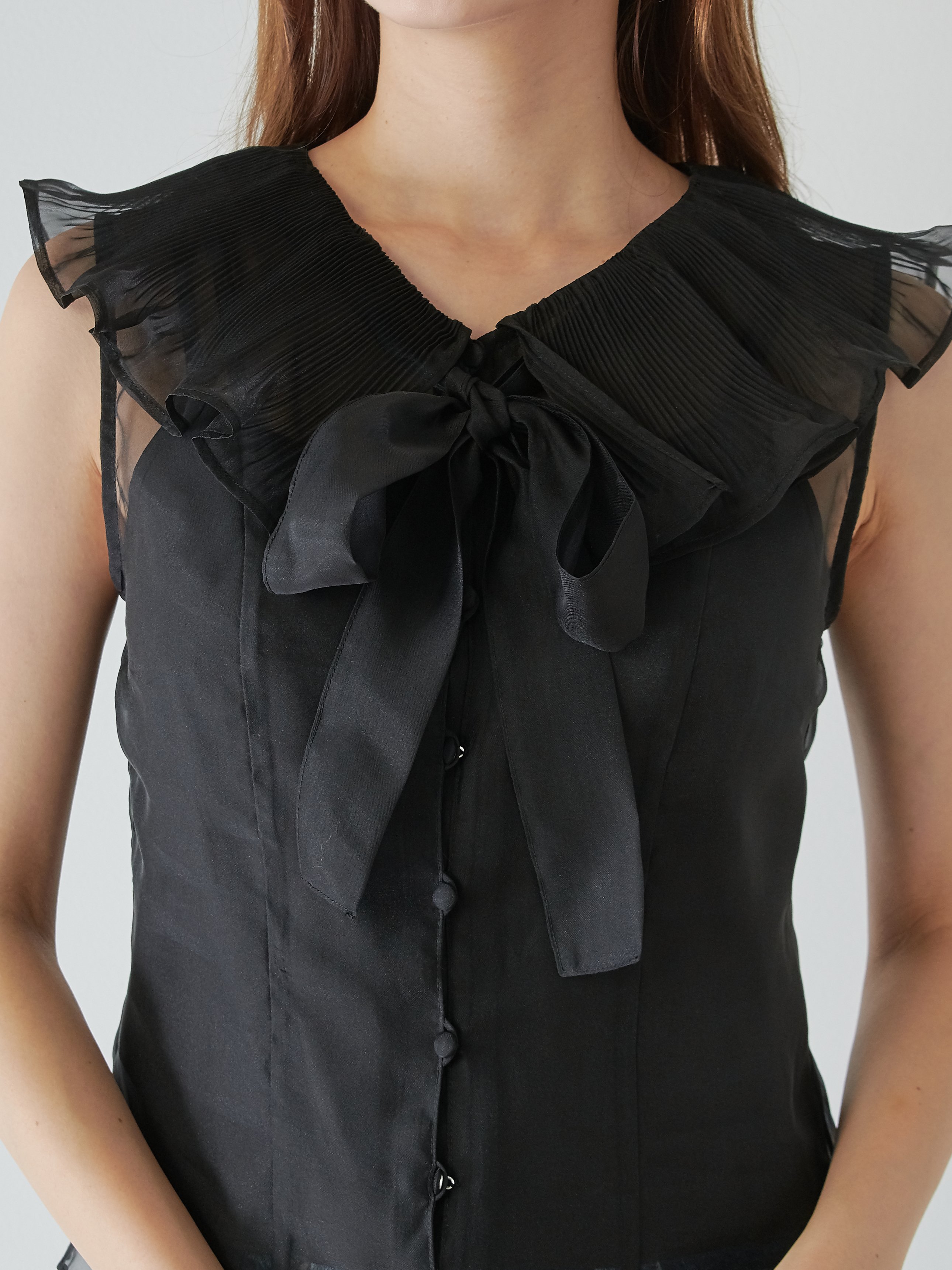 【細緻百褶大領片設計無袖透膚感襯衫】