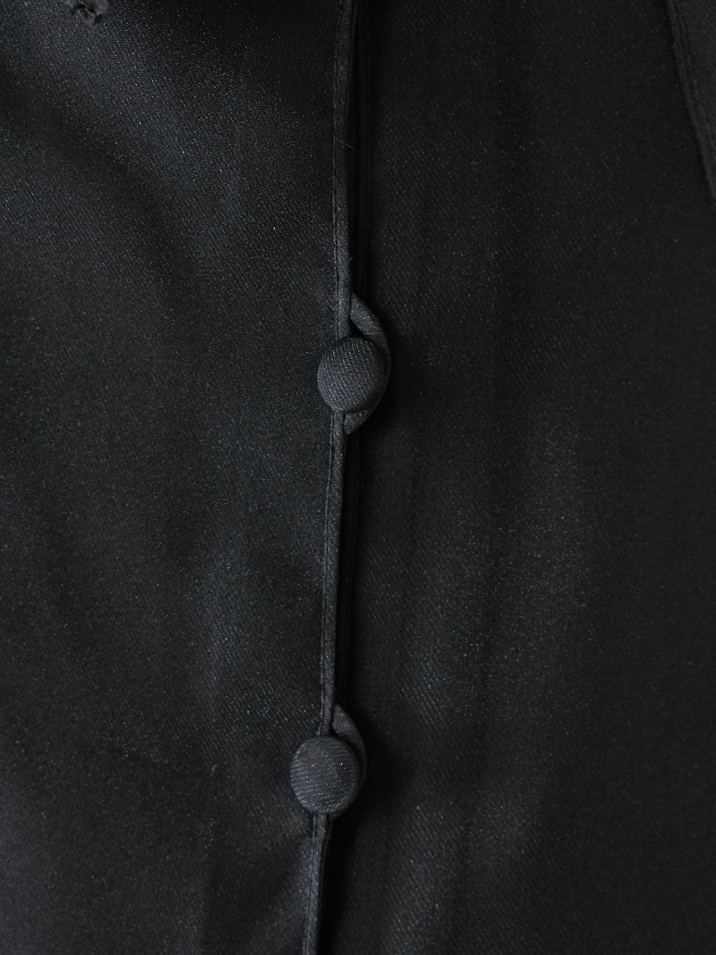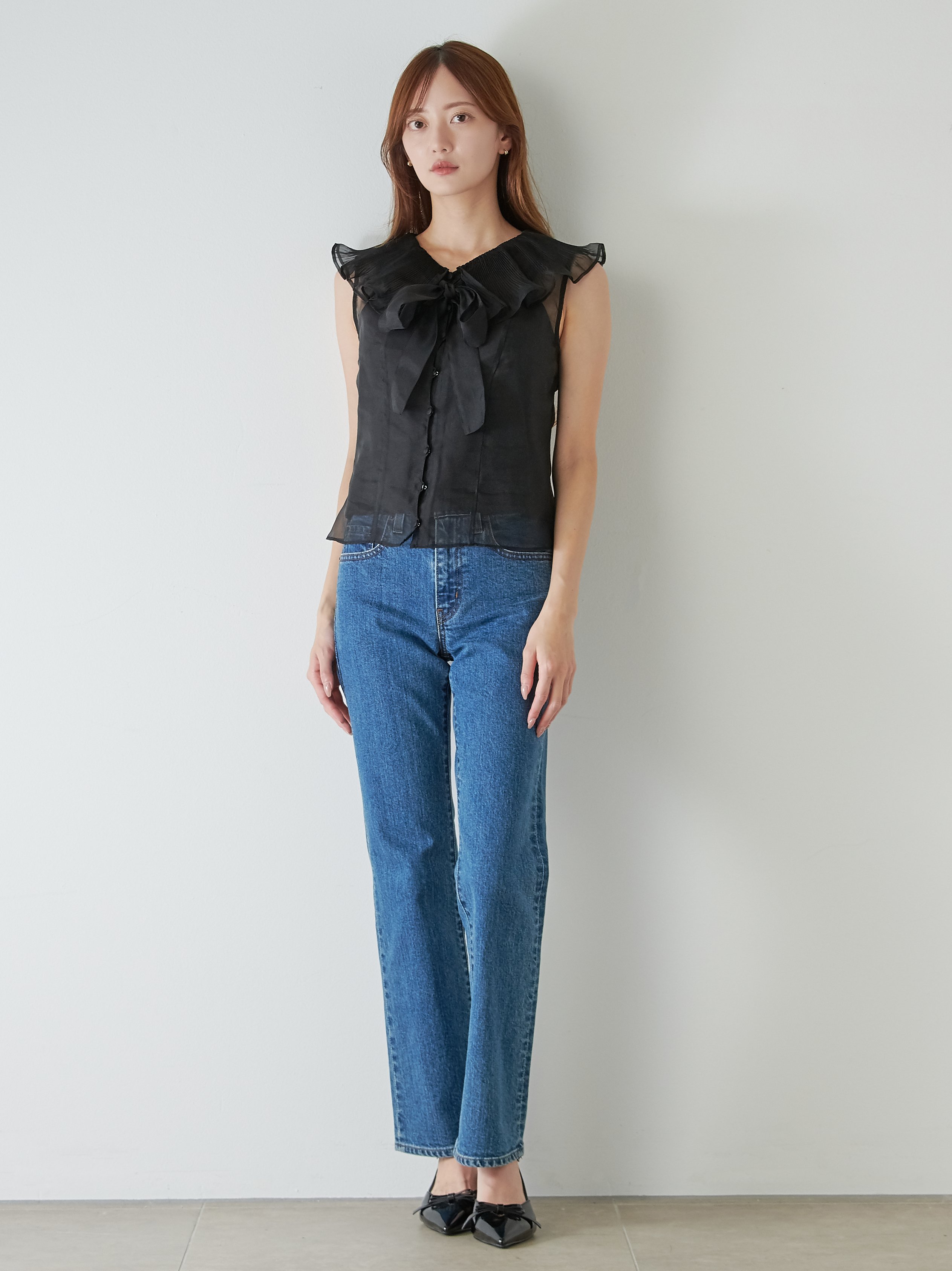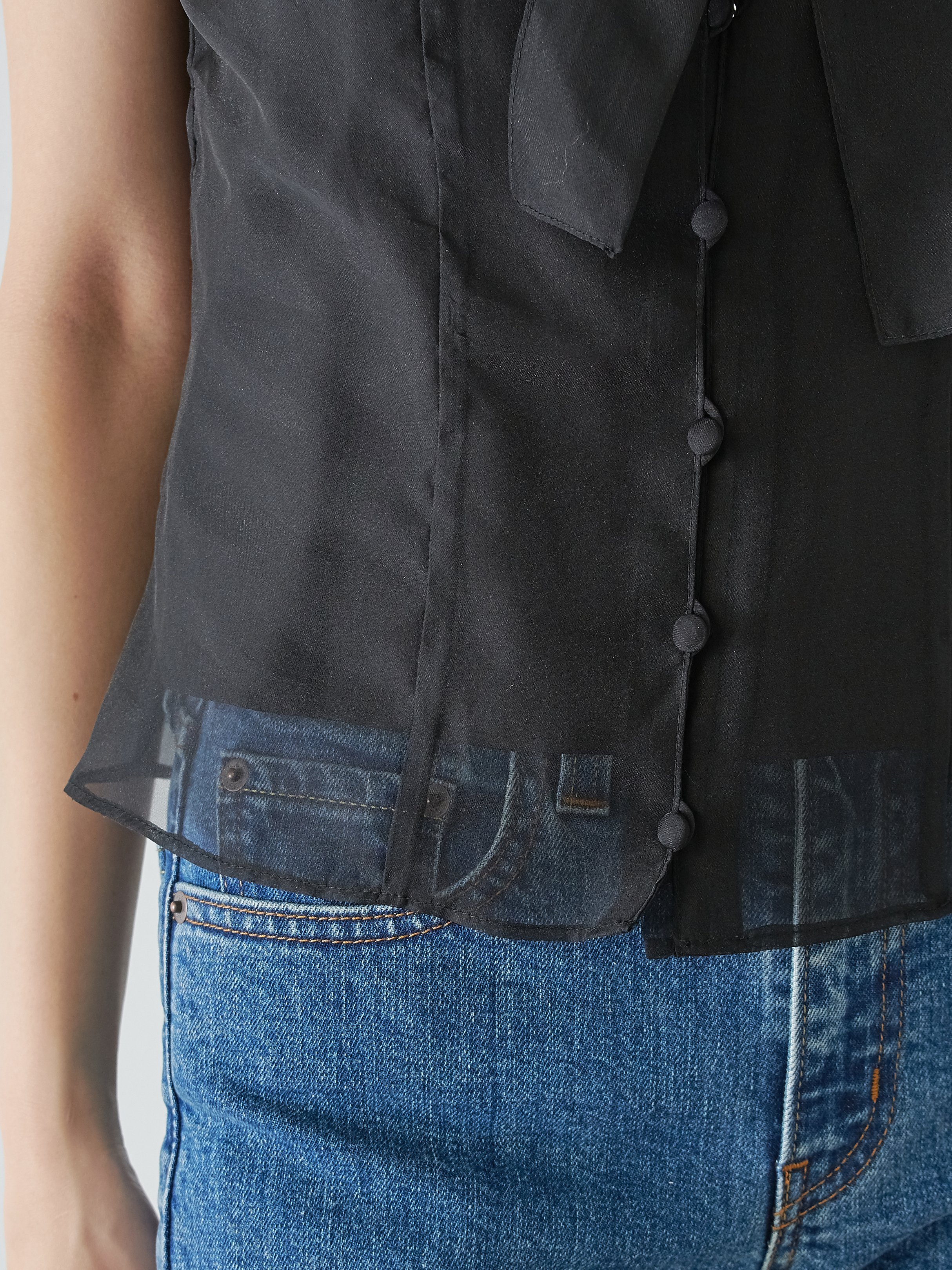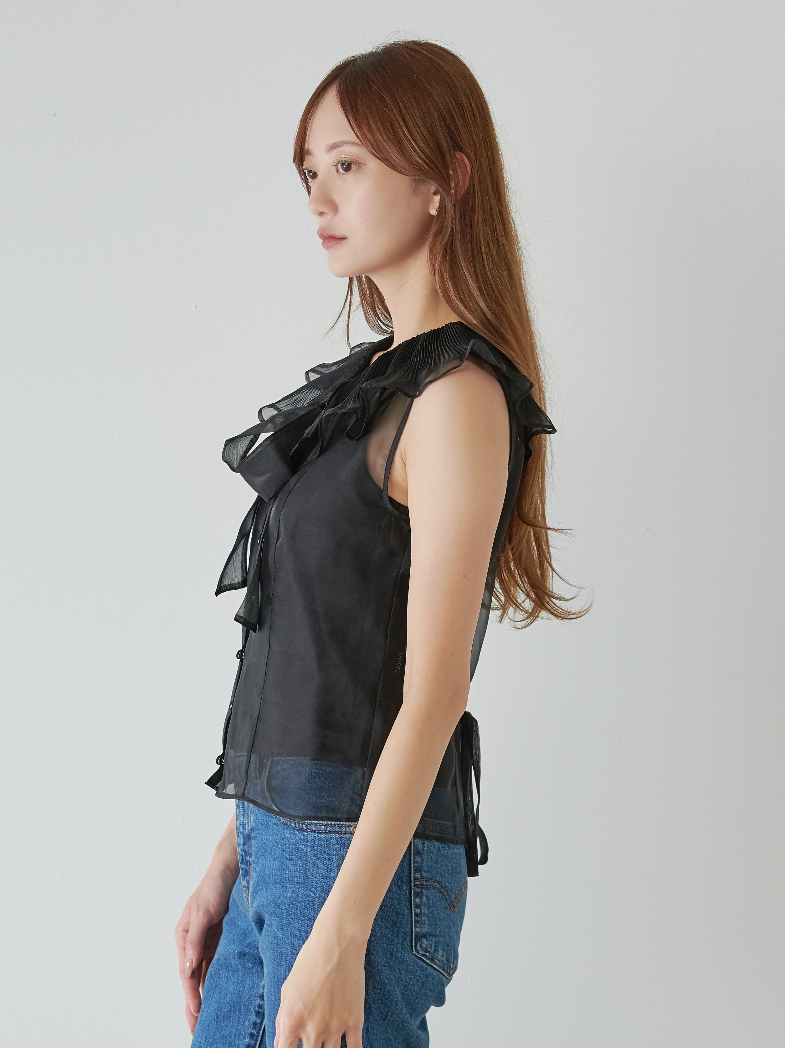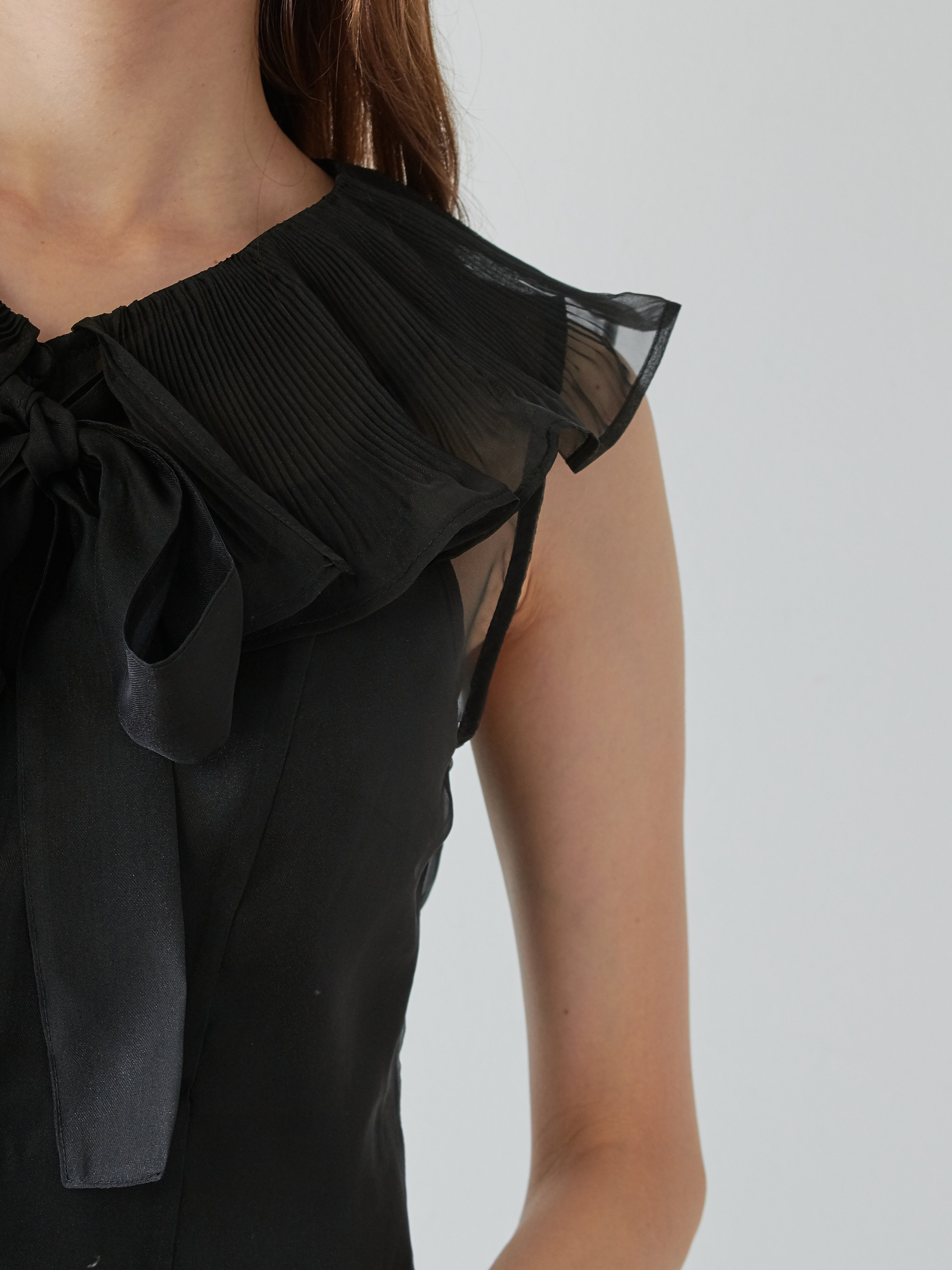 光澤感十足的輕盈透膚布料打造,領片採細緻百褶設計,展現華麗氛圍。身身剪裁合身俐落,搭配蓬鬆的大領片,既有存在感也能巧妙修飾肩臂線條。領口以同布料蝴蝶結綁帶點綴,搭配包布釦增添精緻質感。背後附細緞帶,可調節版型並營造背影重點。