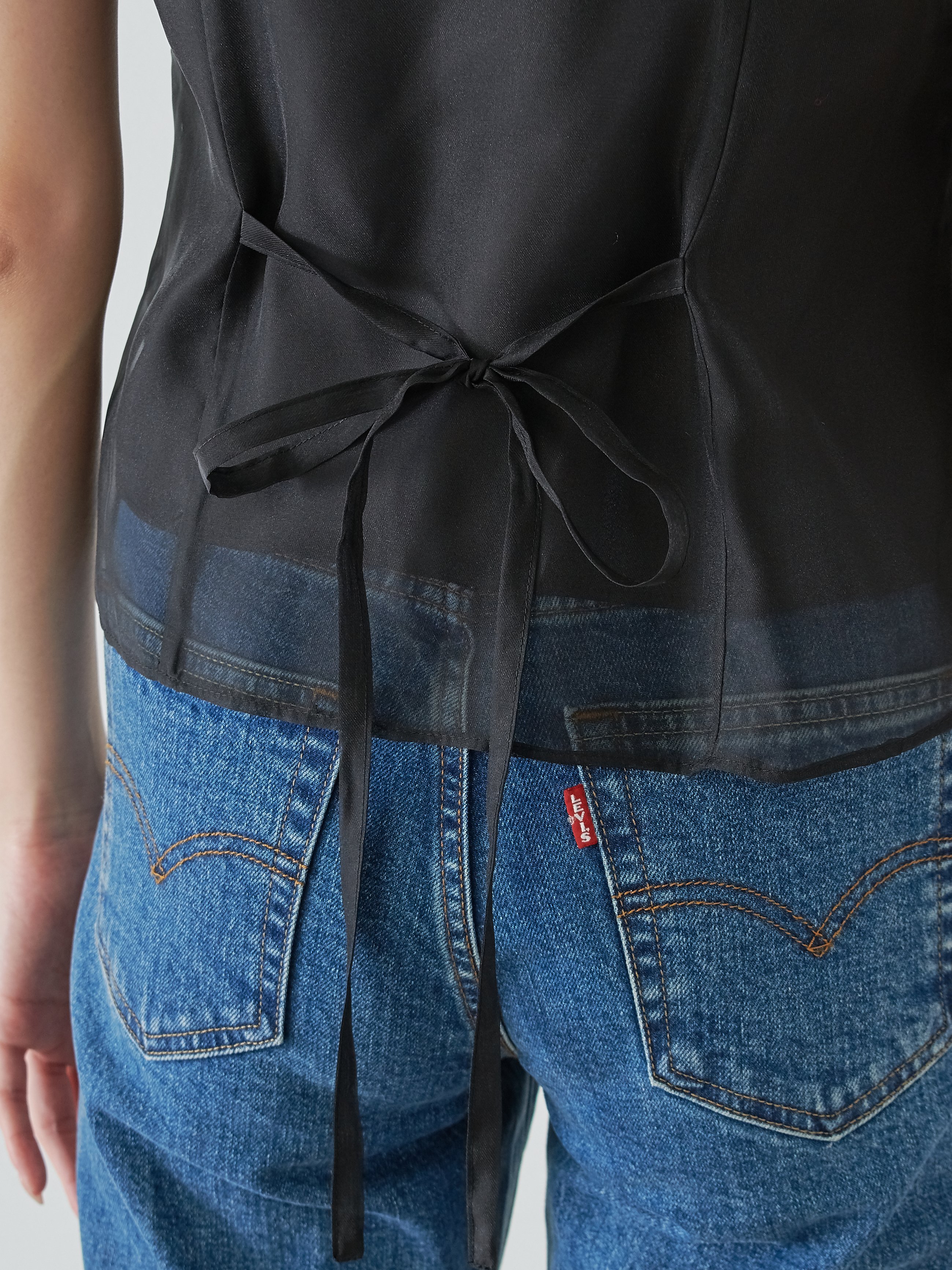 可單穿展現女性魅力,也能疊搭針織外套,或將百褶領片從西裝外套中露出,變換多樣穿搭。另可與同色系的絎縫針織外套(SWNT254243)搭配。雖為透膚材質,附內搭細肩帶背心,肩帶可調整長度,穿著安心。