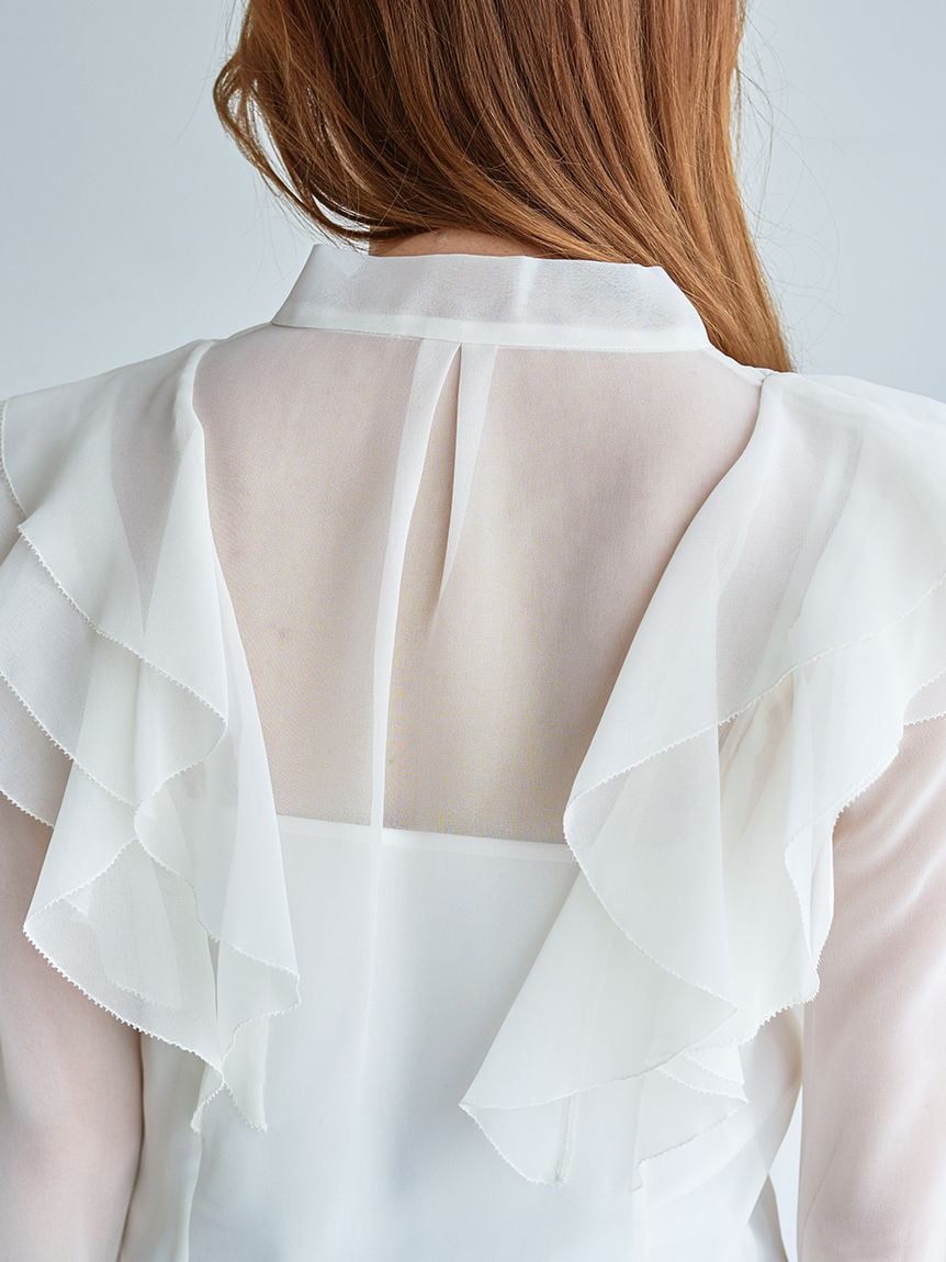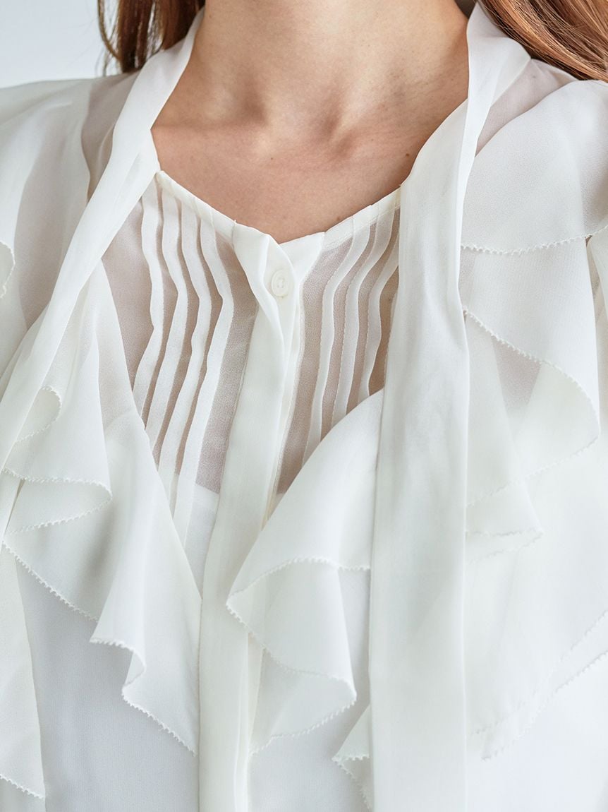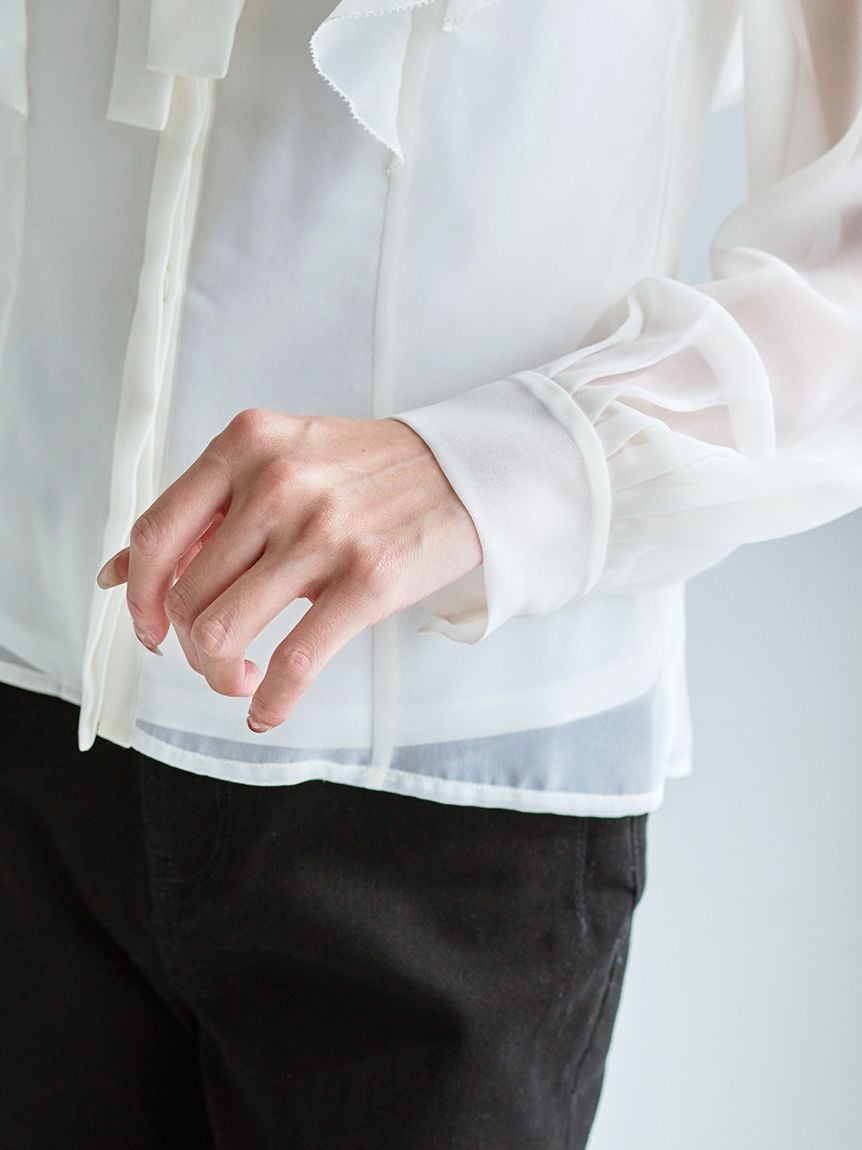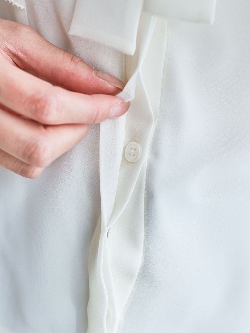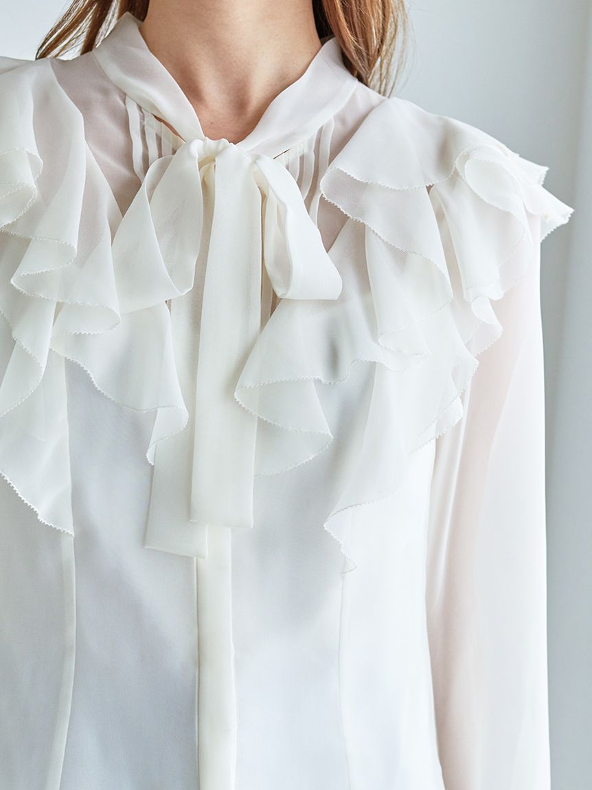 襯衫以豐富荷葉邊與經典蝴蝶結點綴,散發精緻氣息。蝴蝶結固定於衣身,不易移位,穿著安心。