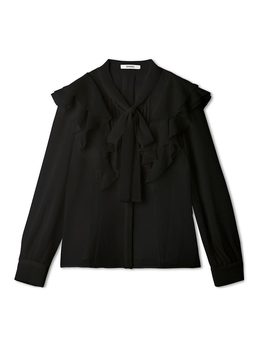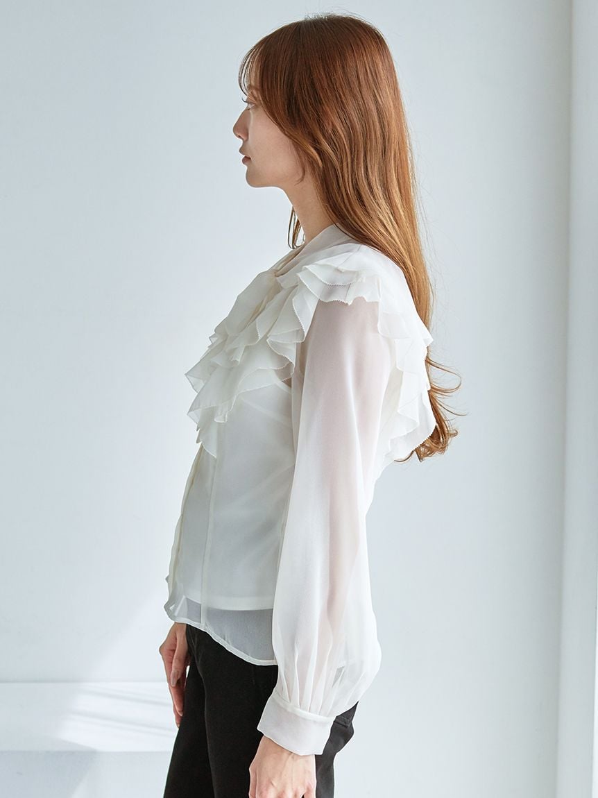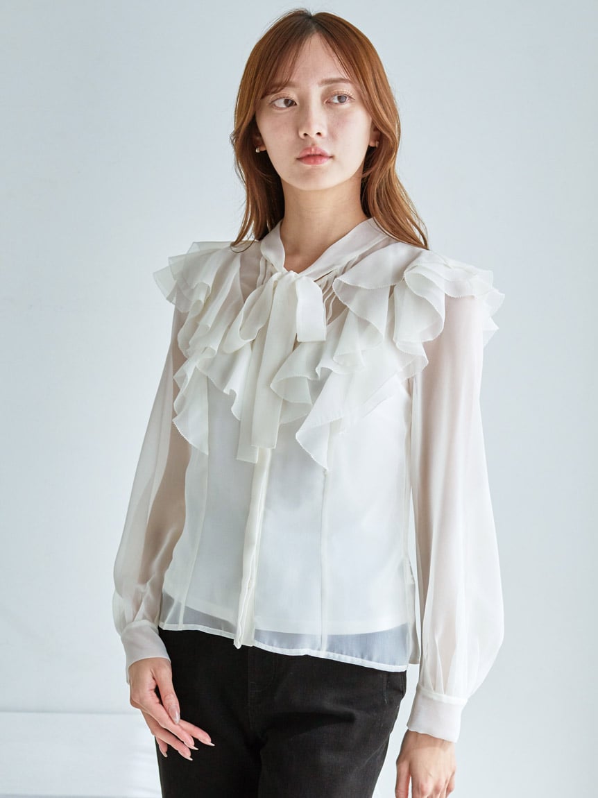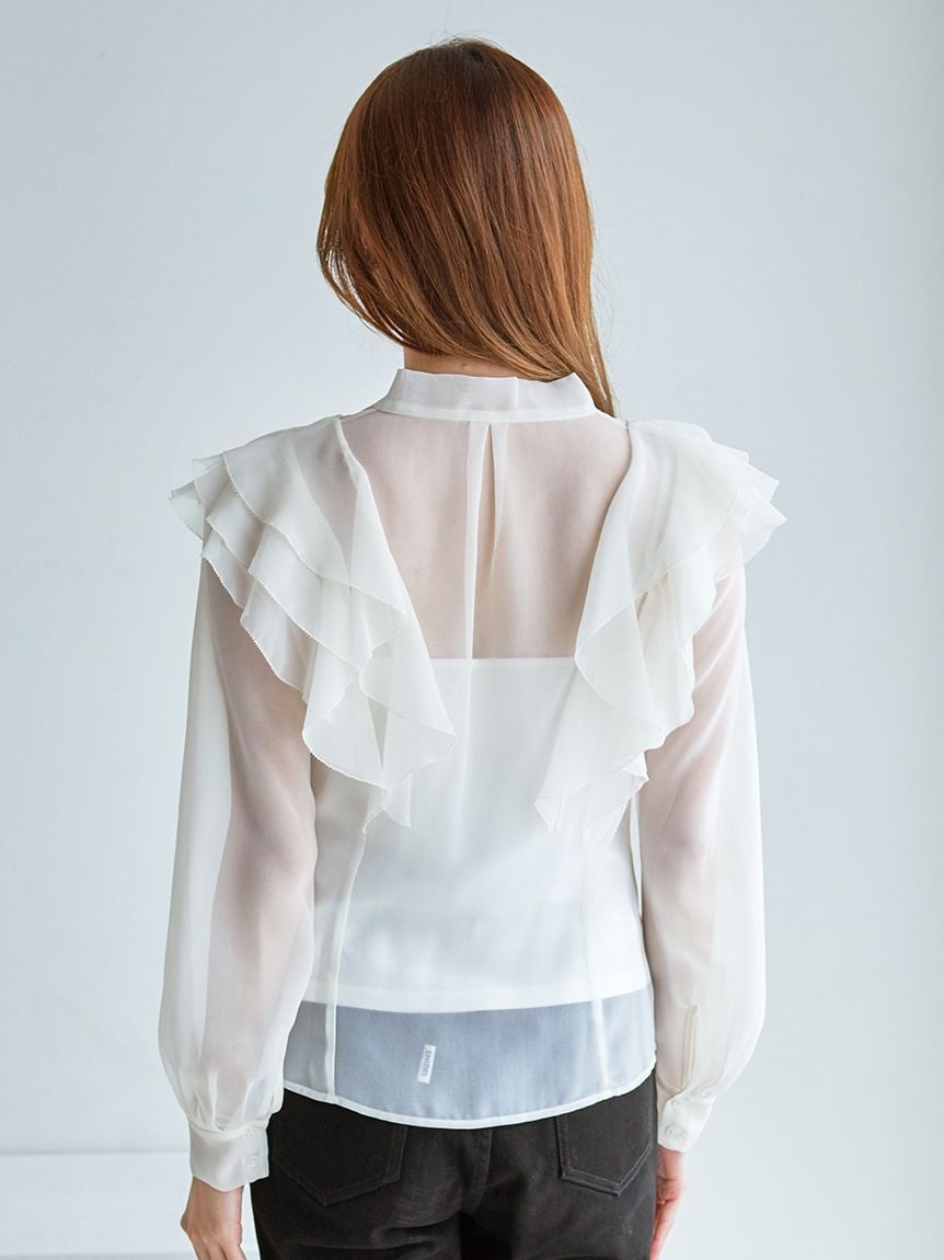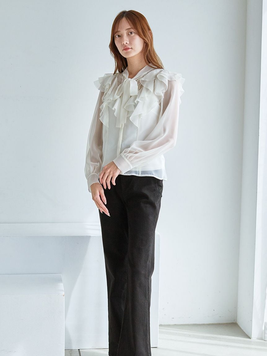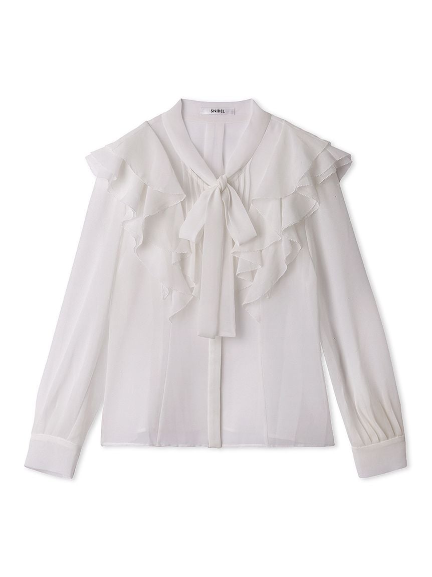 襯衫以豐富荷葉邊與經典蝴蝶結點綴,散發精緻氣息。蝴蝶結固定於衣身,不易移位,穿著安心。