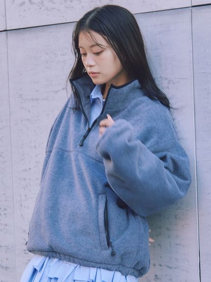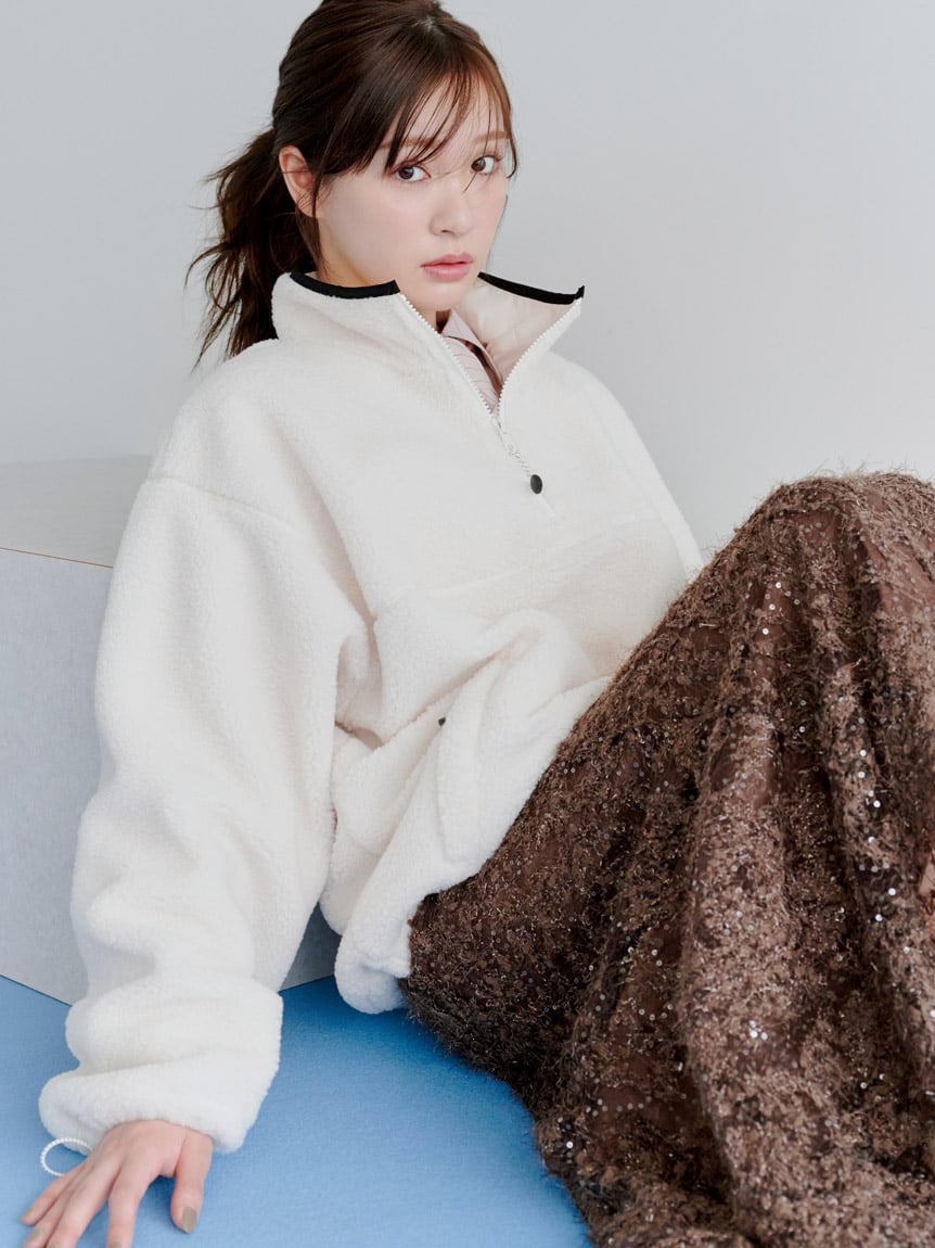 以柔軟蓬鬆的羊羔絨與輕暖刷毛材質結合,注入休閒運動元素,打造本季焦點的半門襟拉鍊上衣。前襟採半開式拉鍊設計,穿脫便利,同時能依造型自由調整領口開度。胸前點綴品牌 SNIDEL 精緻刺繡,低調卻帶有識別度。
