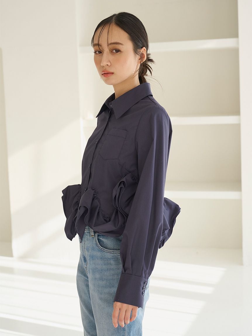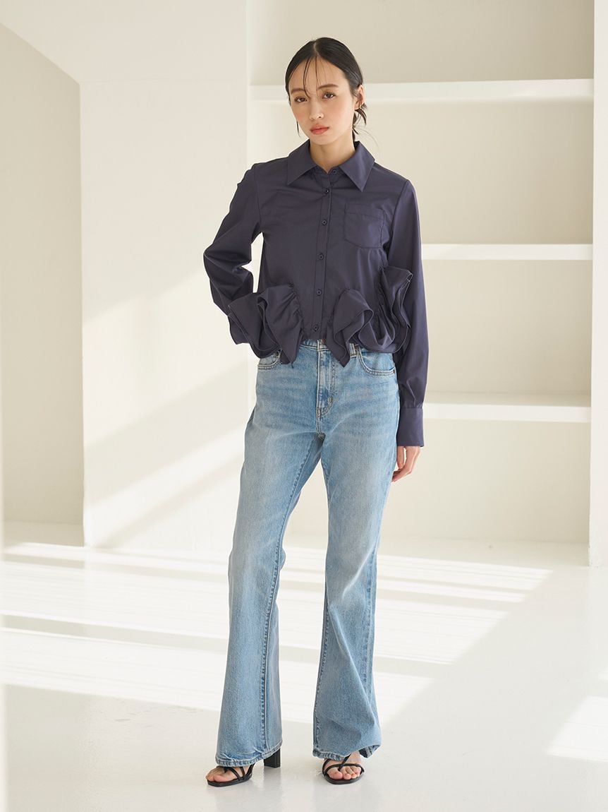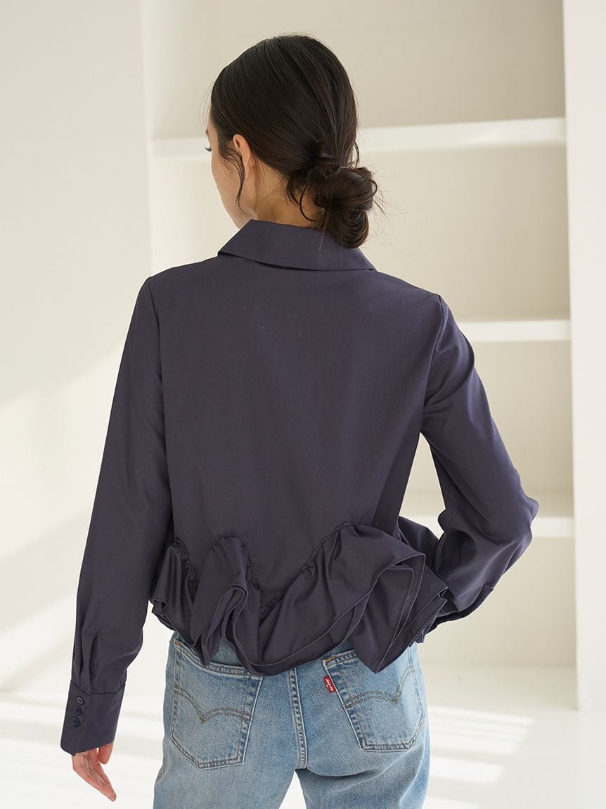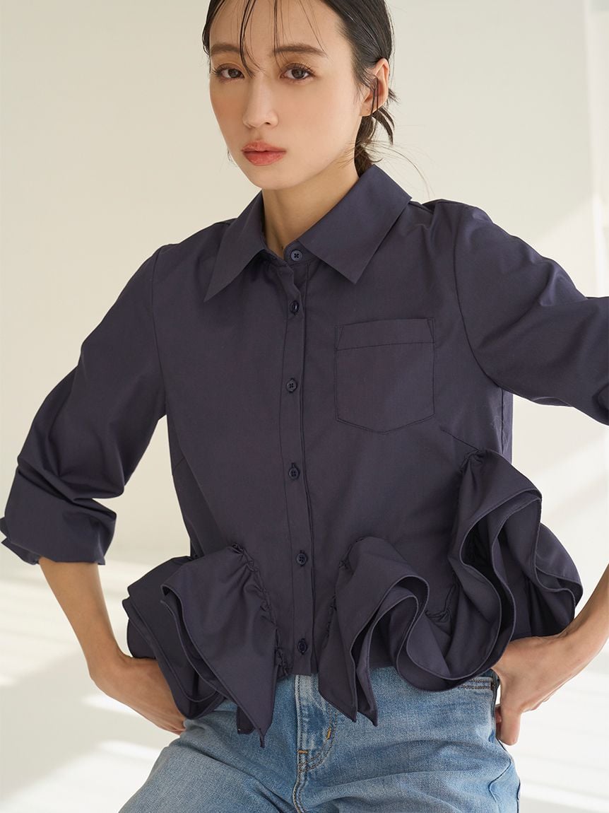 這款襯衫採用短版經典剪裁,下擺增添豐盈荷葉邊設計,成為穿搭焦點單品。