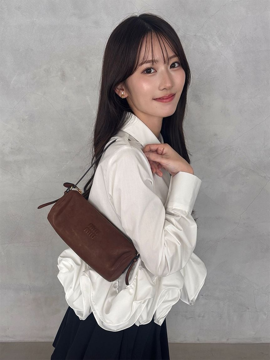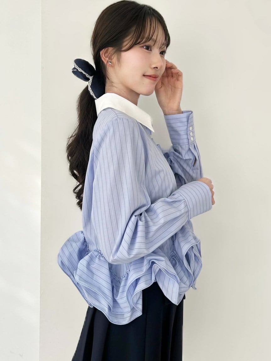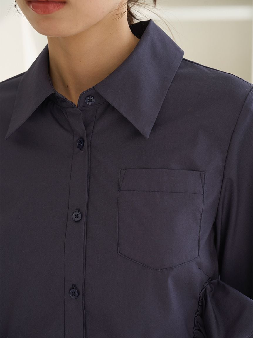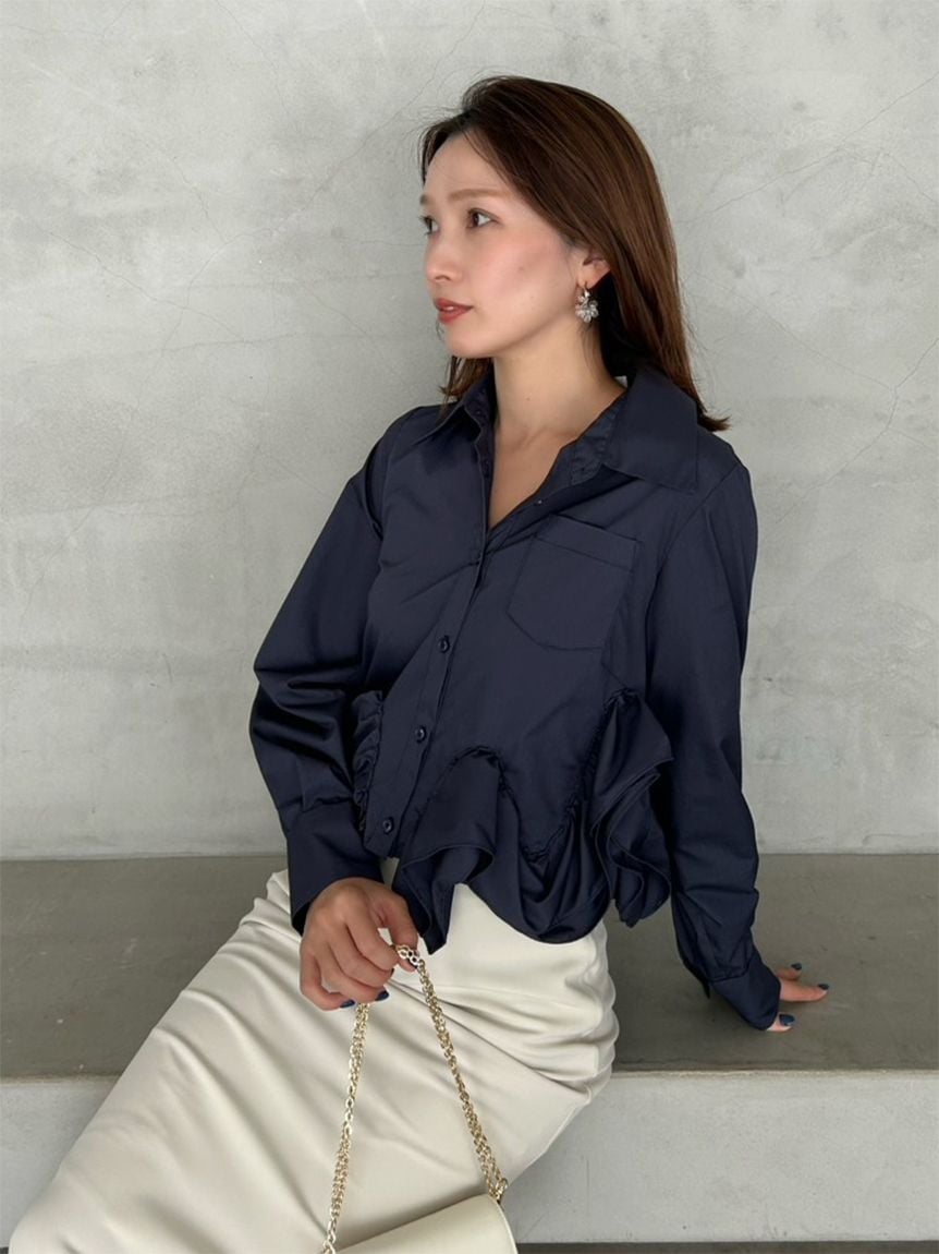 這款襯衫採用短版經典剪裁,下擺增添豐盈荷葉邊設計,成為穿搭焦點單品。