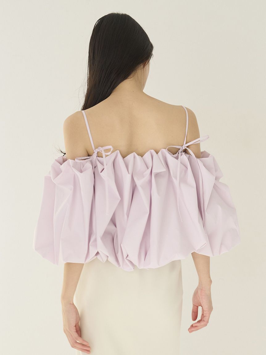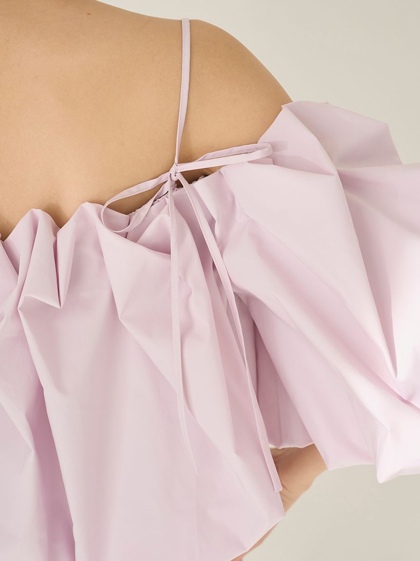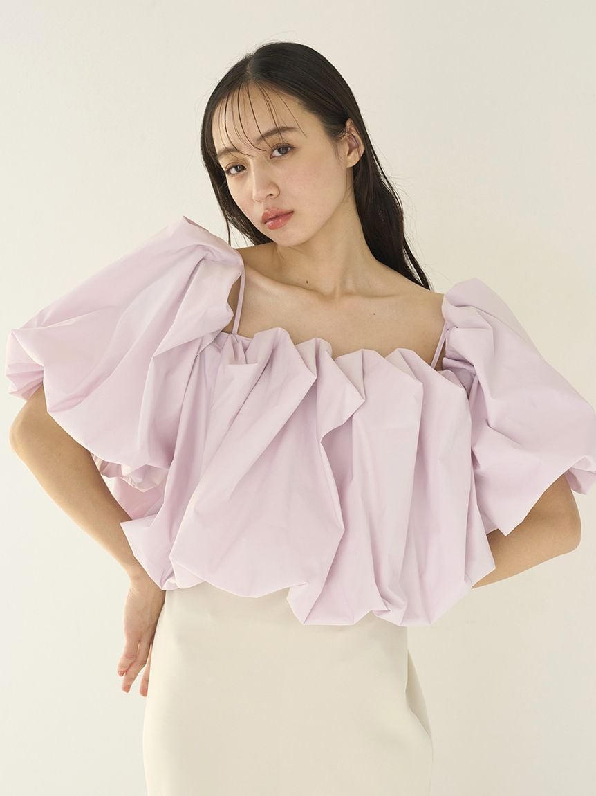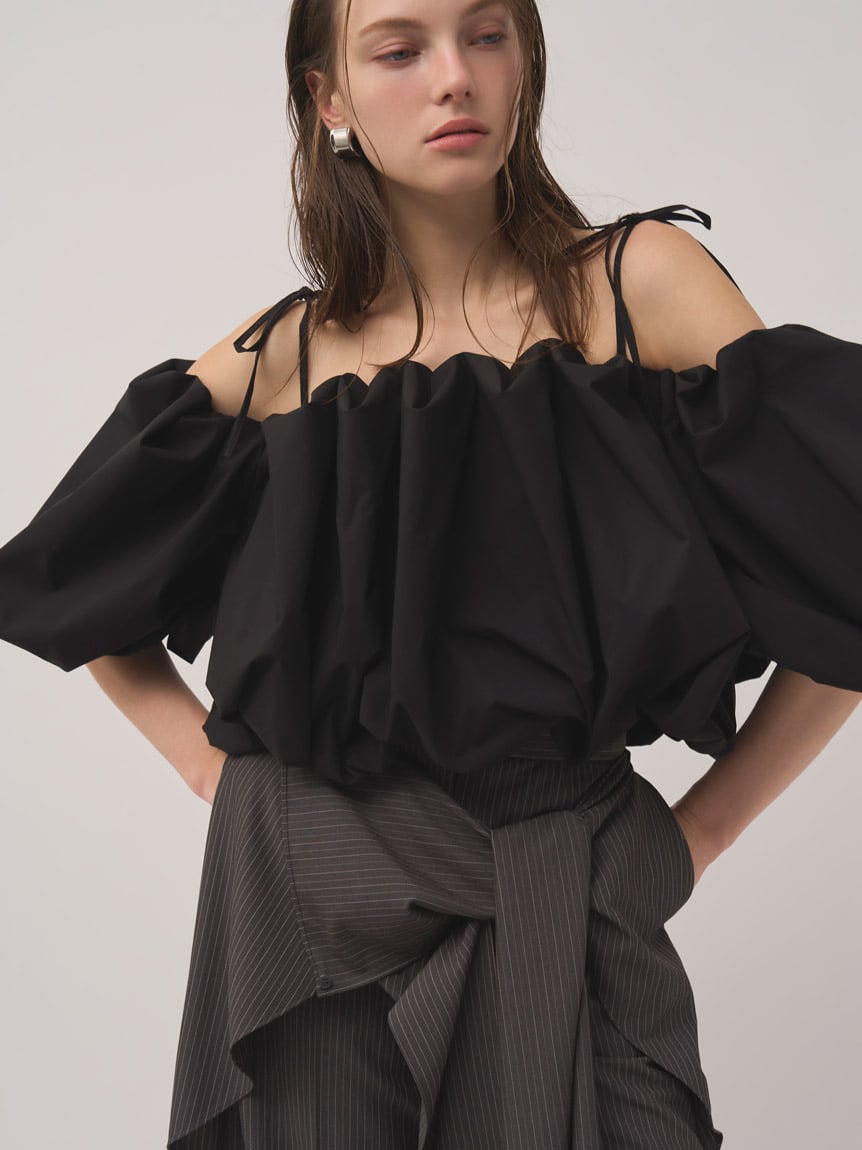 【以蓬鬆氣球輪廓的短版露肩打摺上衣,打造本季流行感】
