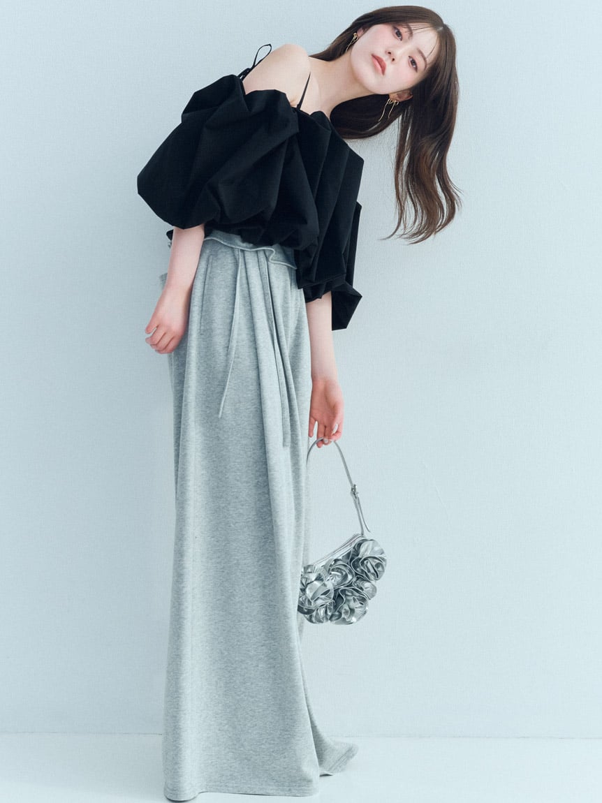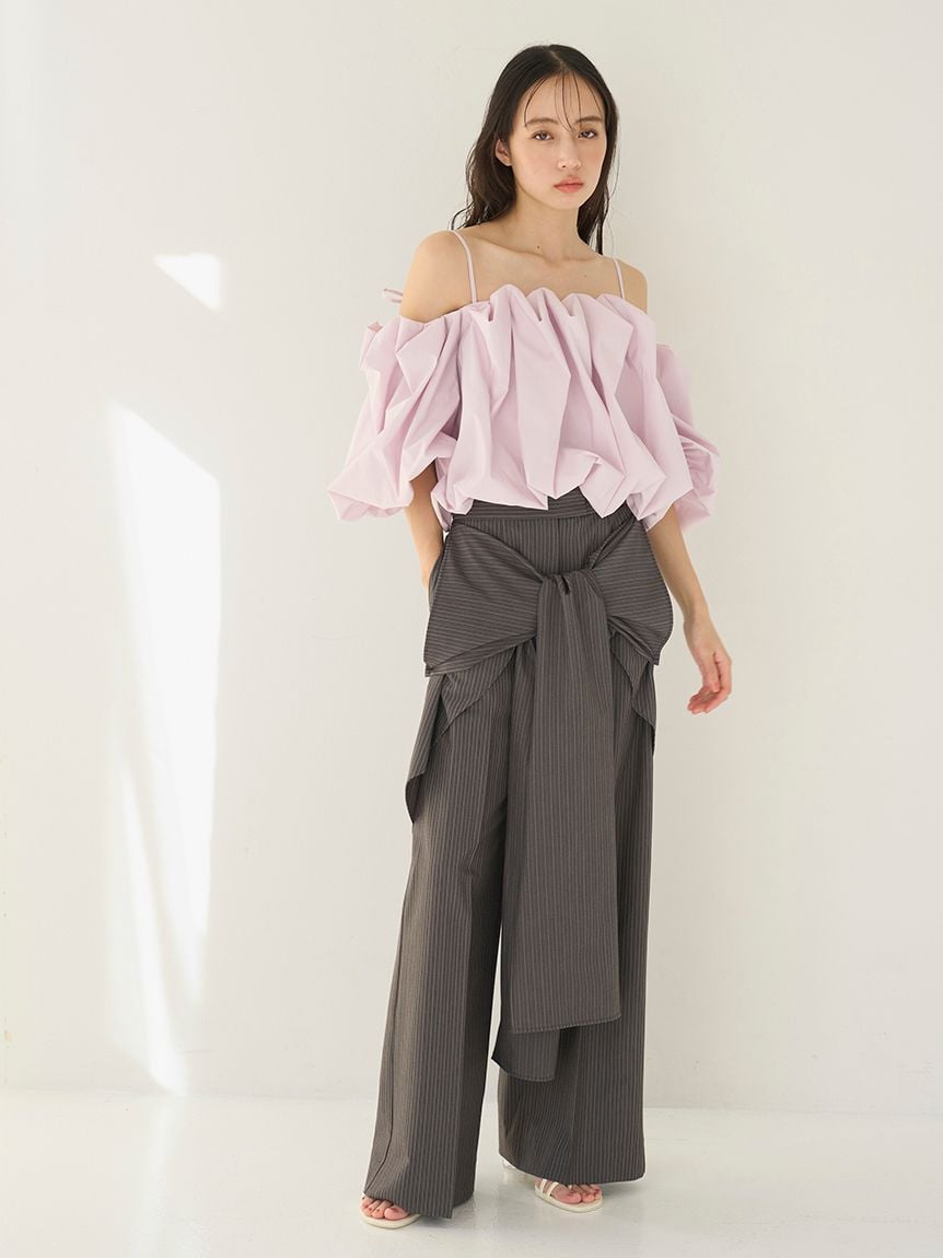 展現本季氛圍的份量感設計,是一款露肩打摺上衣。