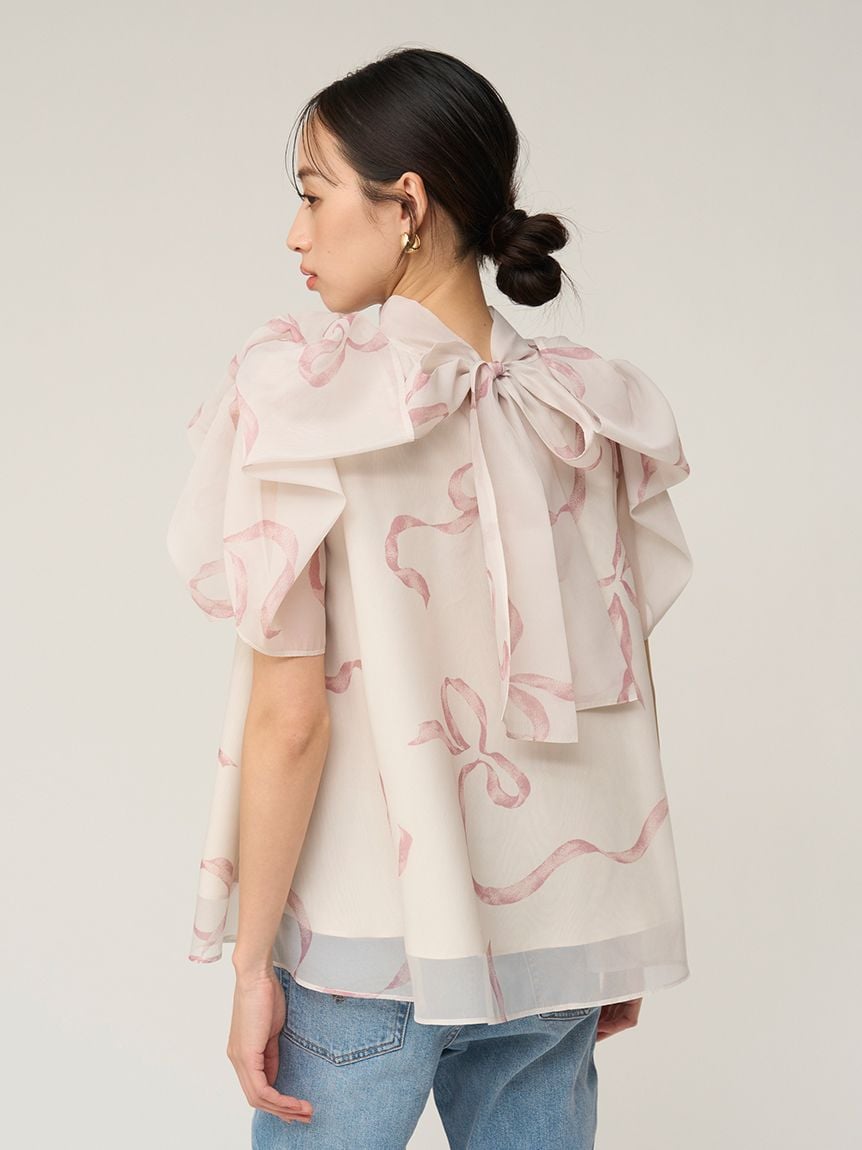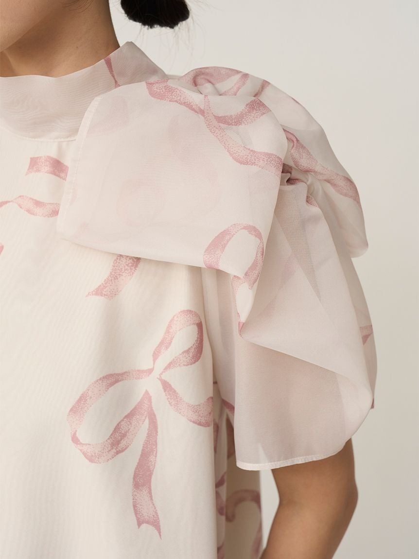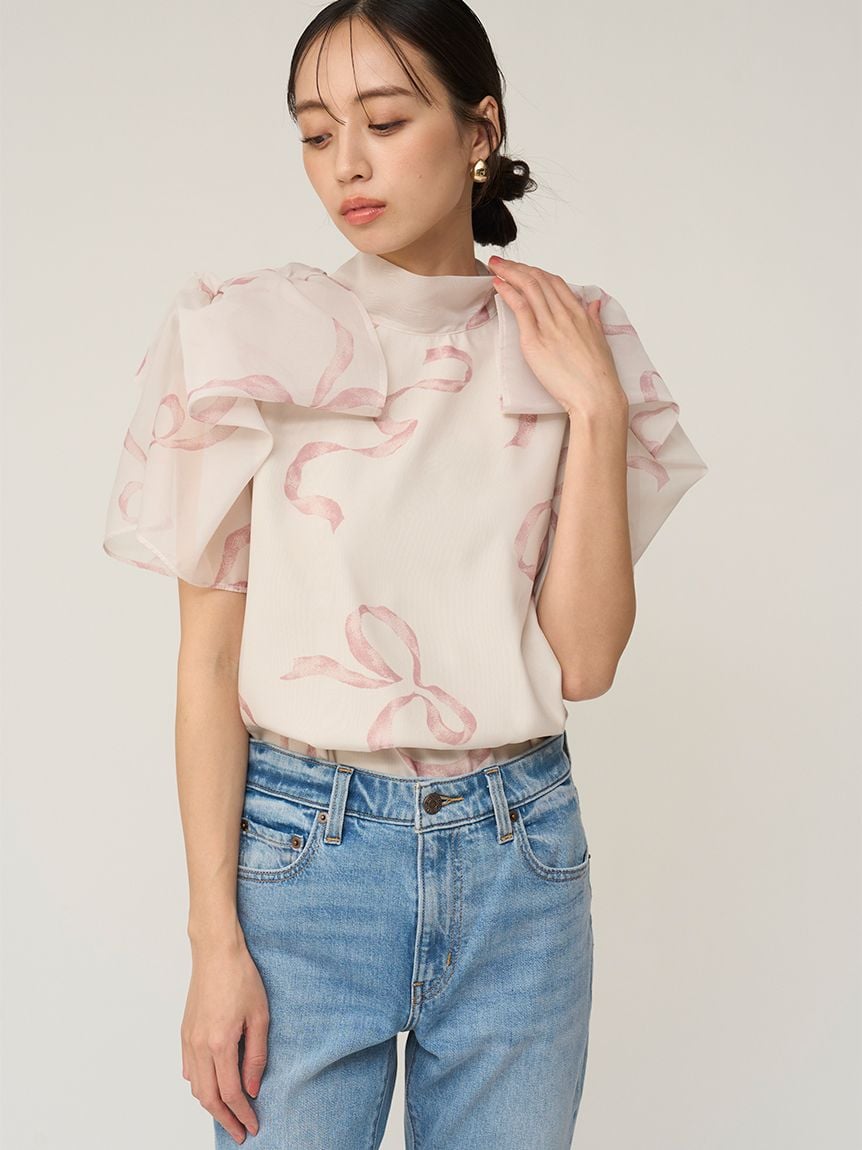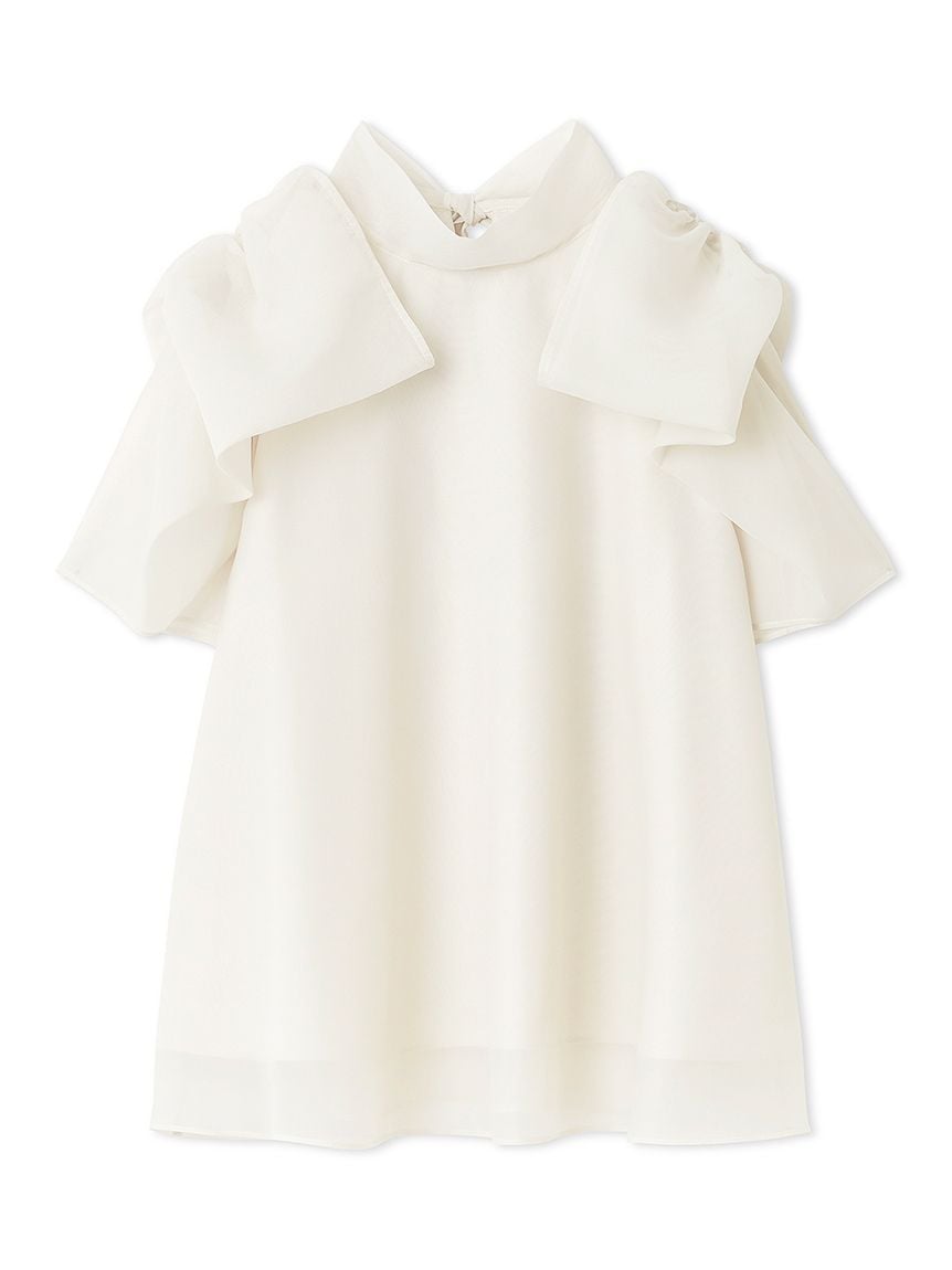 【蓬鬆立體蝴蝶結風袖設計,展現柔美華麗感的人氣歐根紗透膚上衣】