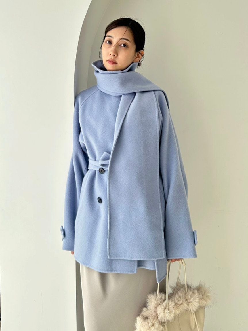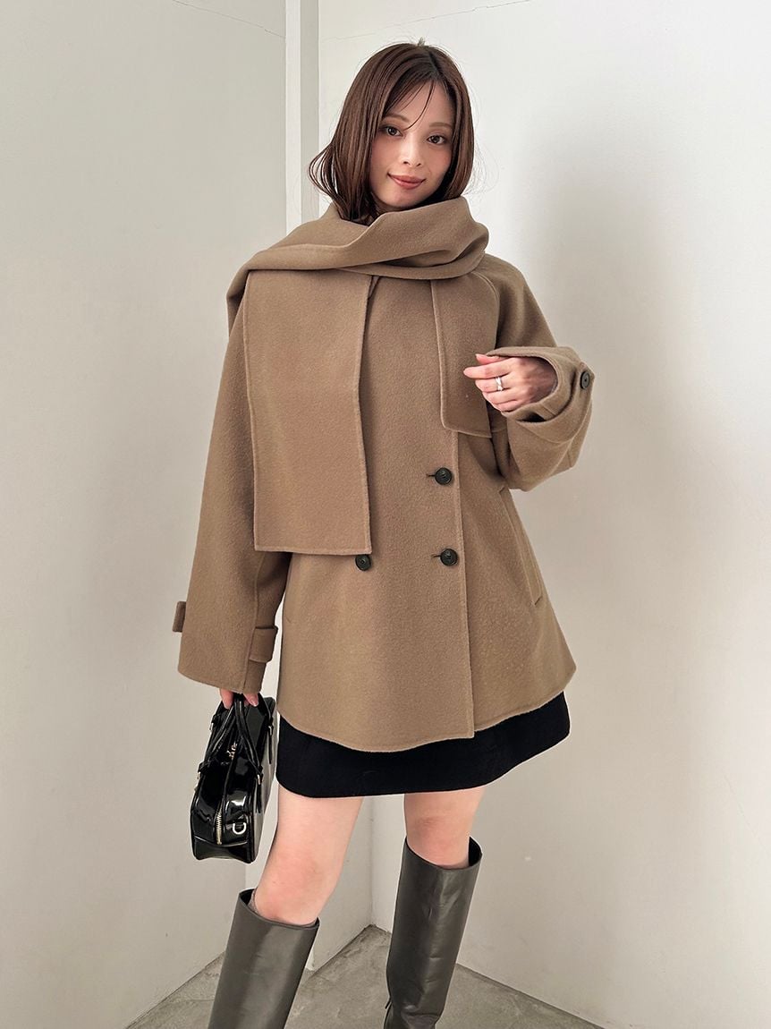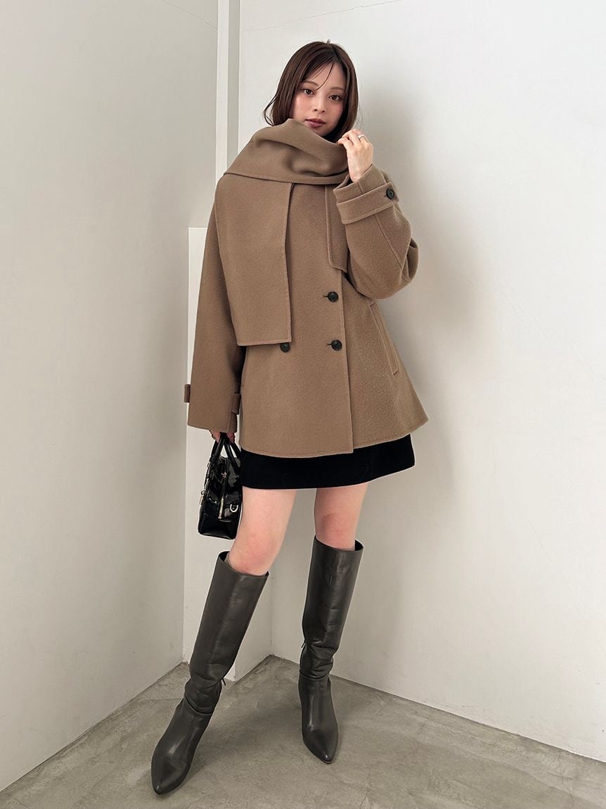 以本季趨勢的中長版立領外套為基礎,搭配同素材打造的柔軟圍巾,呈現高級感十足的外套組合。