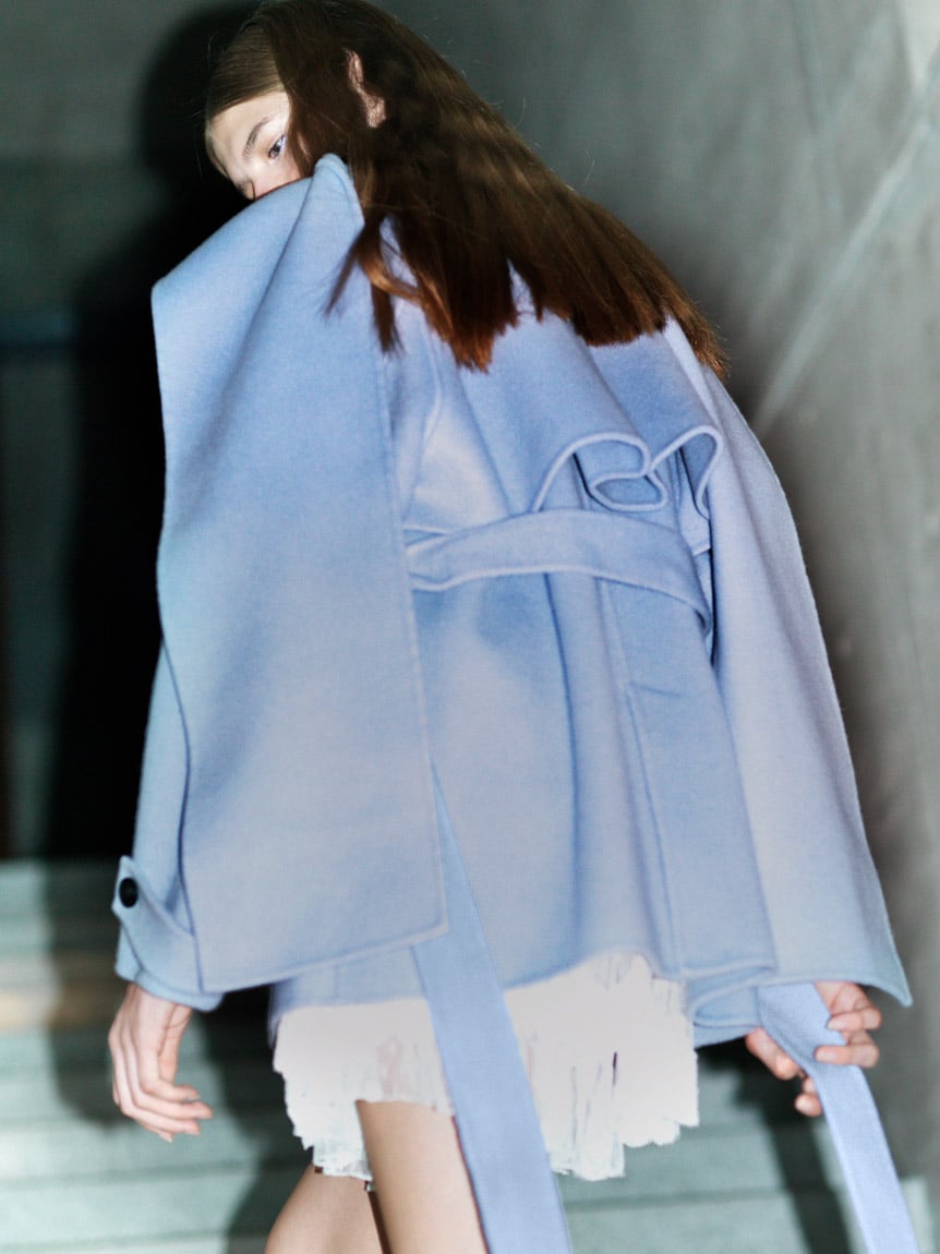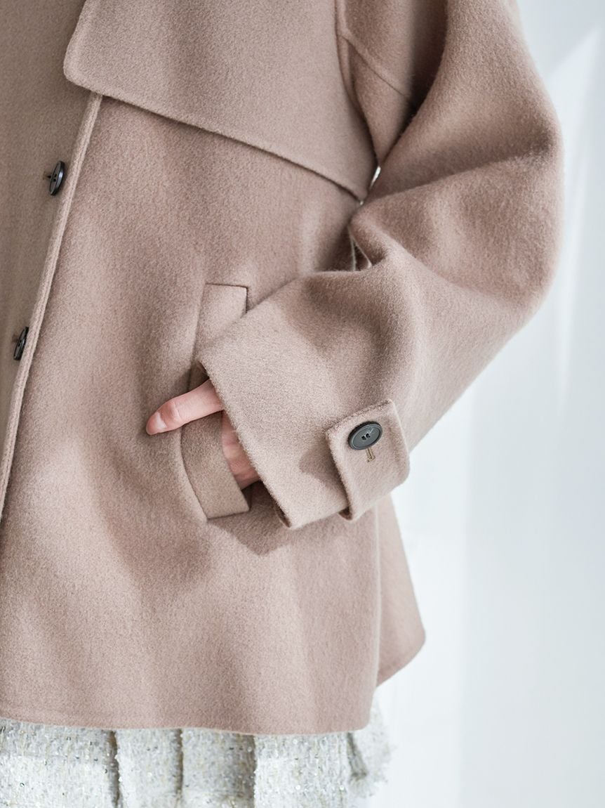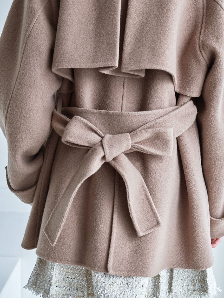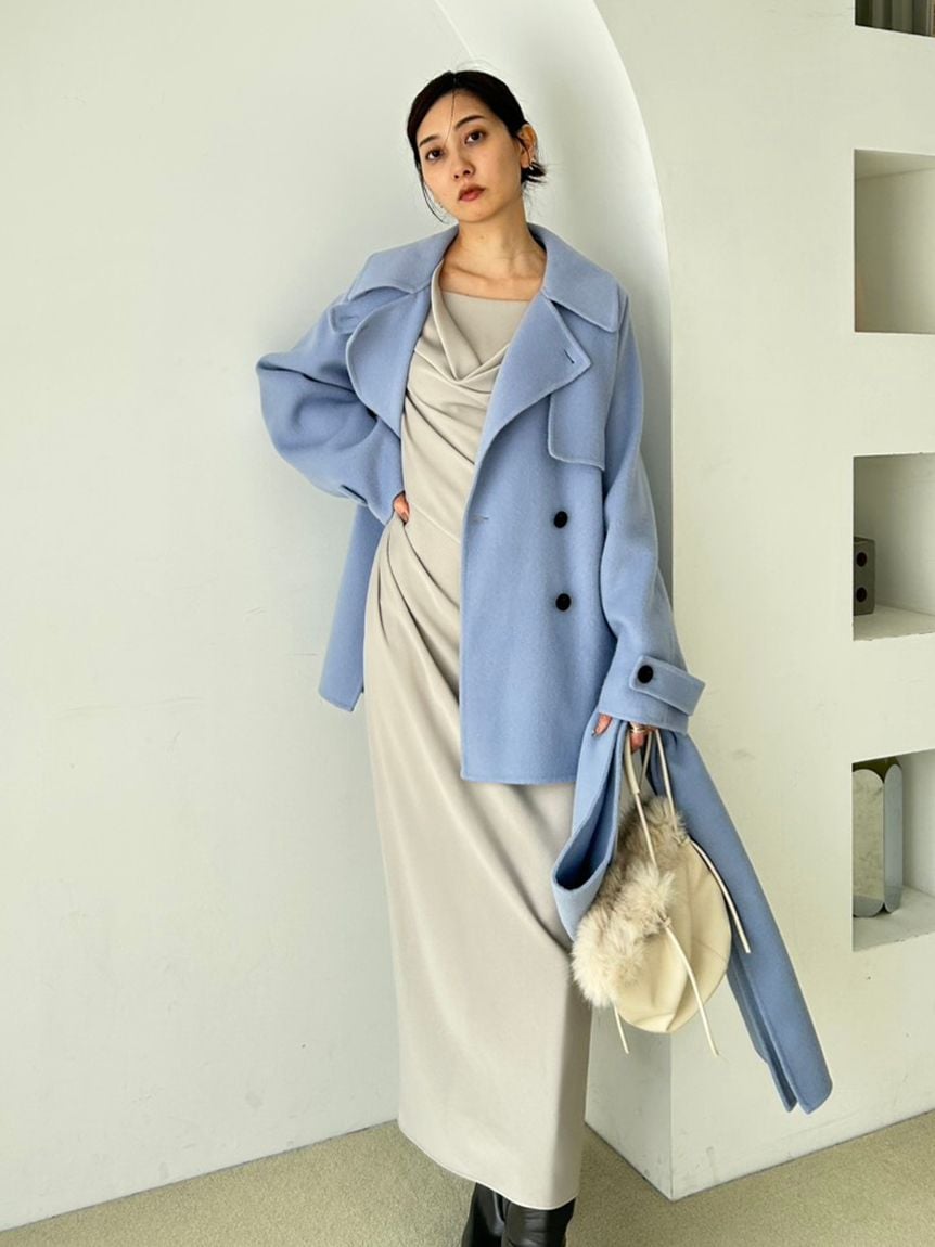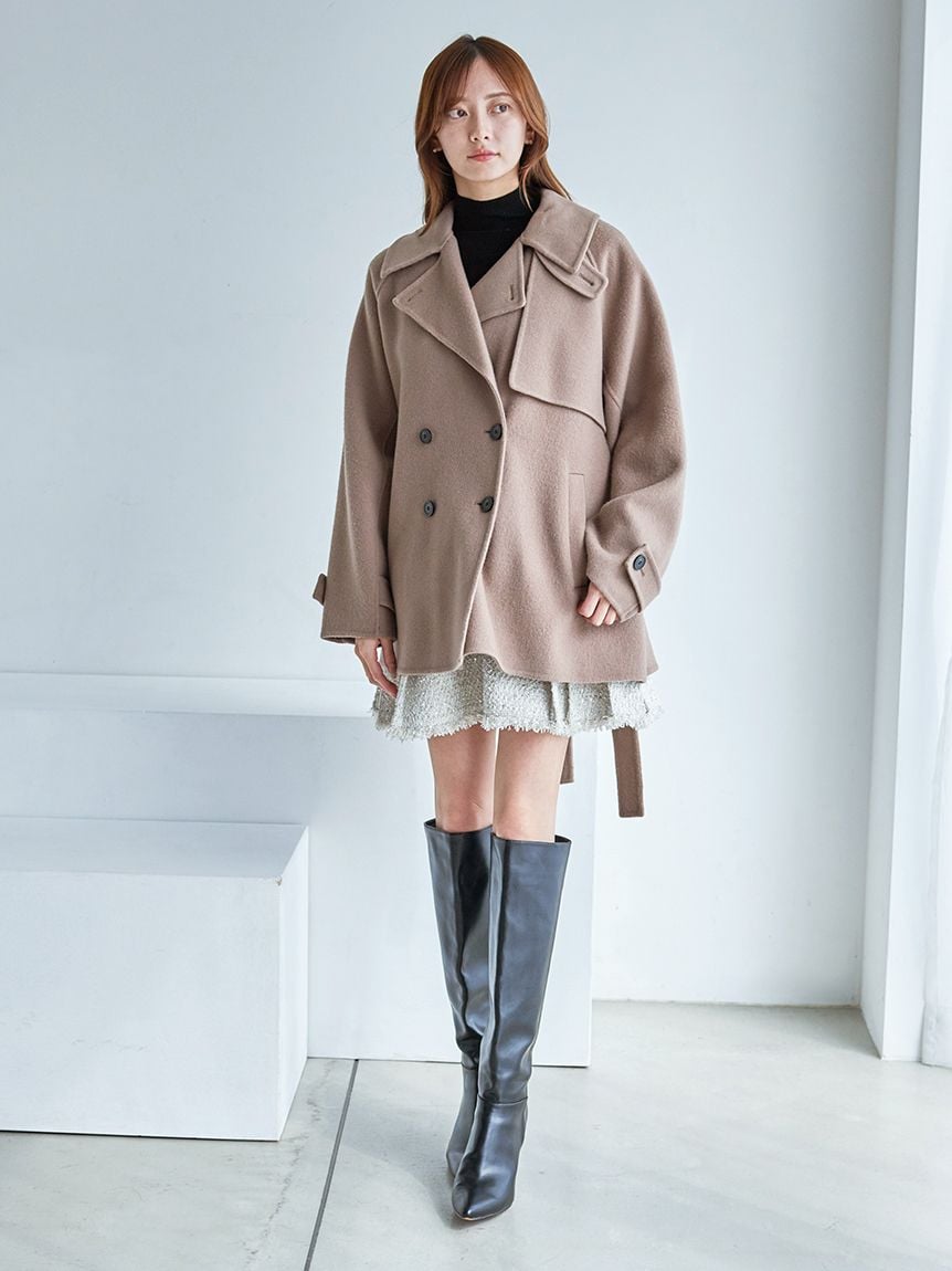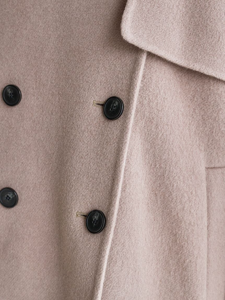 外套採用經典雙排釦設計,輪廓雋永耐看。略為放大的領型,即使不立起穿著,也能為臉部線條增添華麗度。