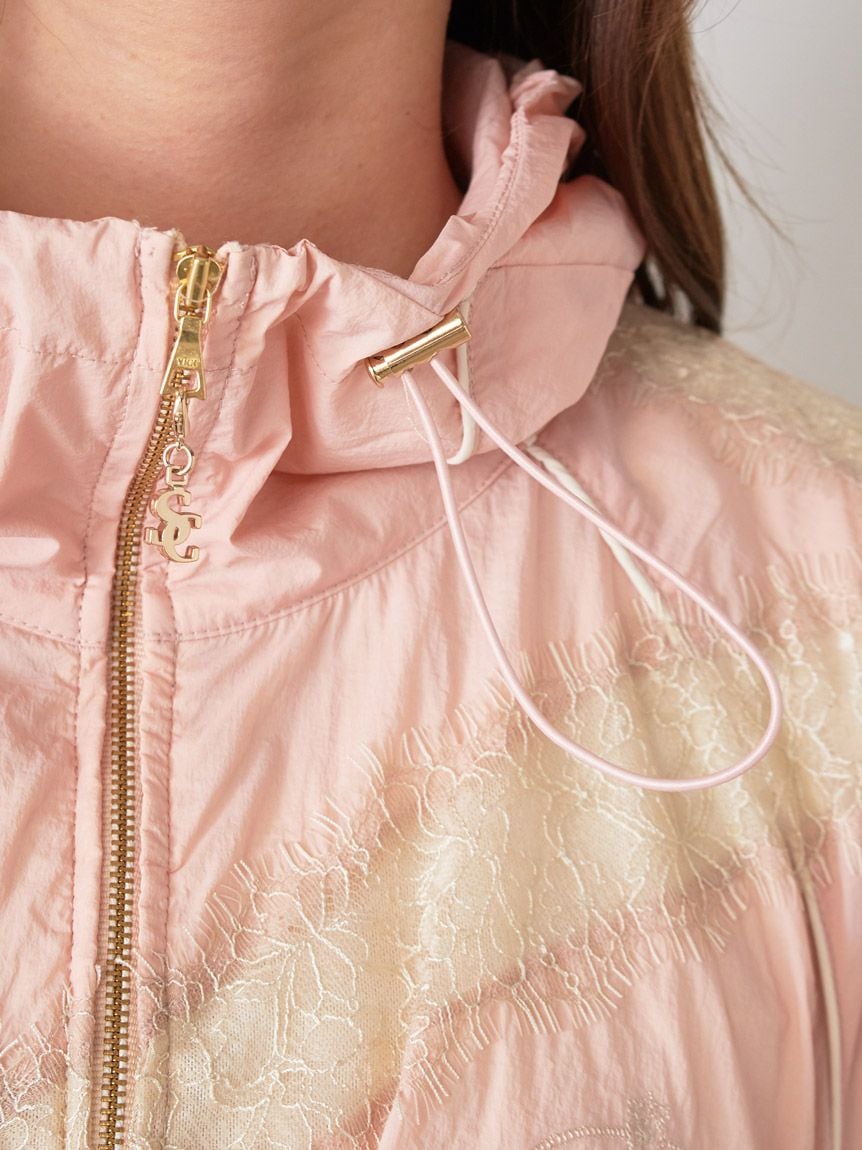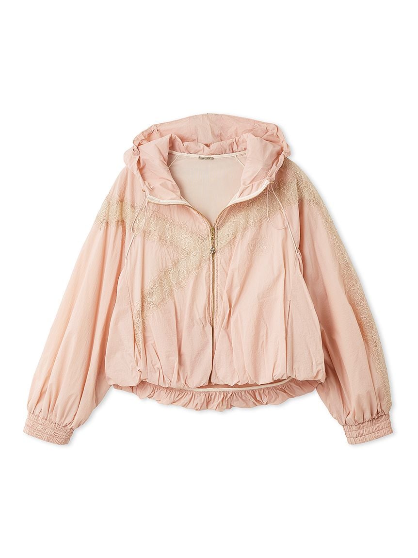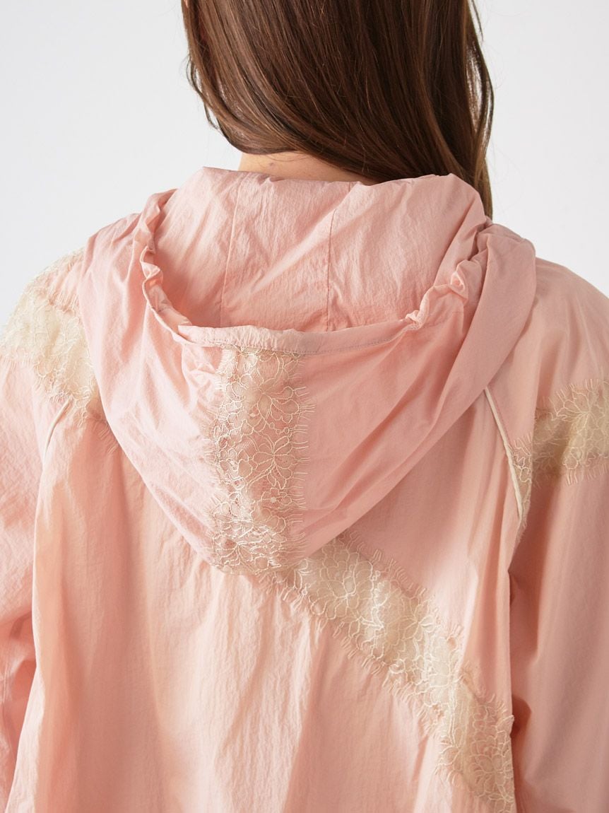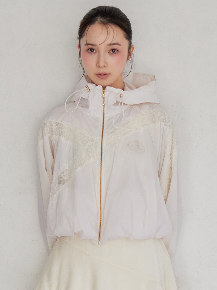 以春夏氛圍的柔和配色,結合不規則拼接的蕾絲細節,打造吸睛的連帽尼龍蕾絲外套。