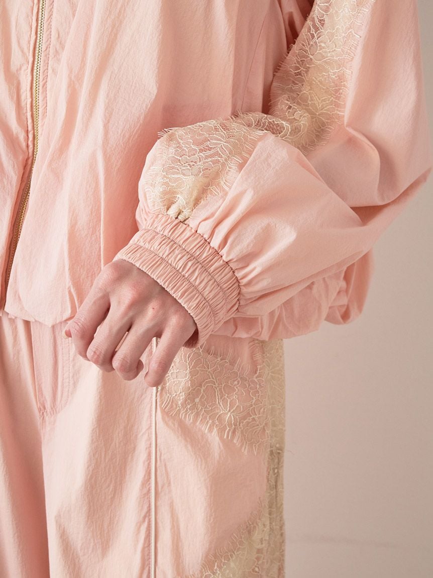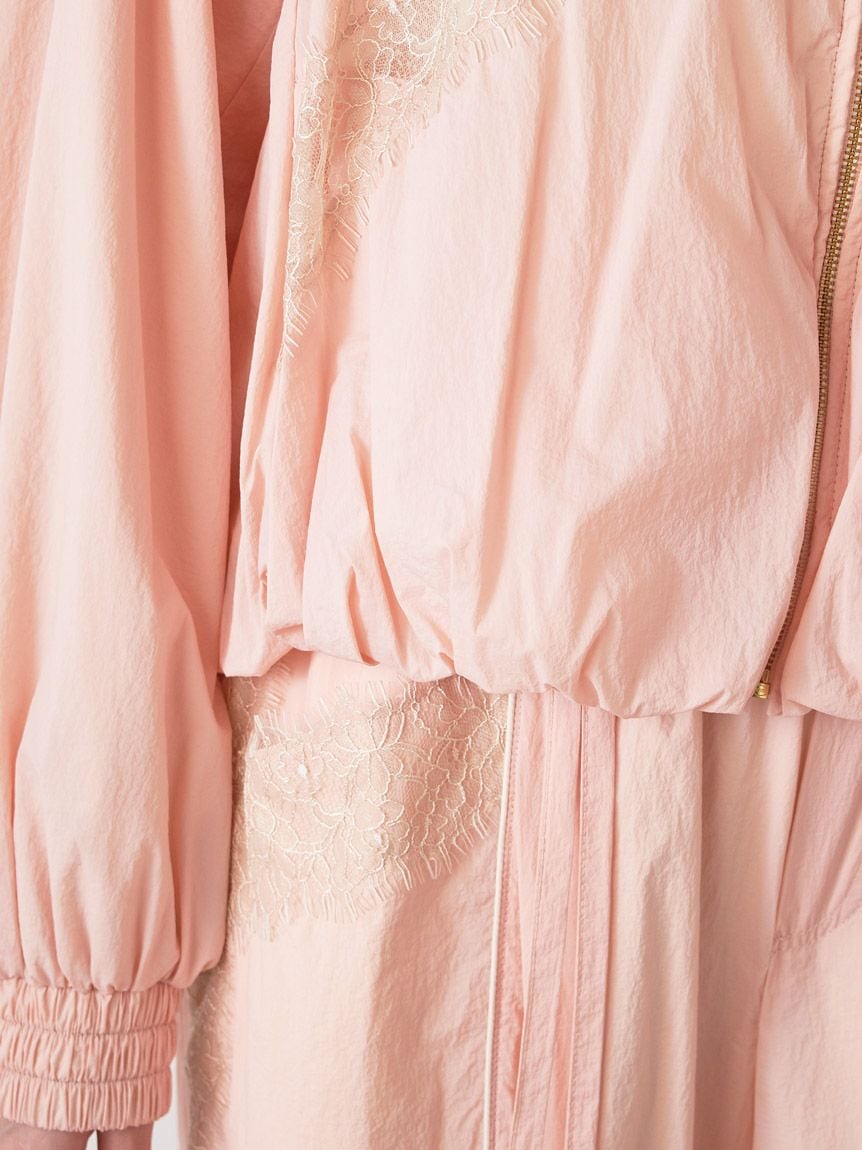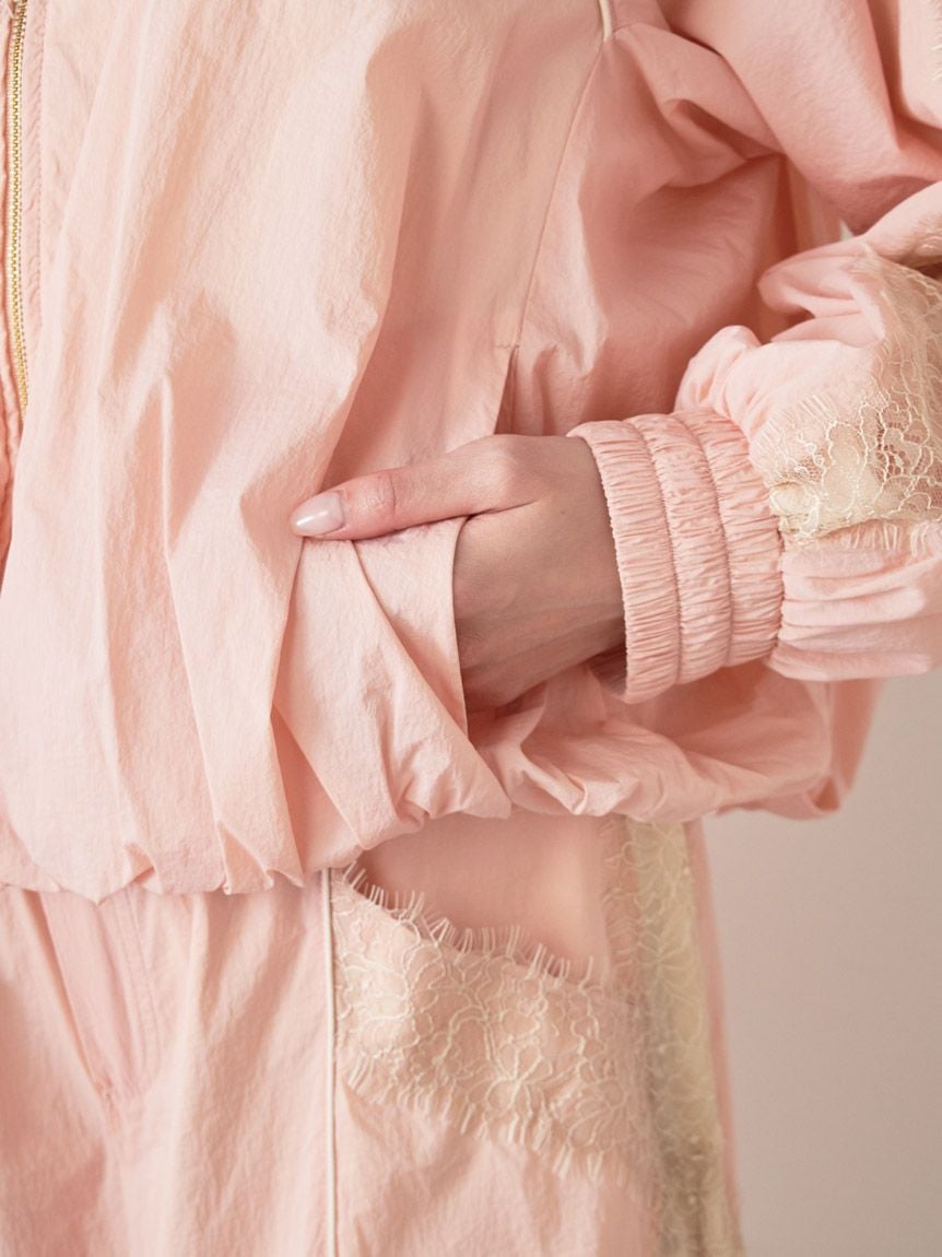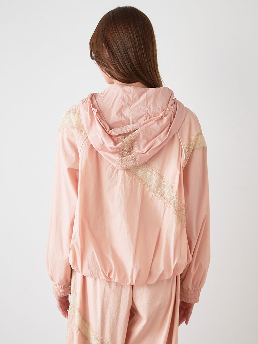 以春夏氛圍的柔和配色,結合不規則拼接的蕾絲細節,打造吸睛的連帽尼龍蕾絲外套。