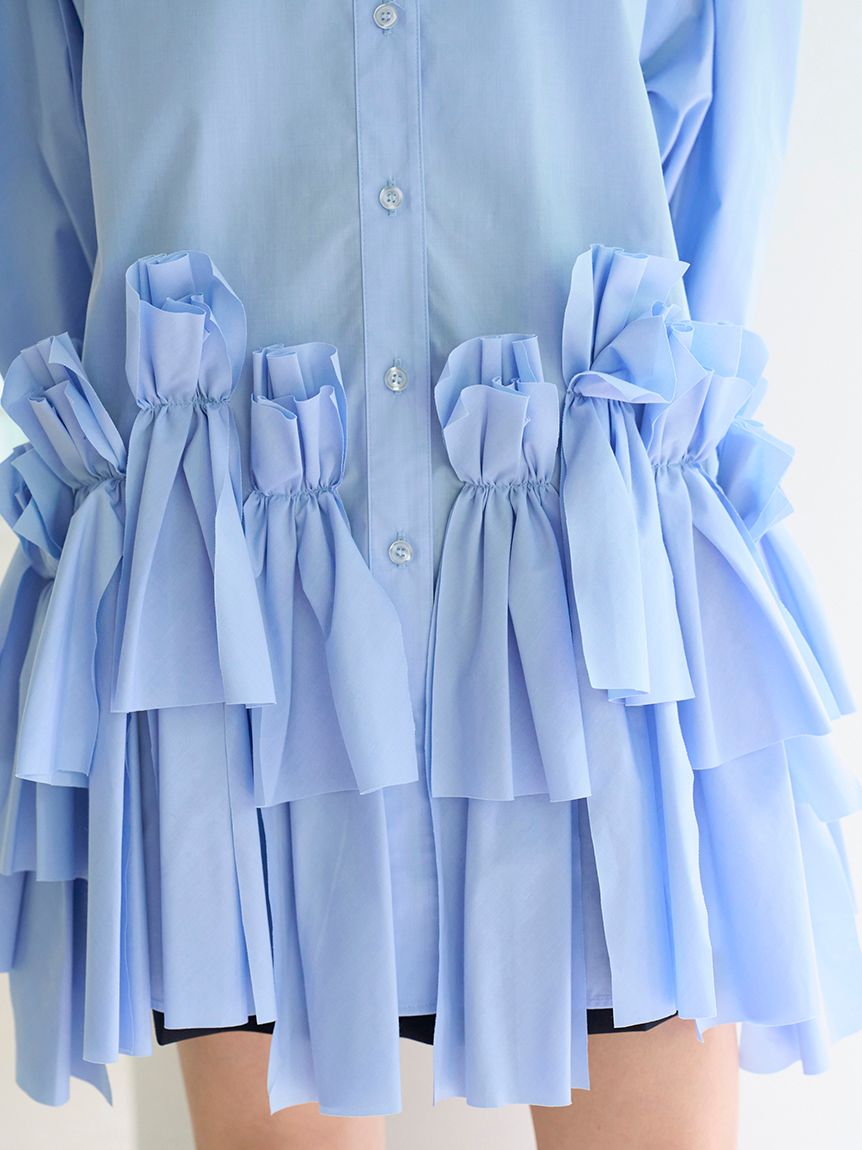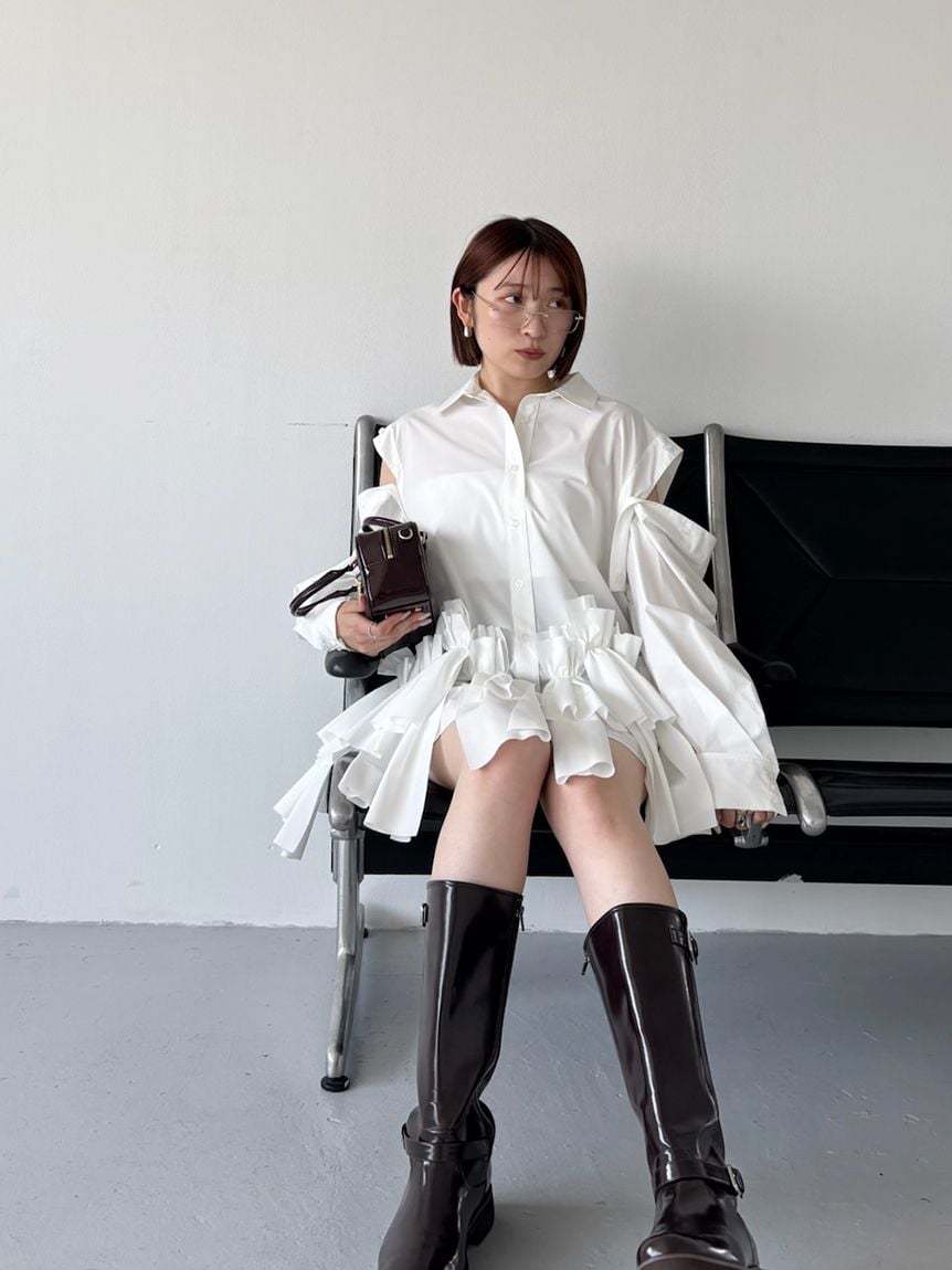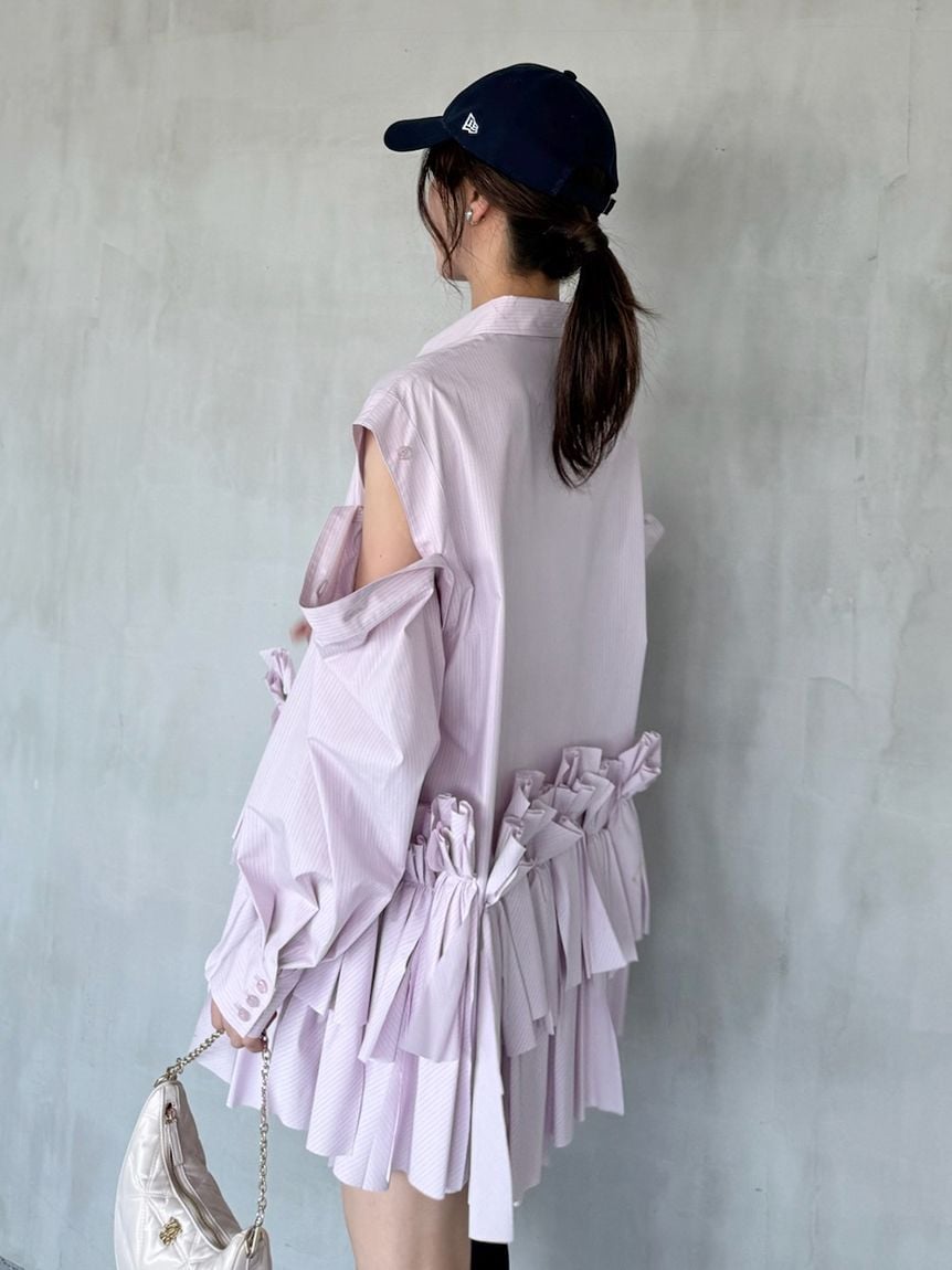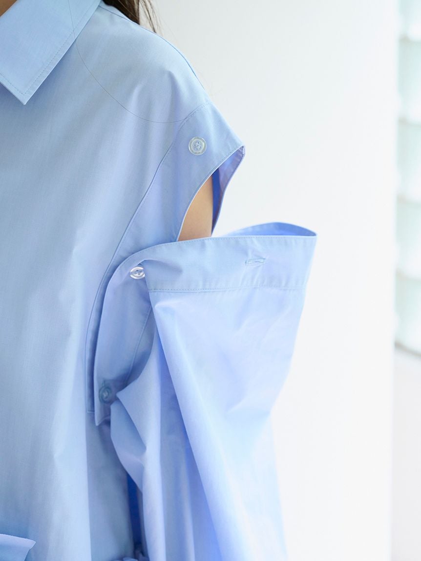 長袖以整圈鈕扣固定於身體,可拆卸變成無袖款,或微微解開肩部增加隨性氛圍,展現多種穿搭方式。膝上長度,單穿搭配靴子或搭配緊身褲、內搭褲作為長版襯衫皆合適。下擺立體蝴蝶結設計,同時帶出纖細視覺效果。