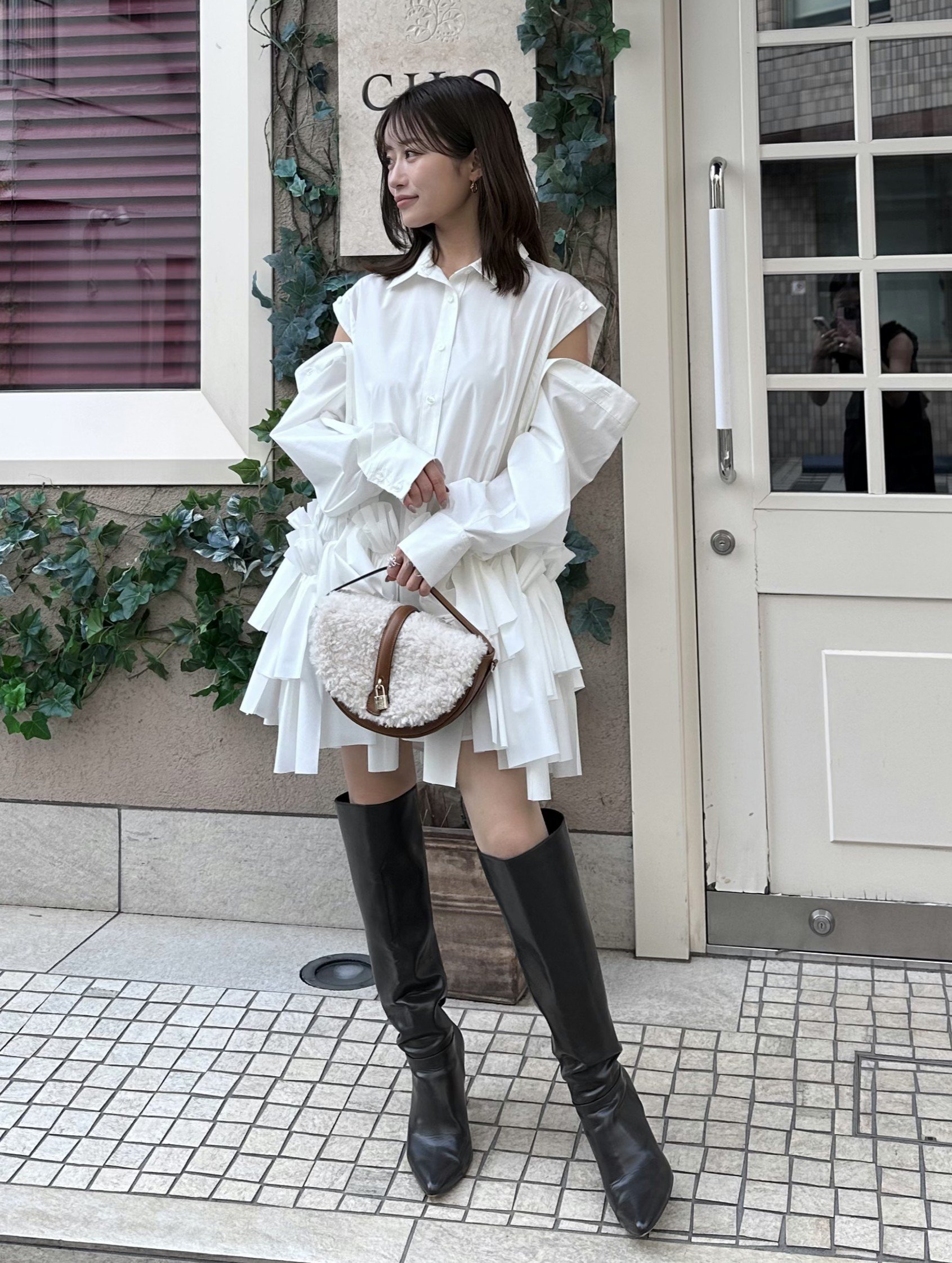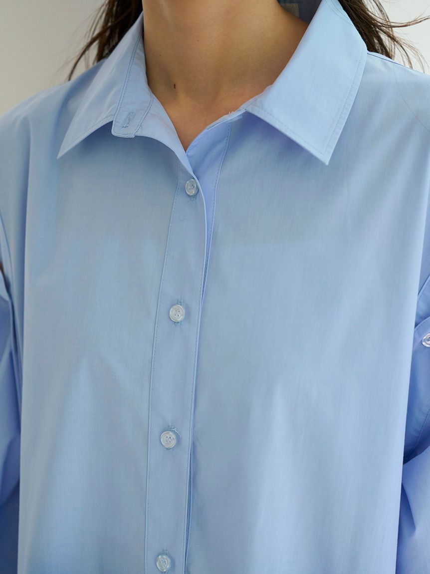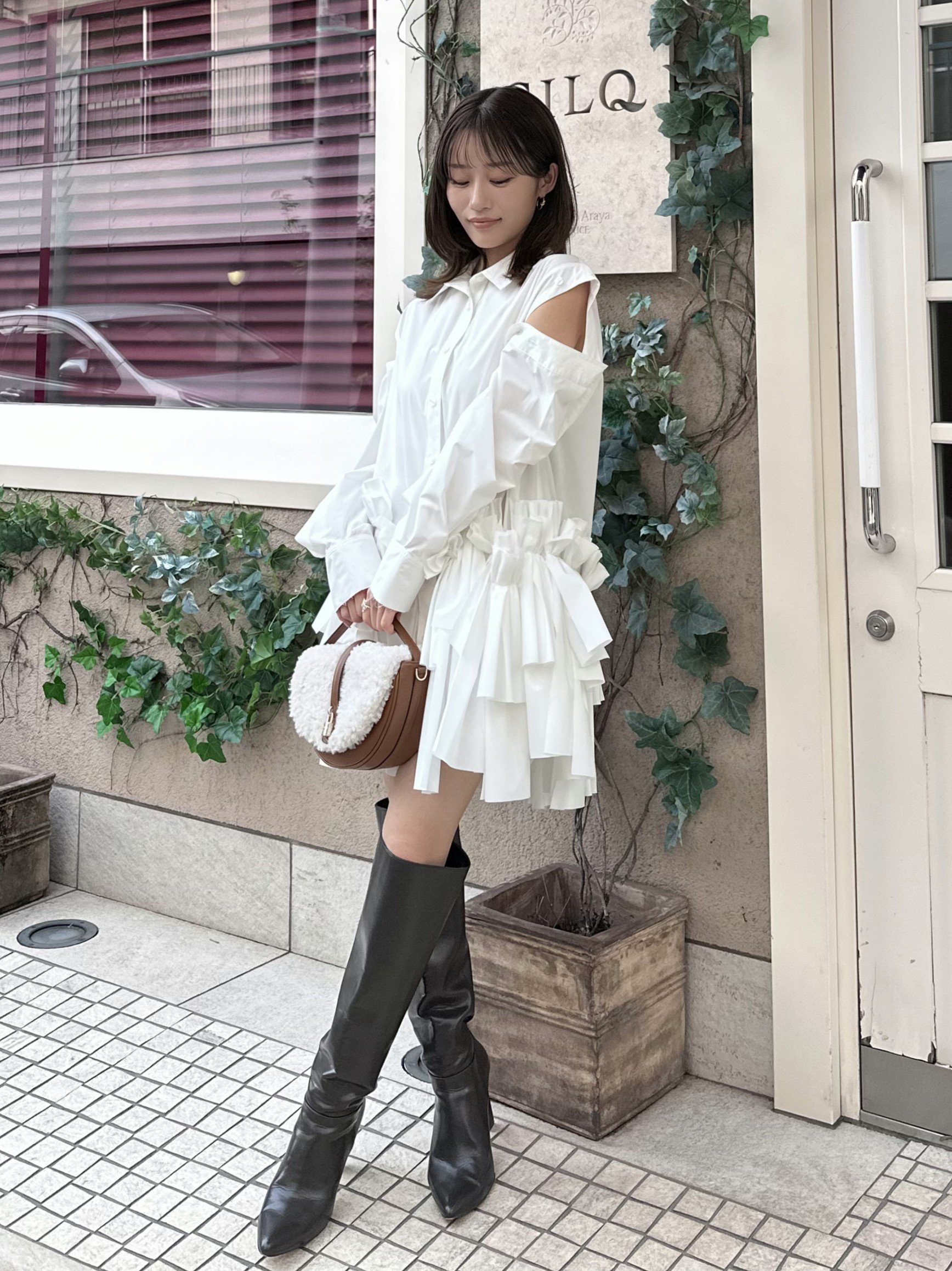 長袖以整圈鈕扣固定於身體,可拆卸變成無袖款,或微微解開肩部增加隨性氛圍,展現多種穿搭方式。膝上長度,單穿搭配靴子或搭配緊身褲、內搭褲作為長版襯衫皆合適。下擺立體蝴蝶結設計,同時帶出纖細視覺效果。