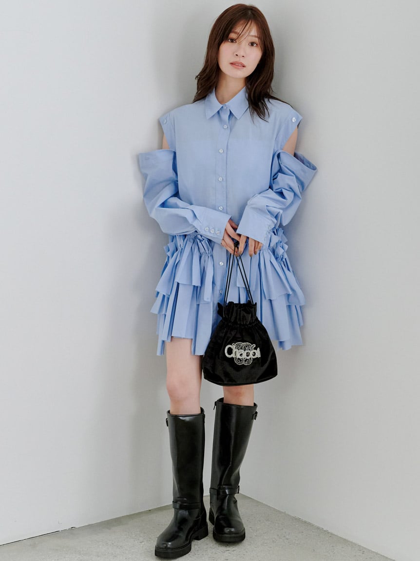 下擺採用不規則裁切襯衫布料蝴蝶結設計,打造吸睛迷你洋裝。