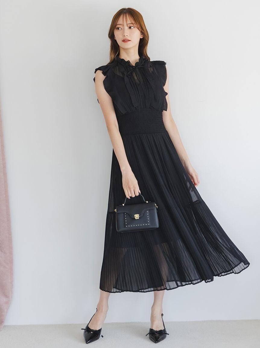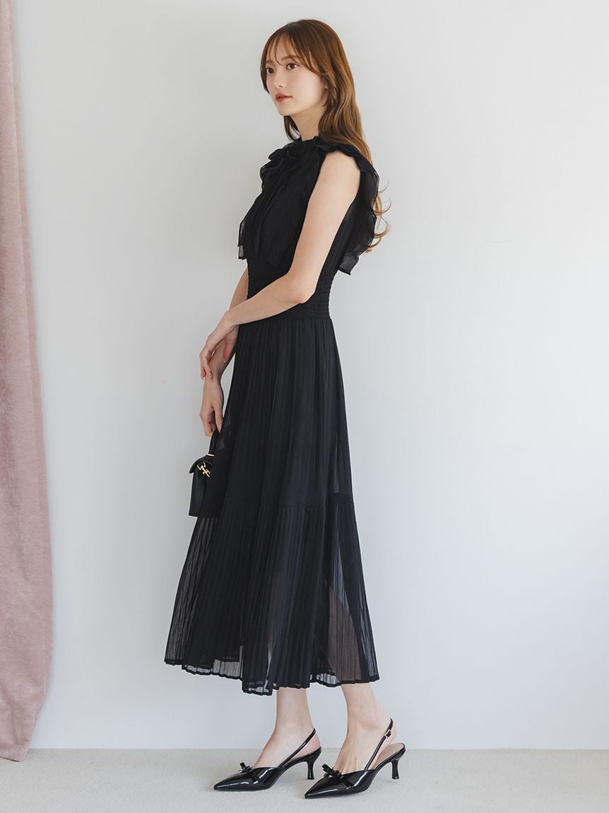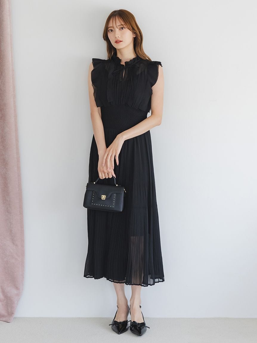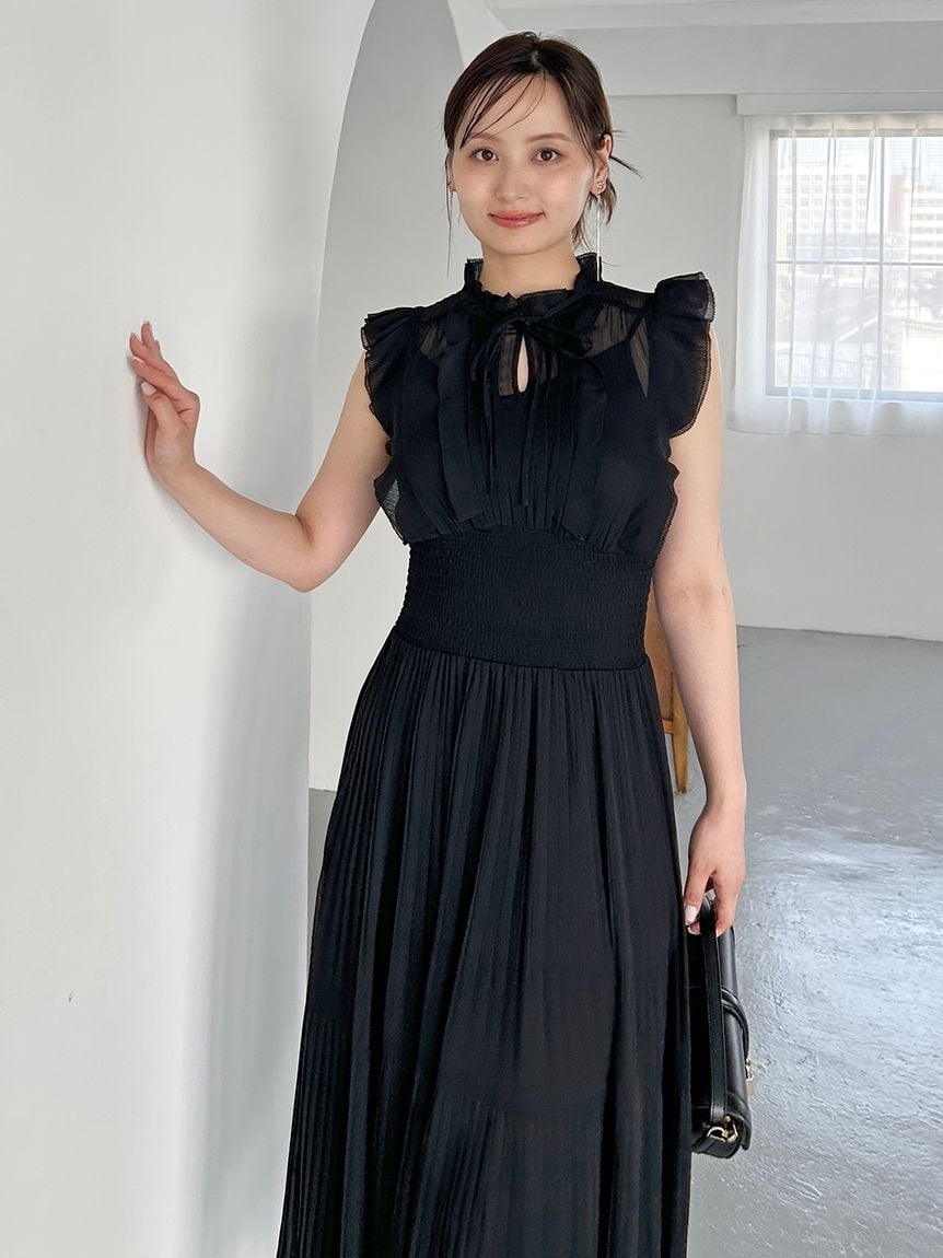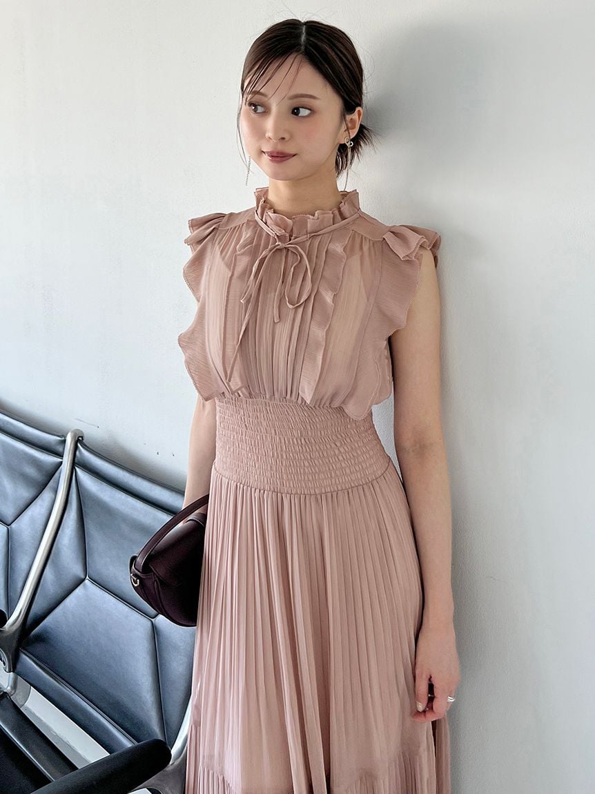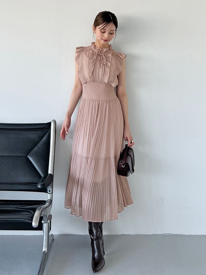這款SNIDEL人氣腰鬆緊洋裝採用柔軟皺褶布料升級設計,素色布料展現洗練氣質,適合半正式場合穿著。胸前與裙身運用大量打皺與摺線,增加層次與動感。立領搭配細蝴蝶結增添端莊感,肩部雙層荷葉邊設計更顯華麗。裙擺褶飾隨步伐自然擺動,營造優雅氣息。