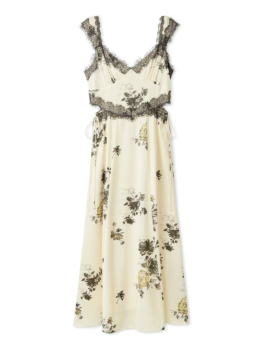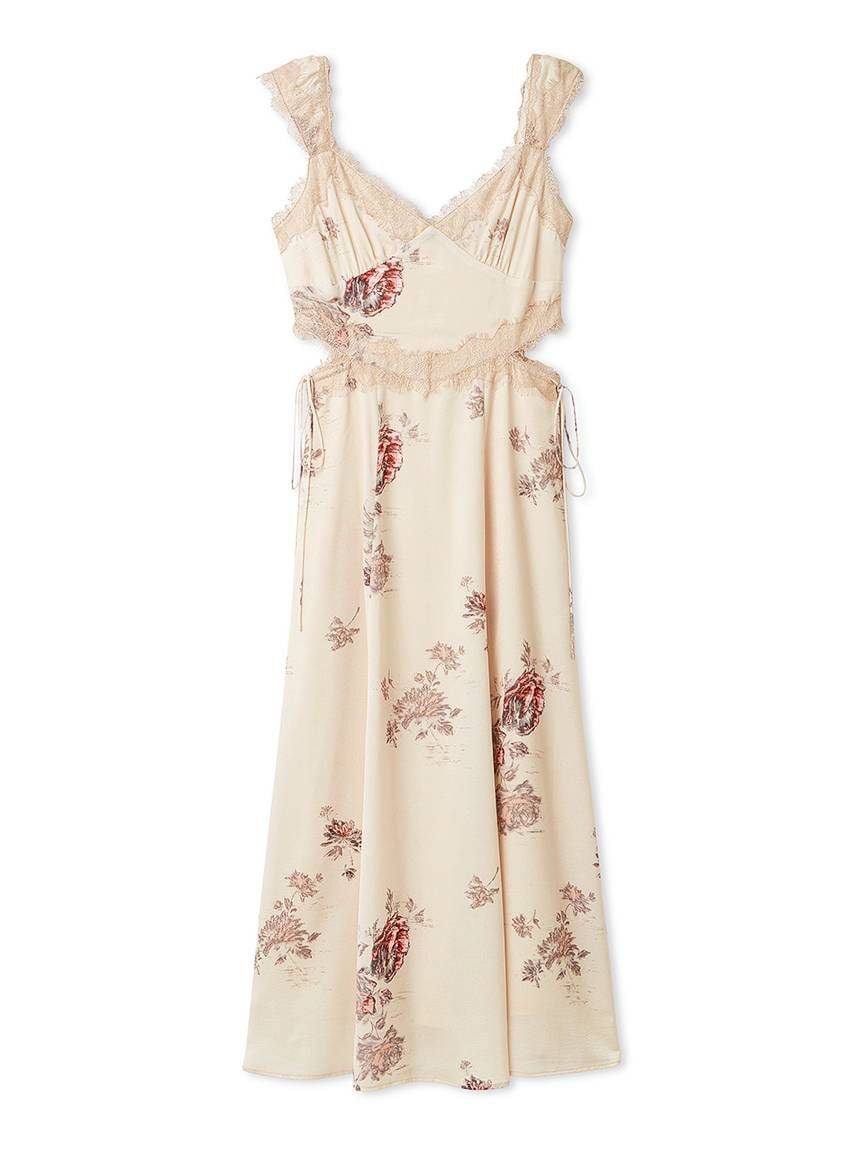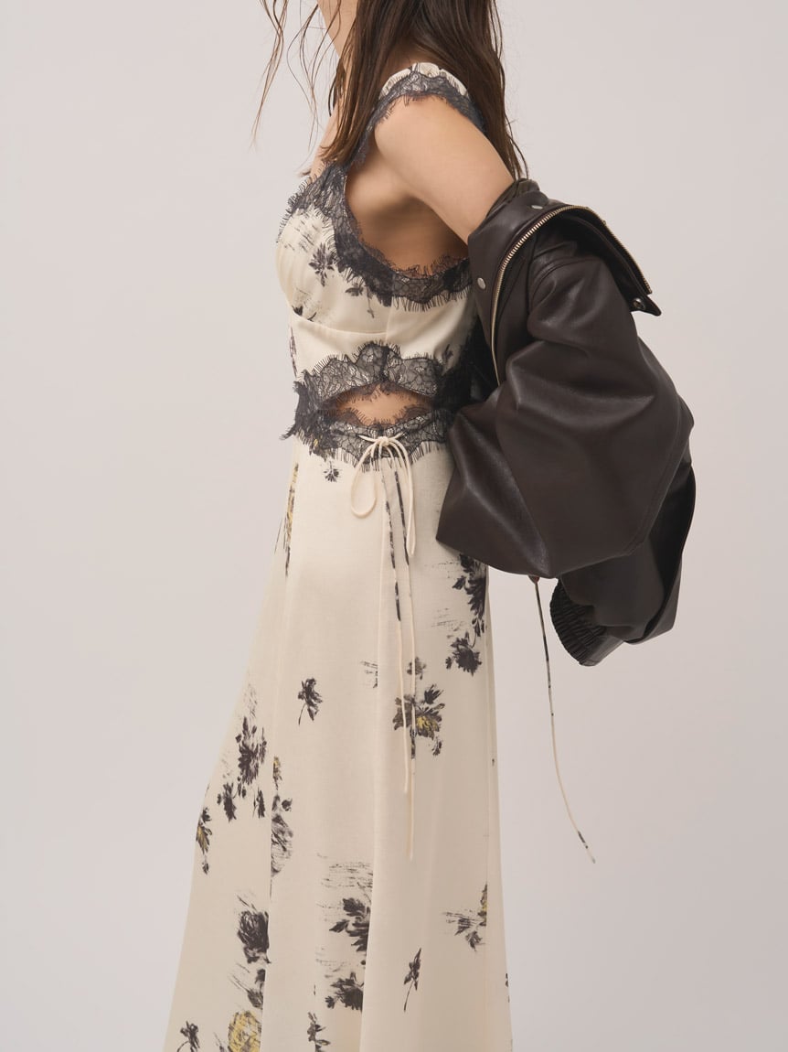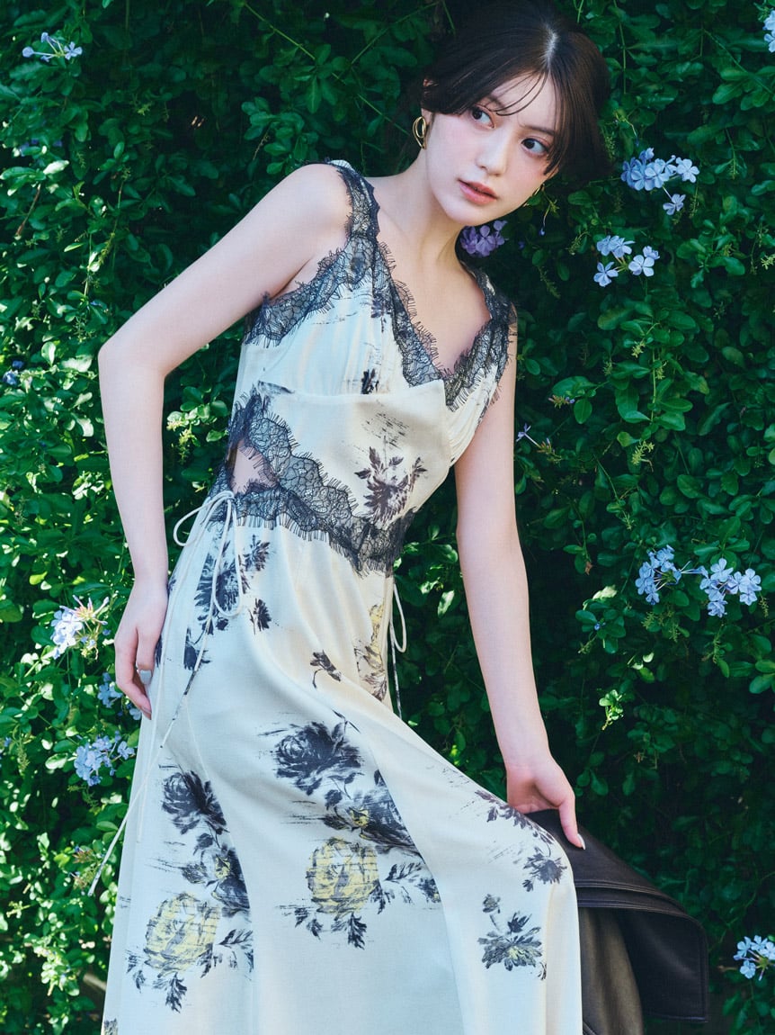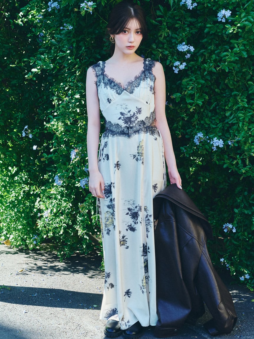 結合復古風花卉印花與華麗細緻蕾絲帶,增添春日氣息的印花吊帶洋裝登場。