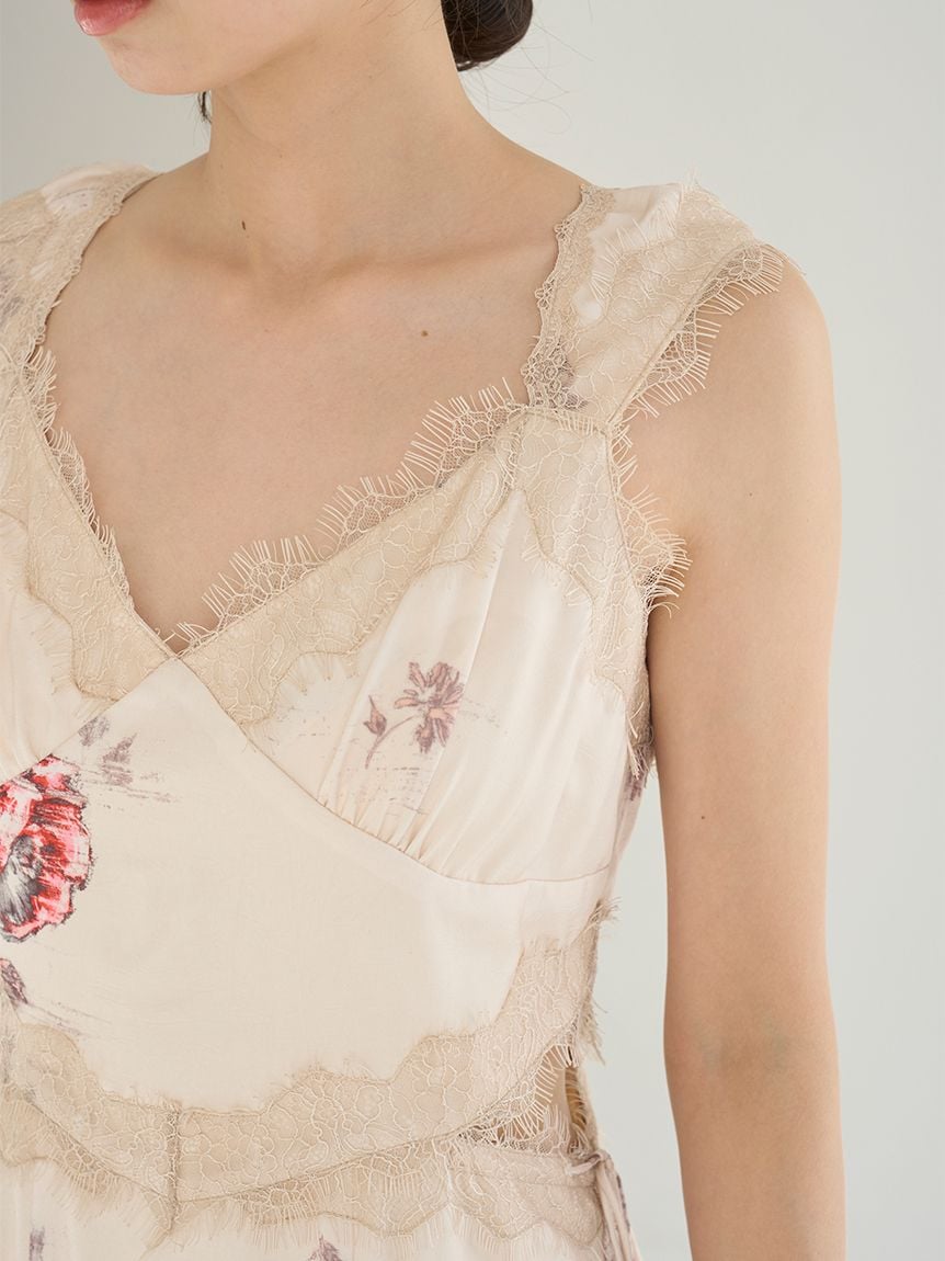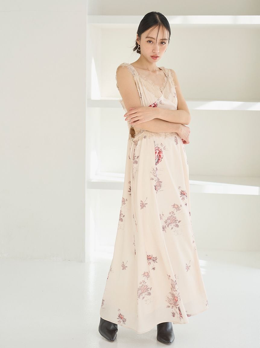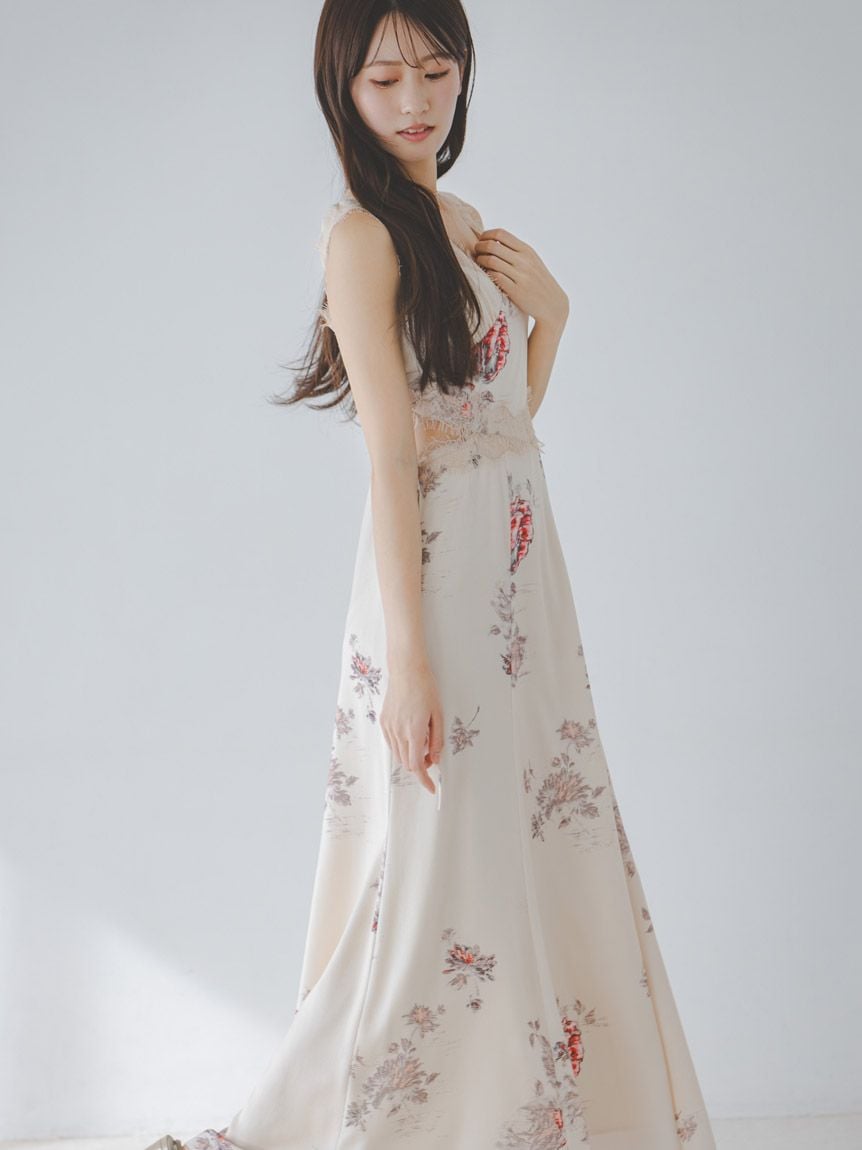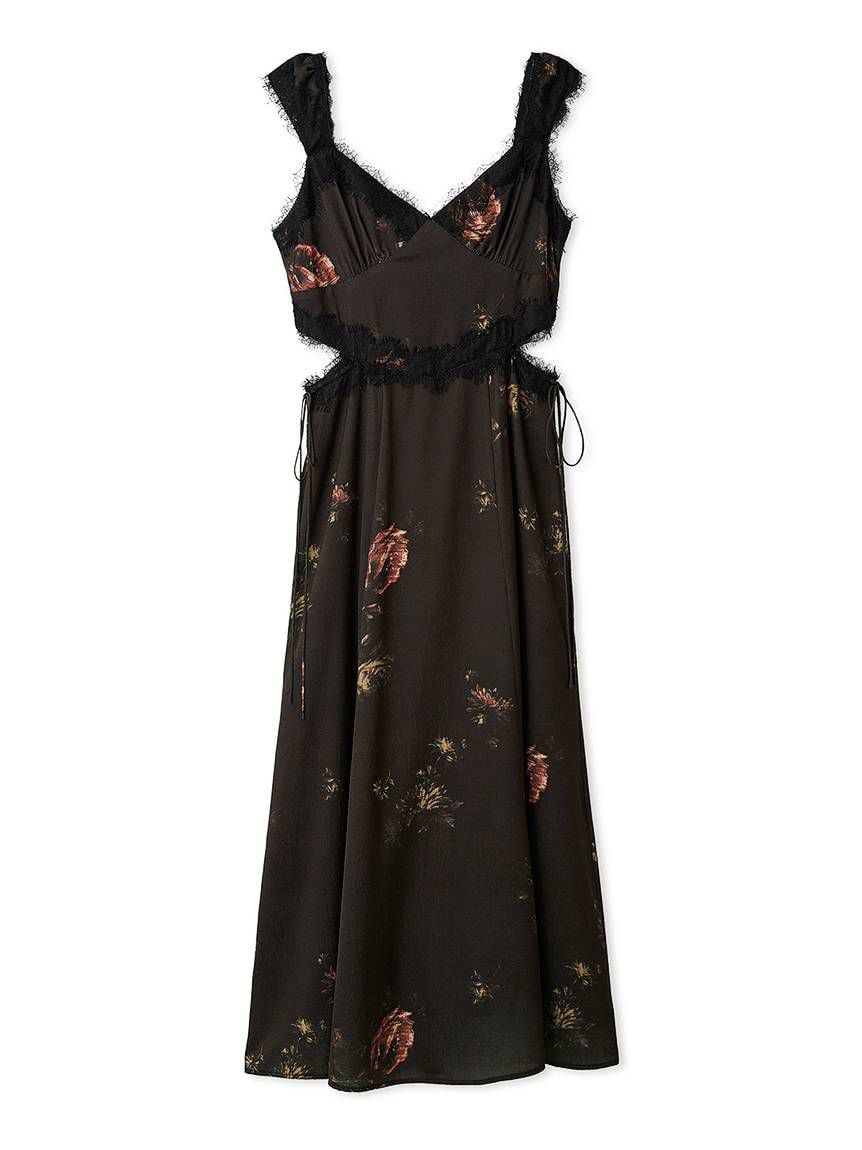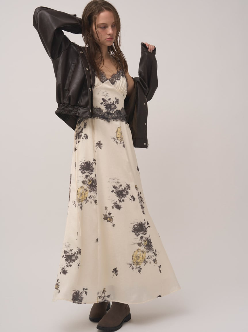 結合復古風花卉印花與華麗細緻蕾絲帶,增添春日氣息的印花吊帶洋裝登場。