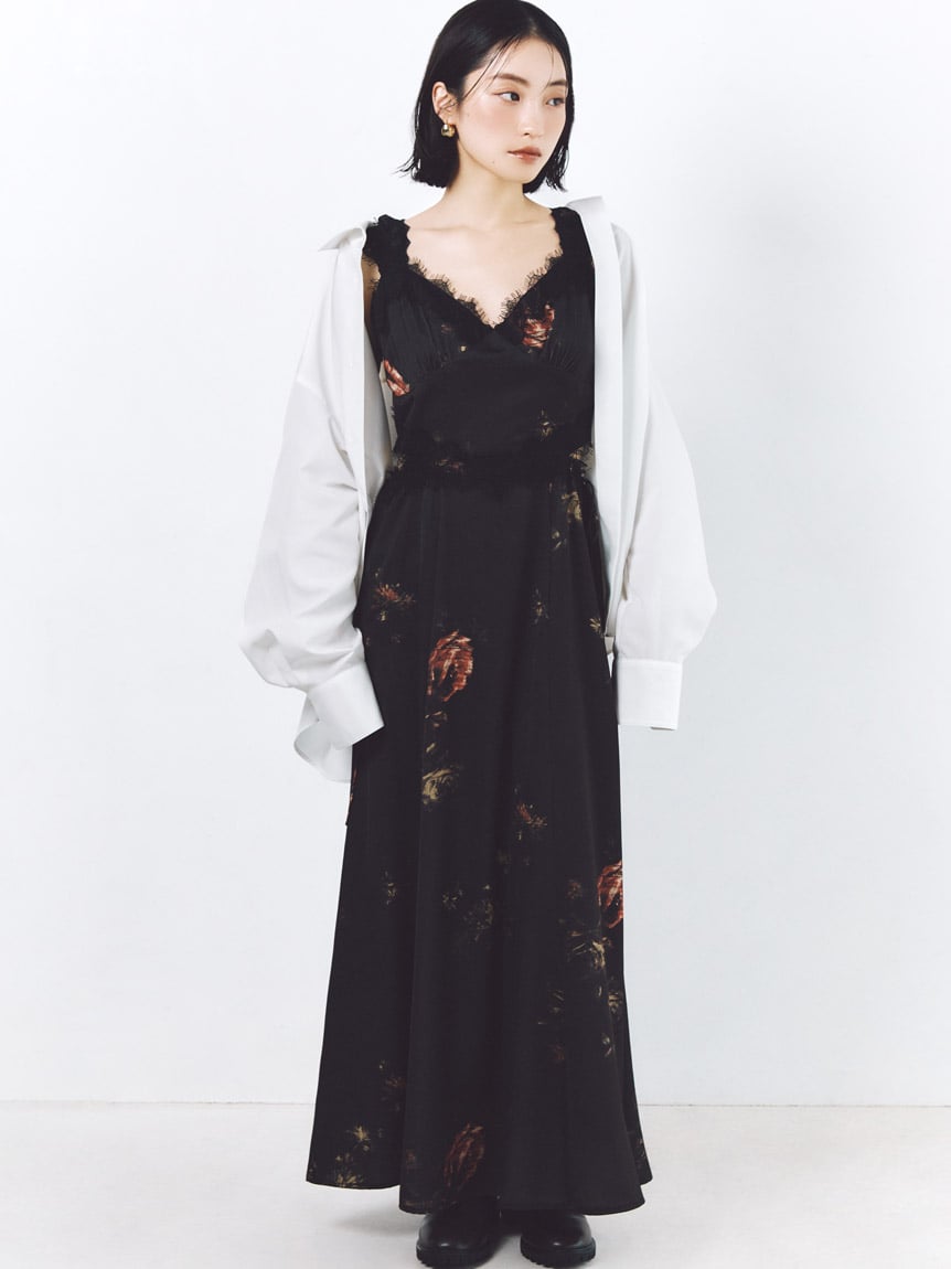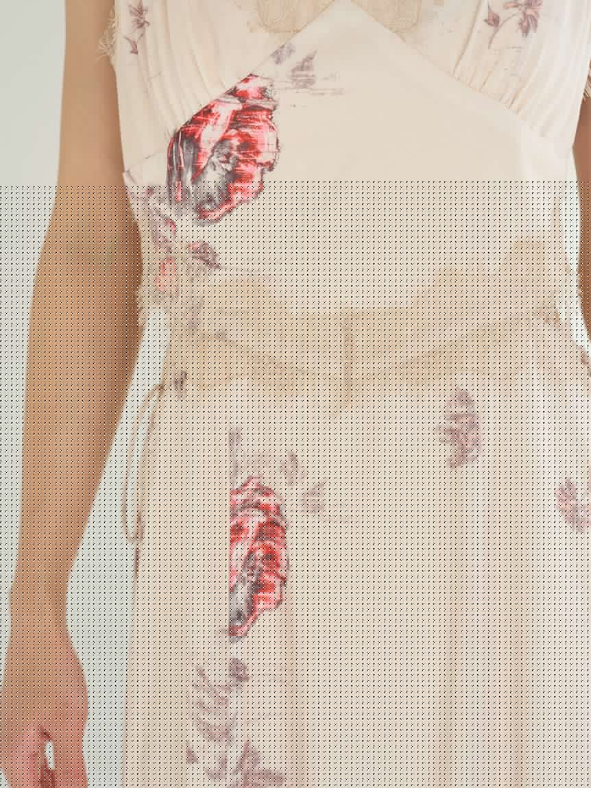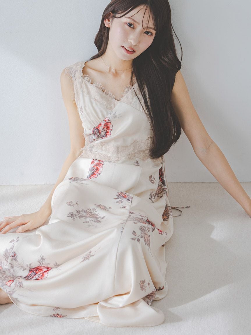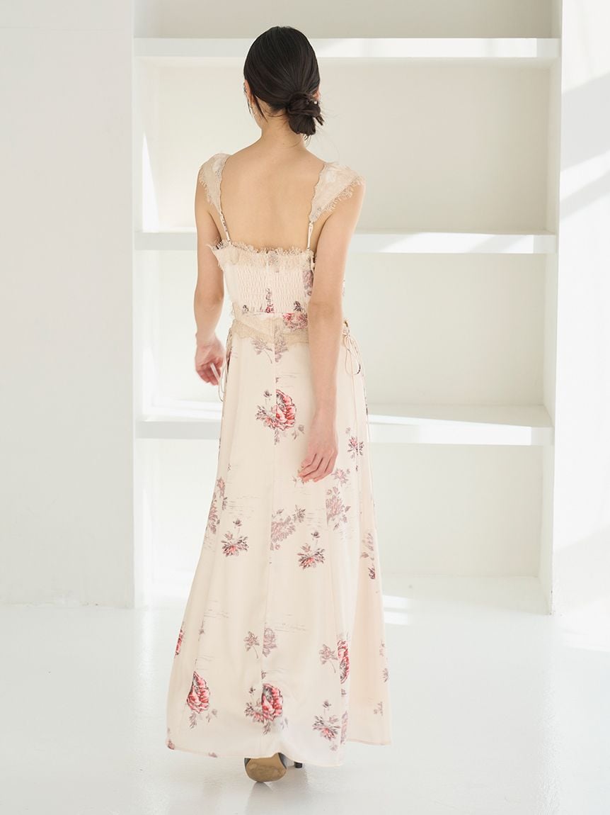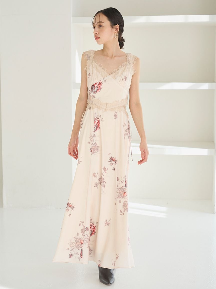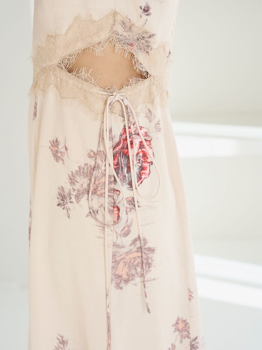 結合復古風花卉印花與華麗細緻蕾絲帶,增添春日氣息的印花吊帶洋裝登場。
