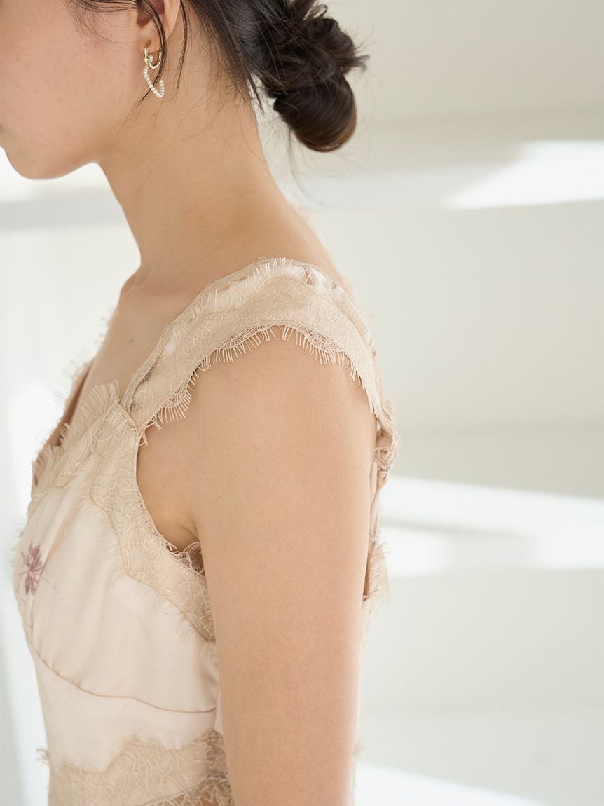 V型胸口、肩帶及高腰位置大量運用纖細蕾絲,增添華麗感。