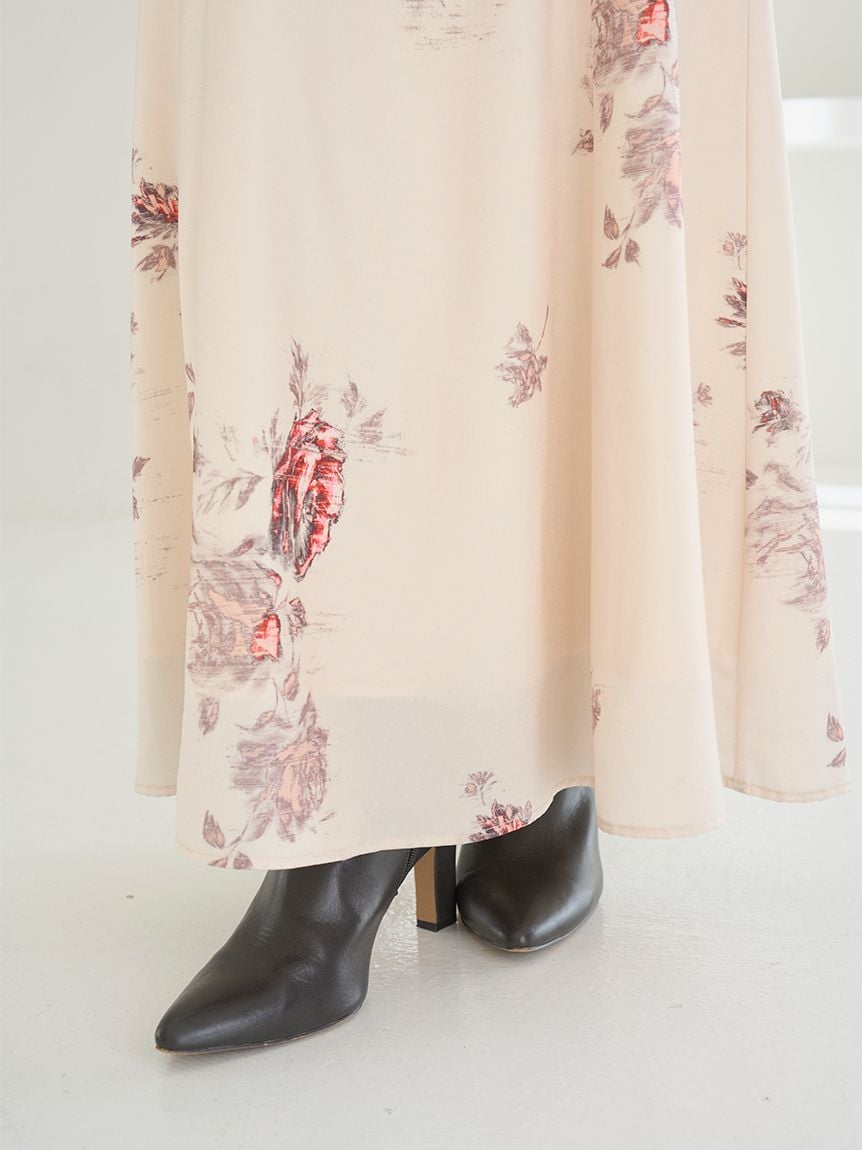 採用垂感十足的復古緞面布料,自然向下延展出優雅流暢的喇叭裙型。