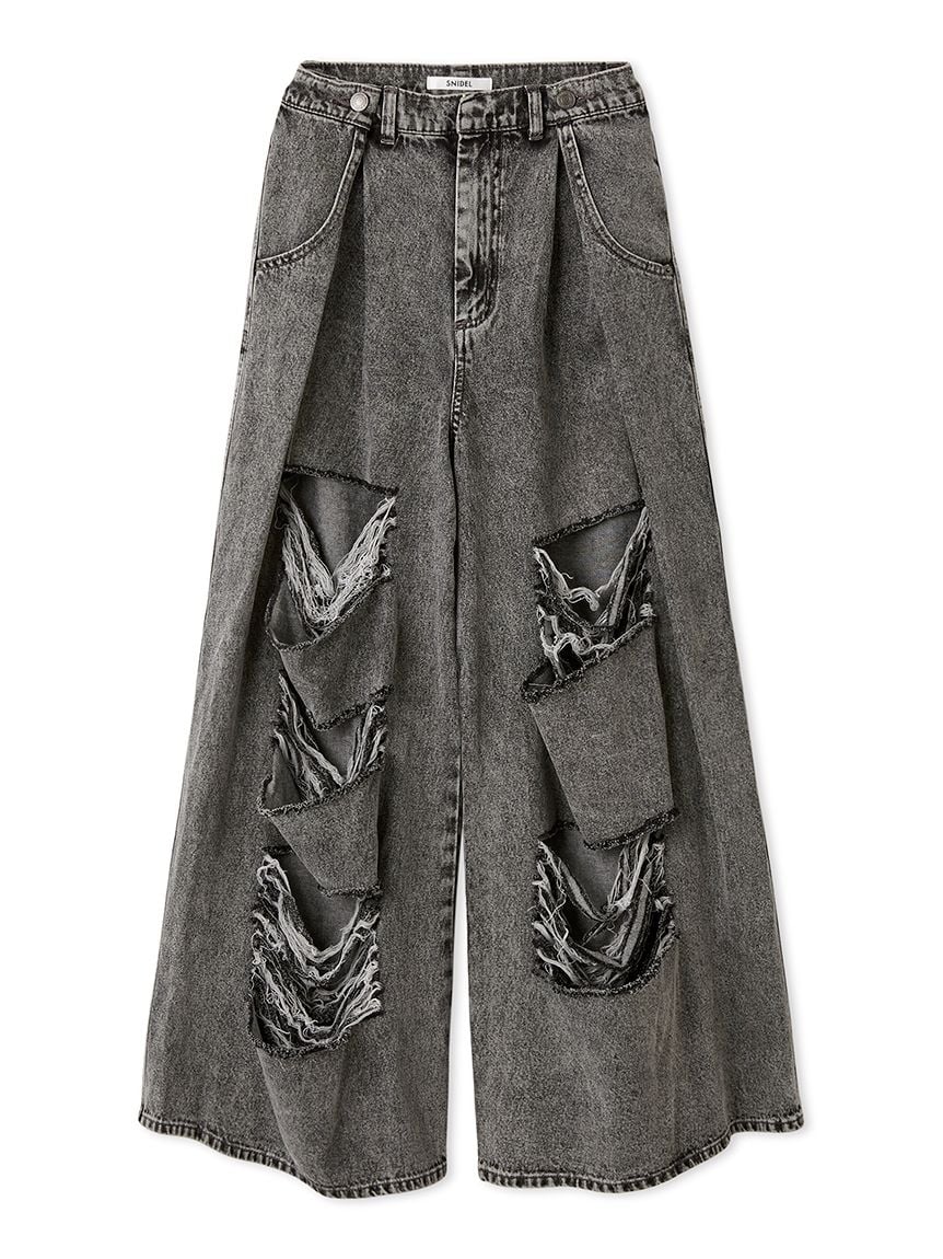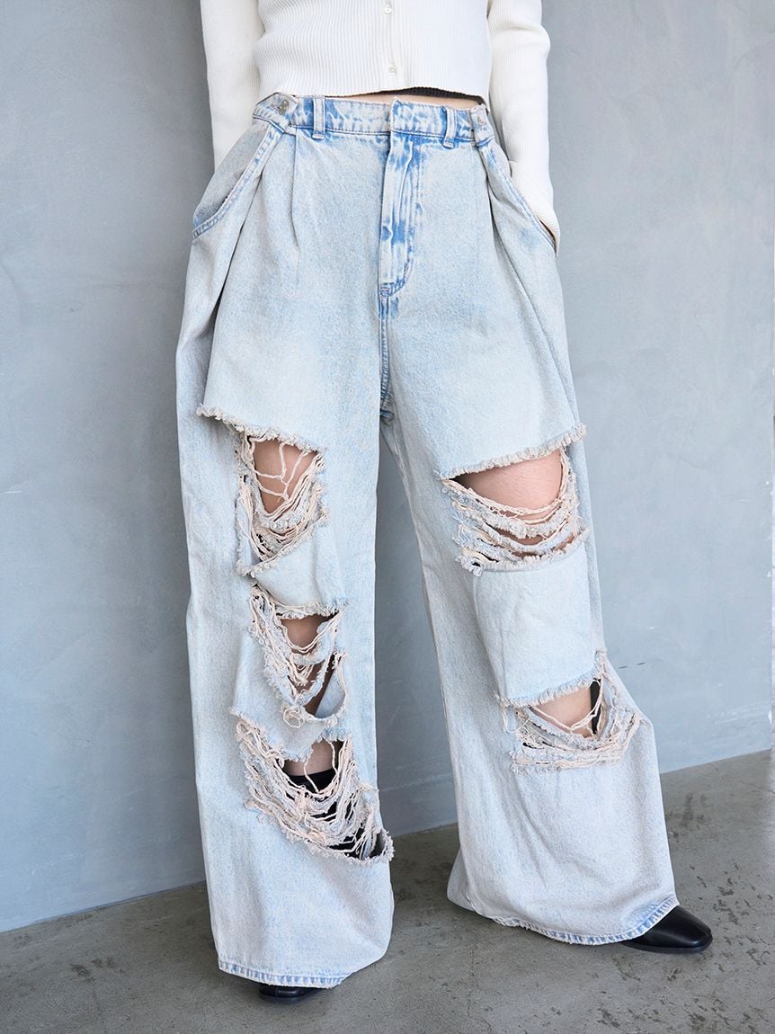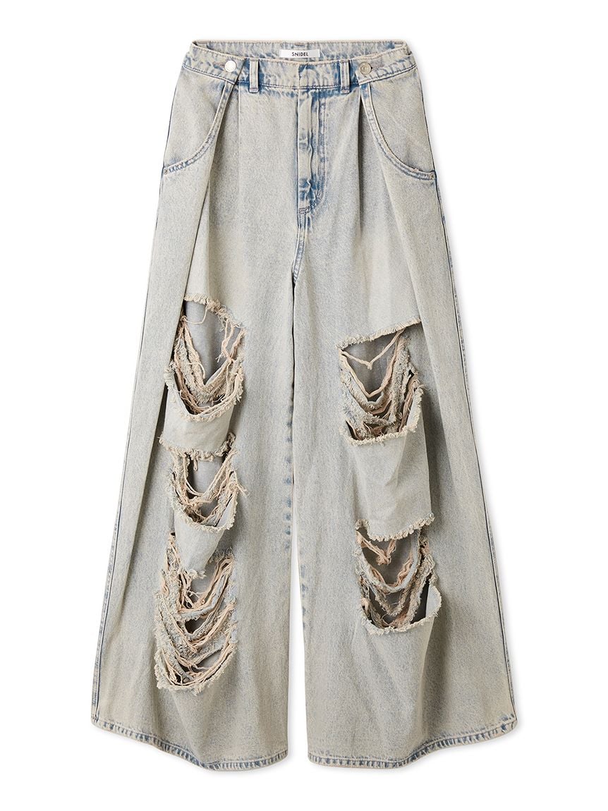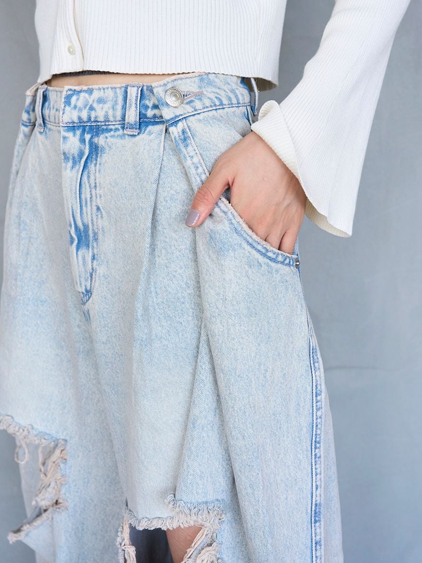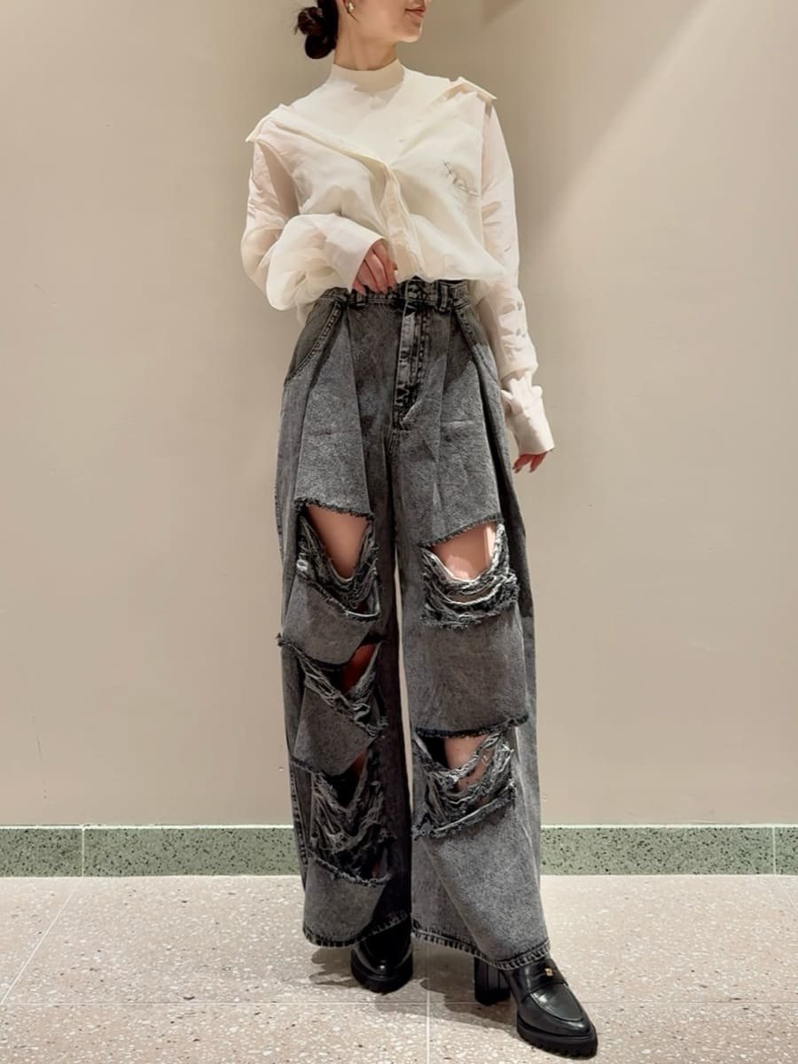寬版剪裁搭配破壞加工,腰部打褶增加立體感,使腰身更俐落且造型隨性有型。只需簡單搭配素色上衣,就能完成出眾穿搭。