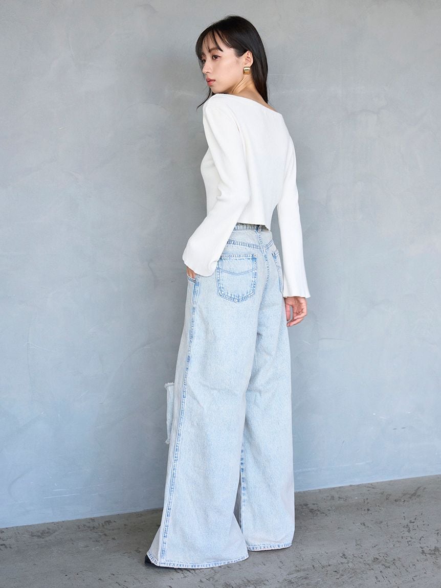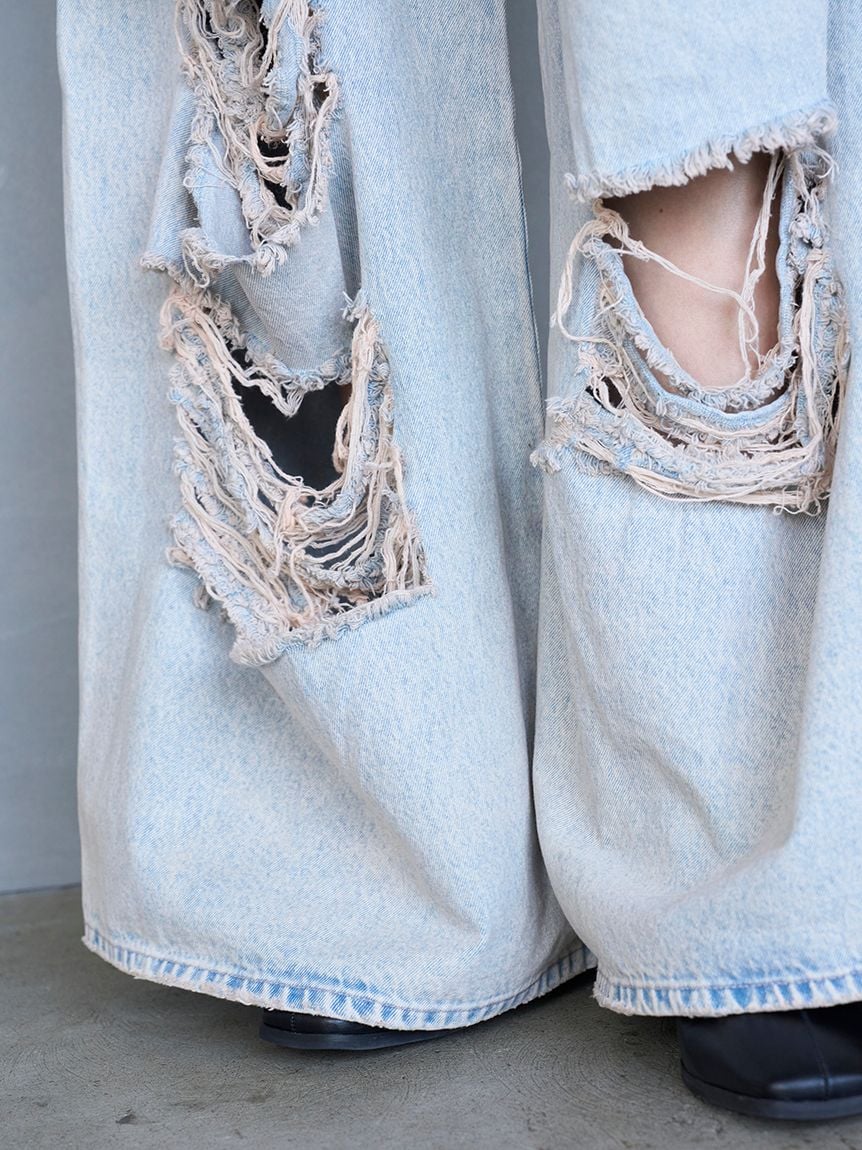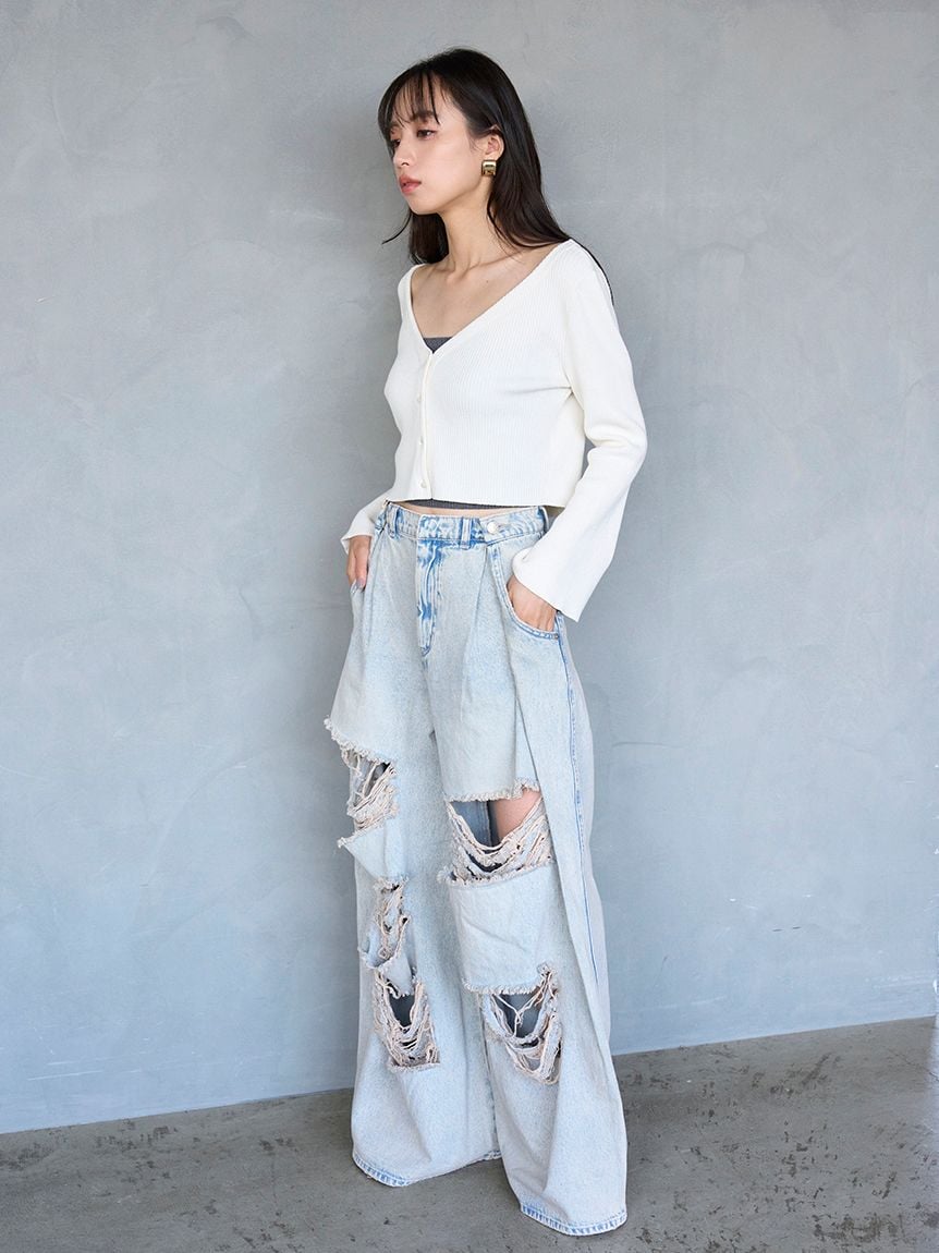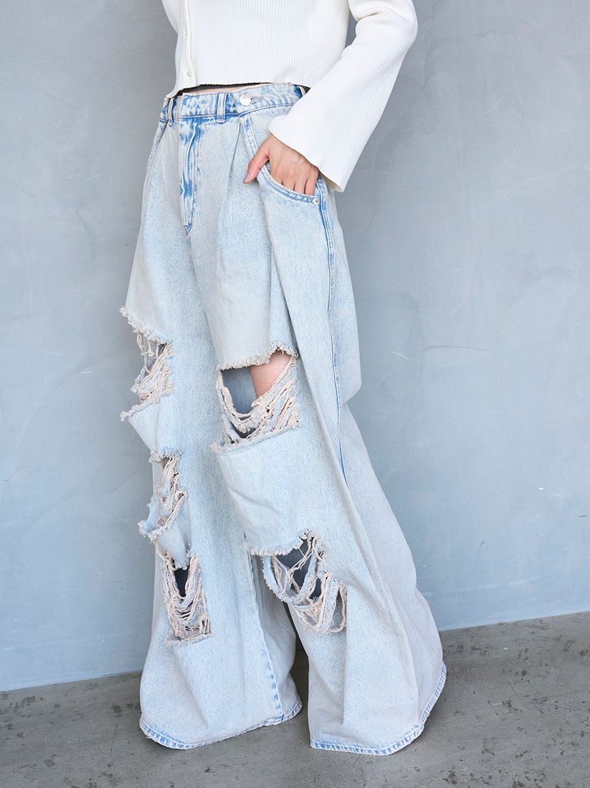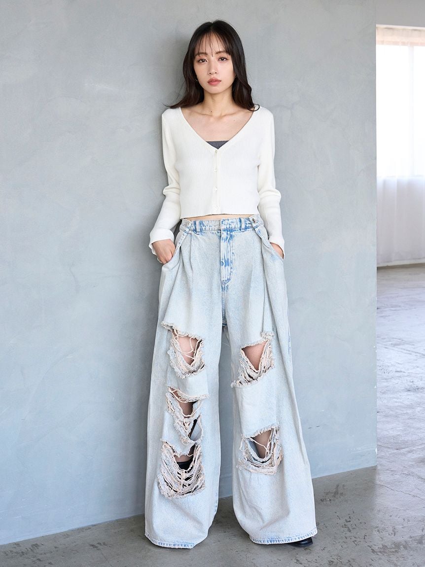 寬版剪裁搭配破壞加工,腰部打褶增加立體感,使腰身更俐落且造型隨性有型。只需簡單搭配素色上衣,就能完成出眾穿搭。