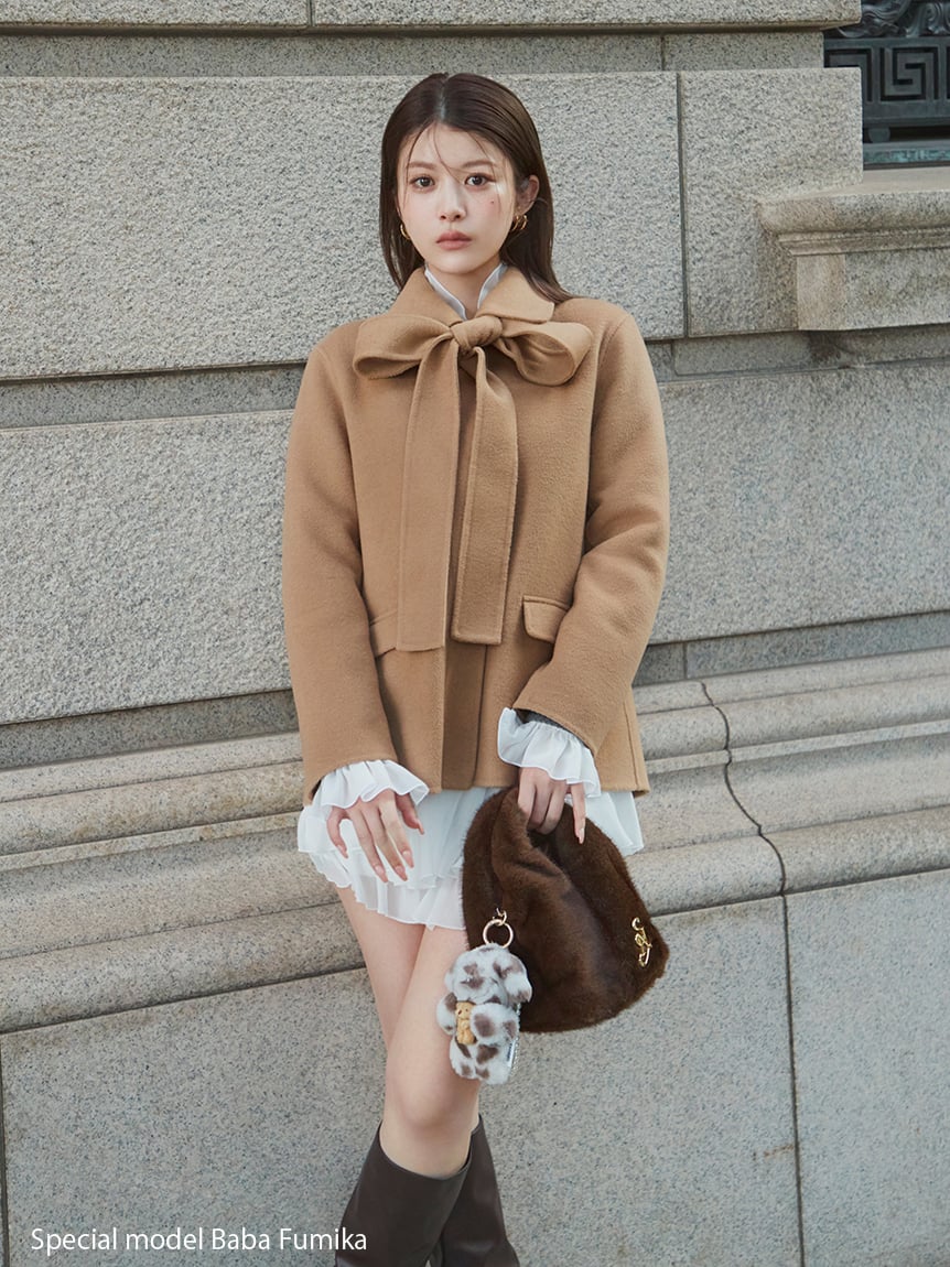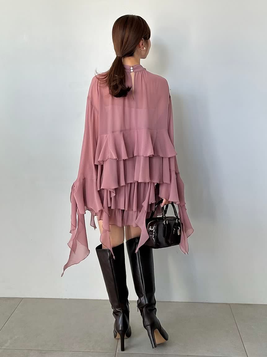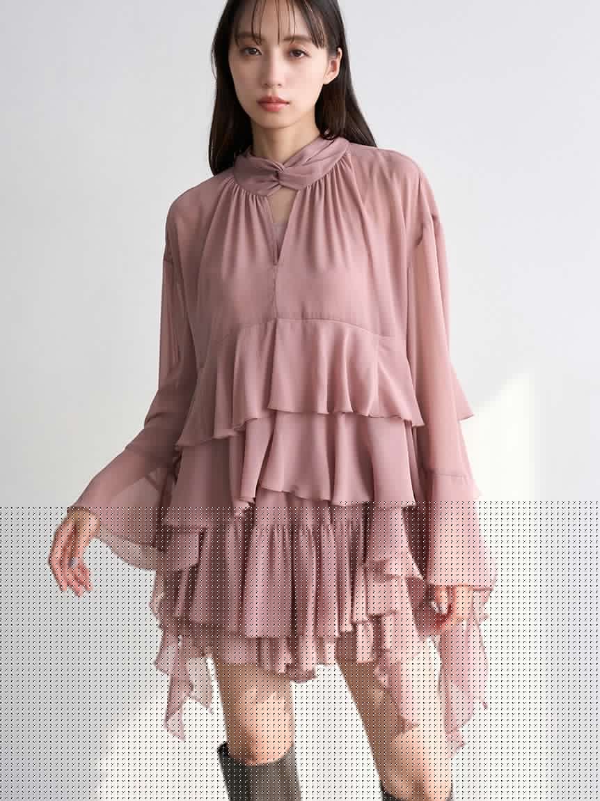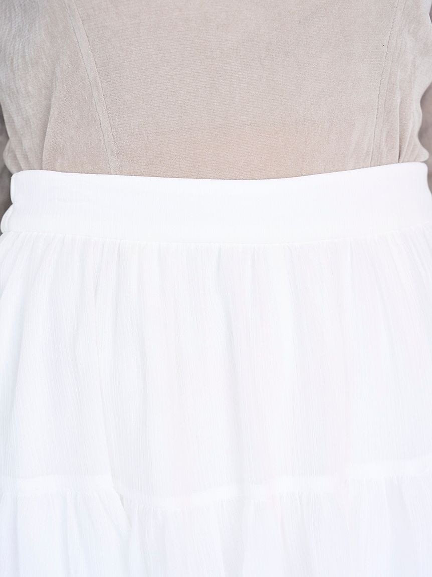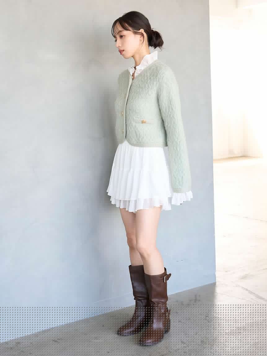 精準設計的多層荷葉弧度,隨步伐自然散開,每個動作都呈現柔美飄逸的動態。能與同系列、同色同布料的 荷葉邊襯衫(SWFB255026) 成套搭配,也非常推薦與 長版仿毛絨針織外套(SWNJ255146) 完成輕柔且具存在感的造型。