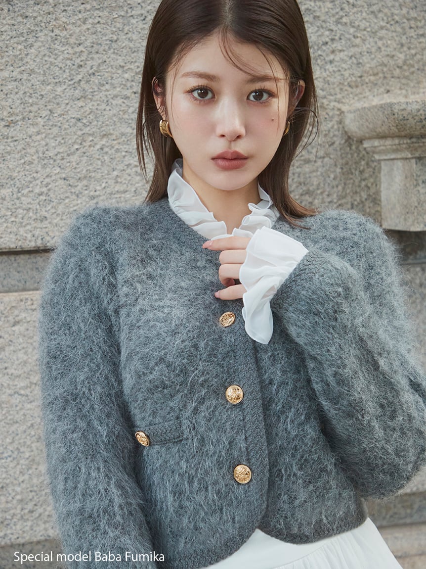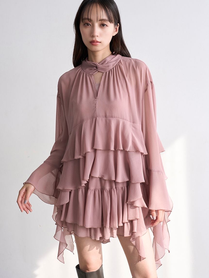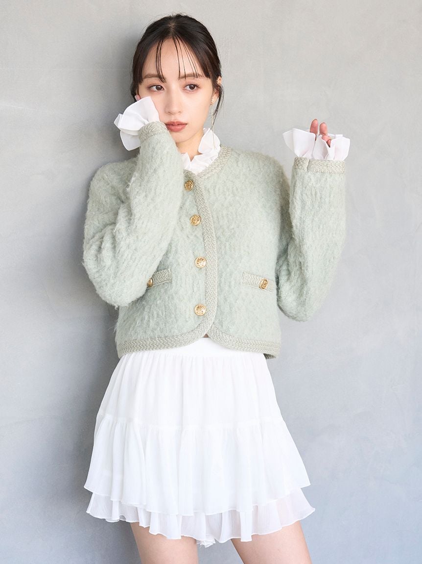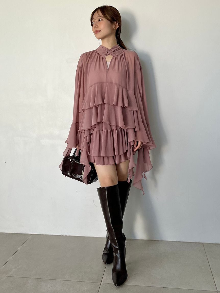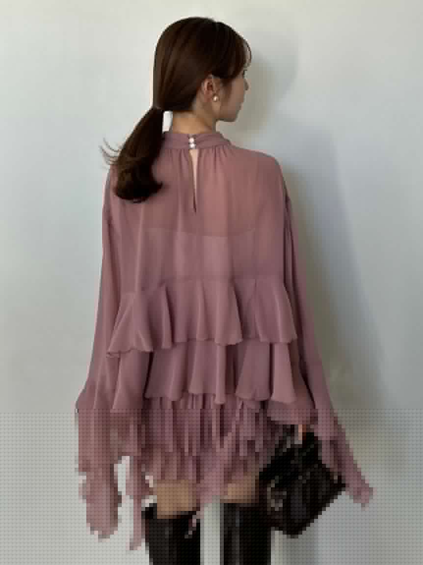 精準設計的多層荷葉弧度,隨步伐自然散開,每個動作都呈現柔美飄逸的動態。能與同系列、同色同布料的 荷葉邊襯衫(SWFB255026) 成套搭配,也非常推薦與 長版仿毛絨針織外套(SWNJ255146) 完成輕柔且具存在感的造型。