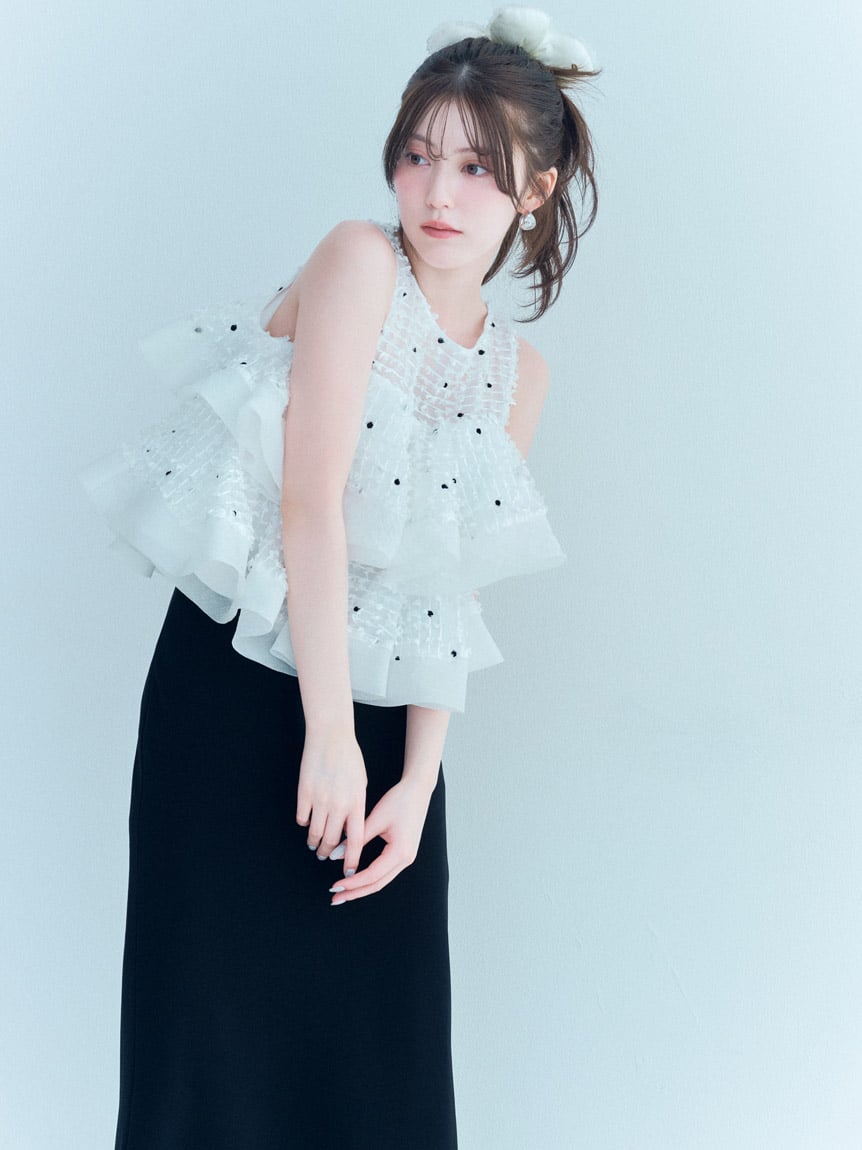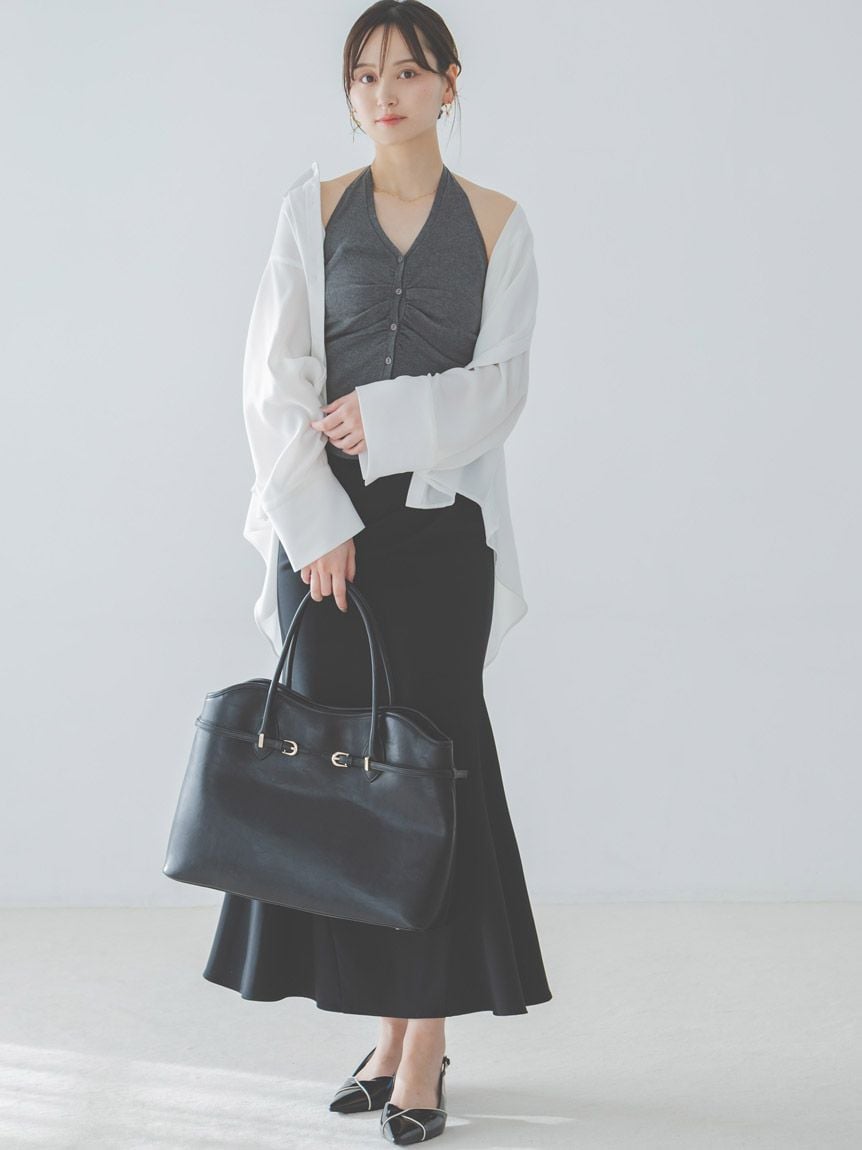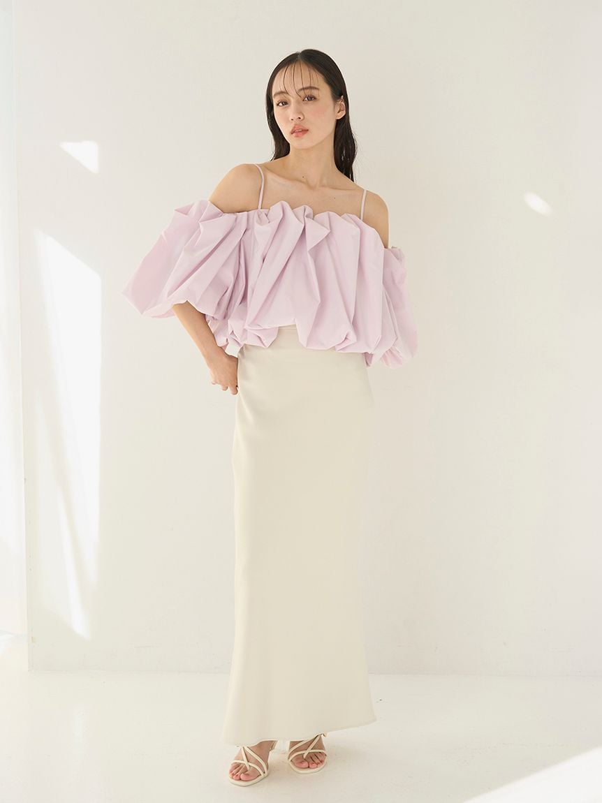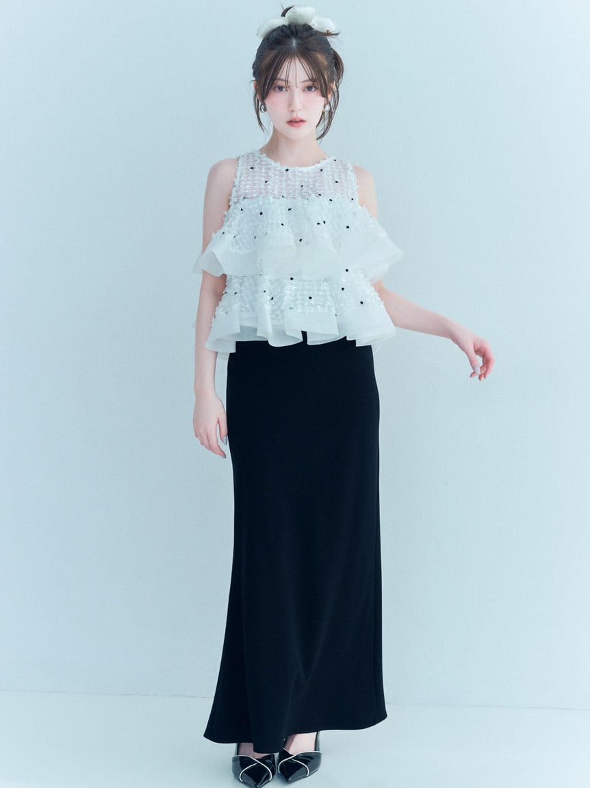 採用具有垂感的布料製作的美人魚剪裁簡約長裙登場。