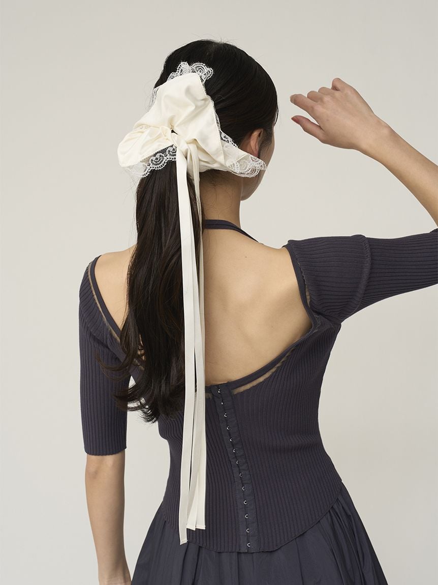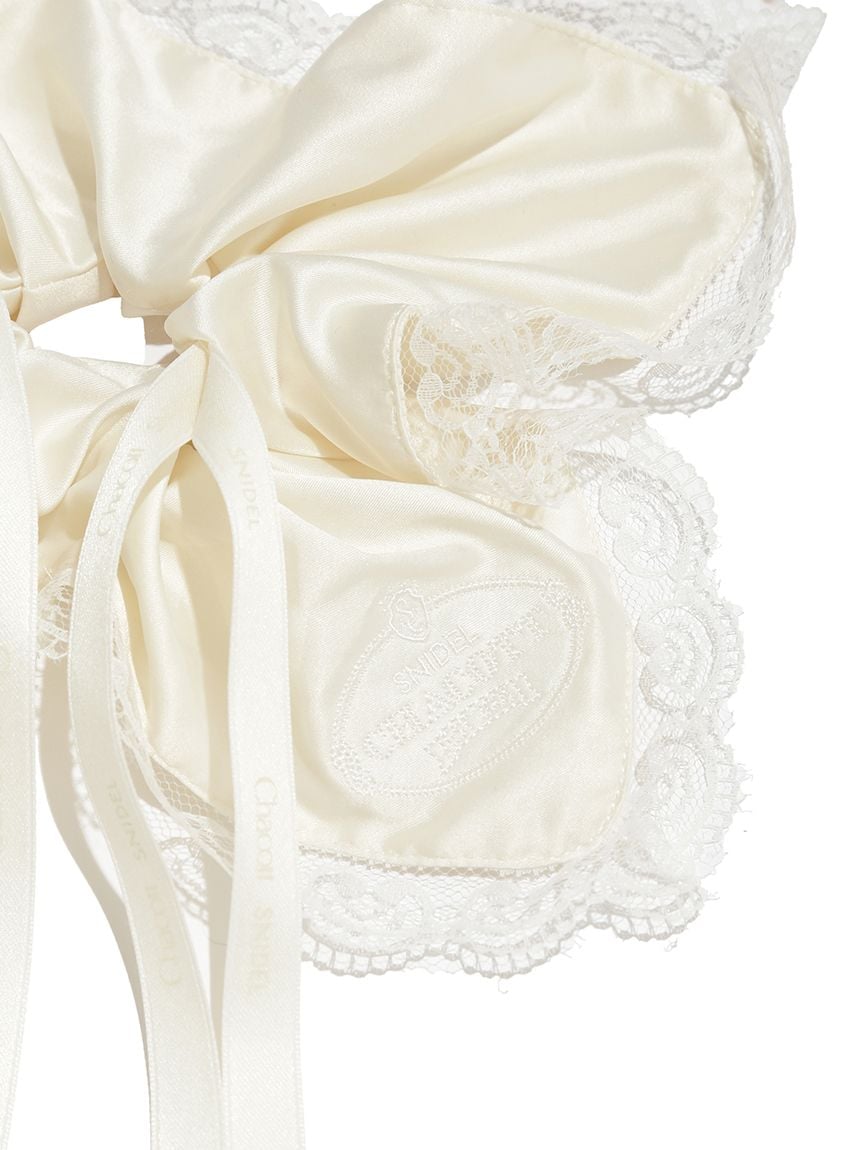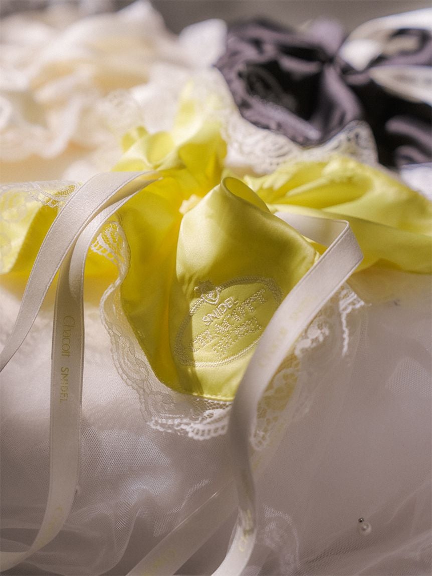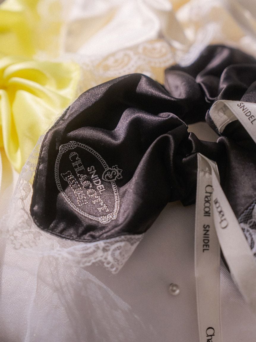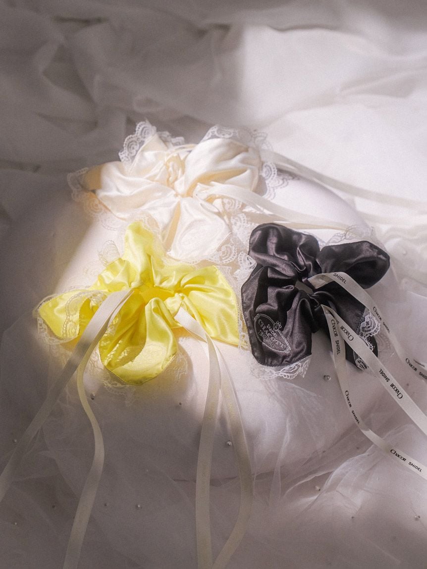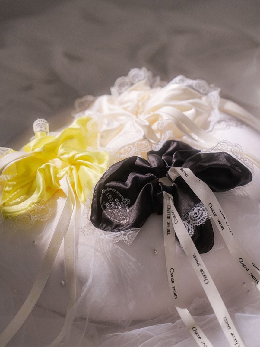 以帶有適度光澤感的布料,疊加花邊刺繡打造女性感髮束。
