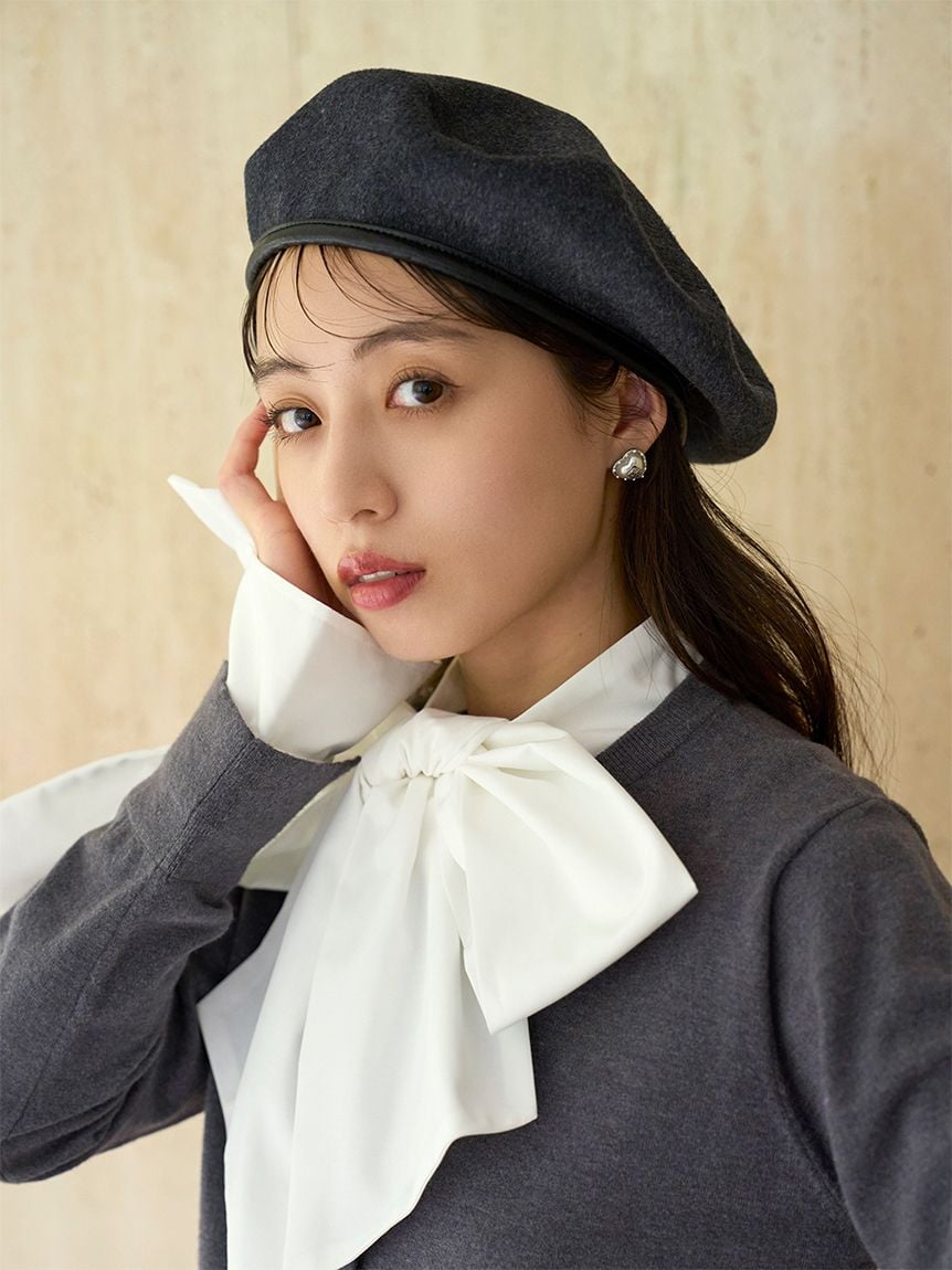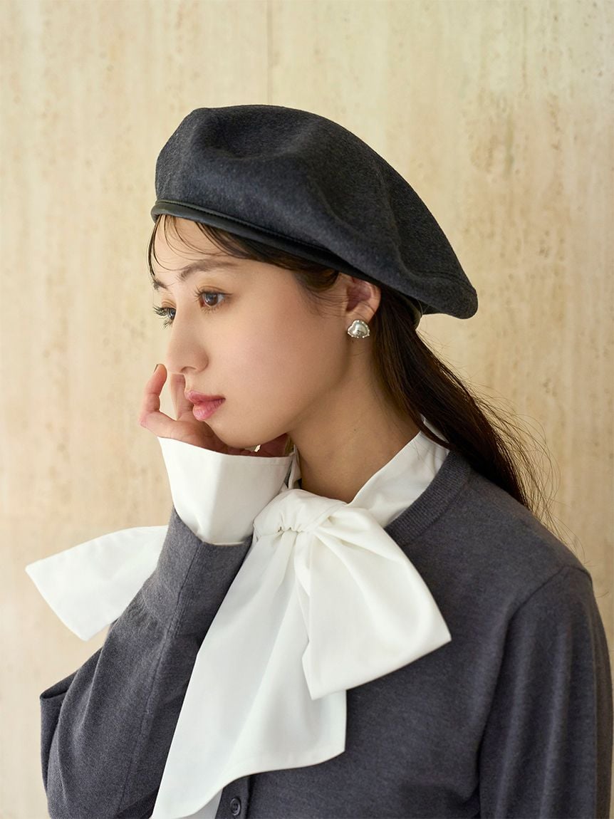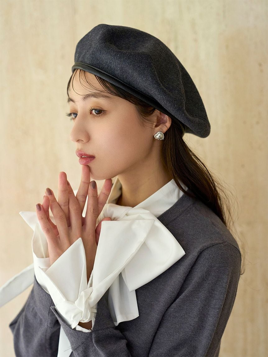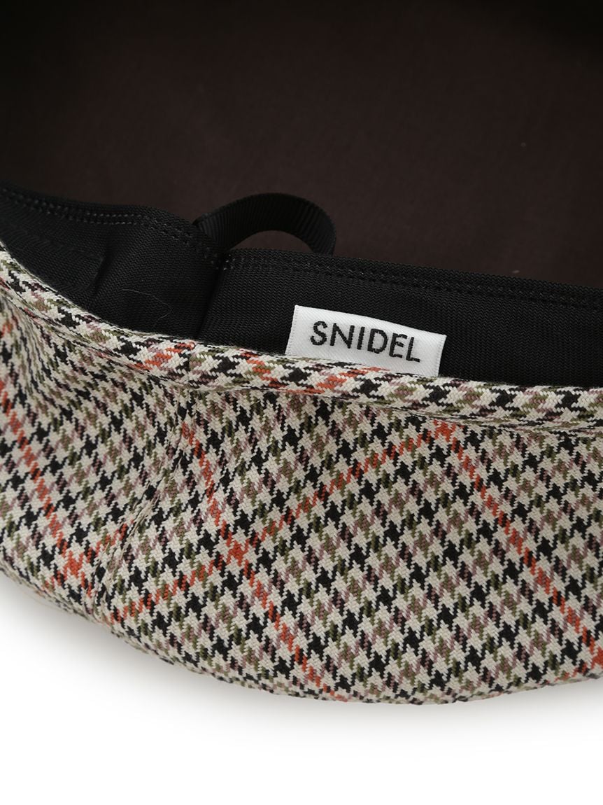 灰色與黑色款帽緣搭配仿皮革帽帶,增添質感。適中的帽型讓臉型更顯小巧,內側可調整尺寸,側邊SNIDEL標誌刺繡為細節亮點。