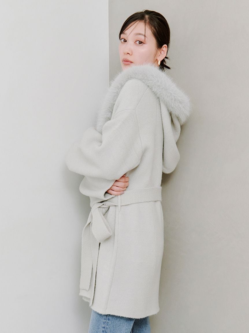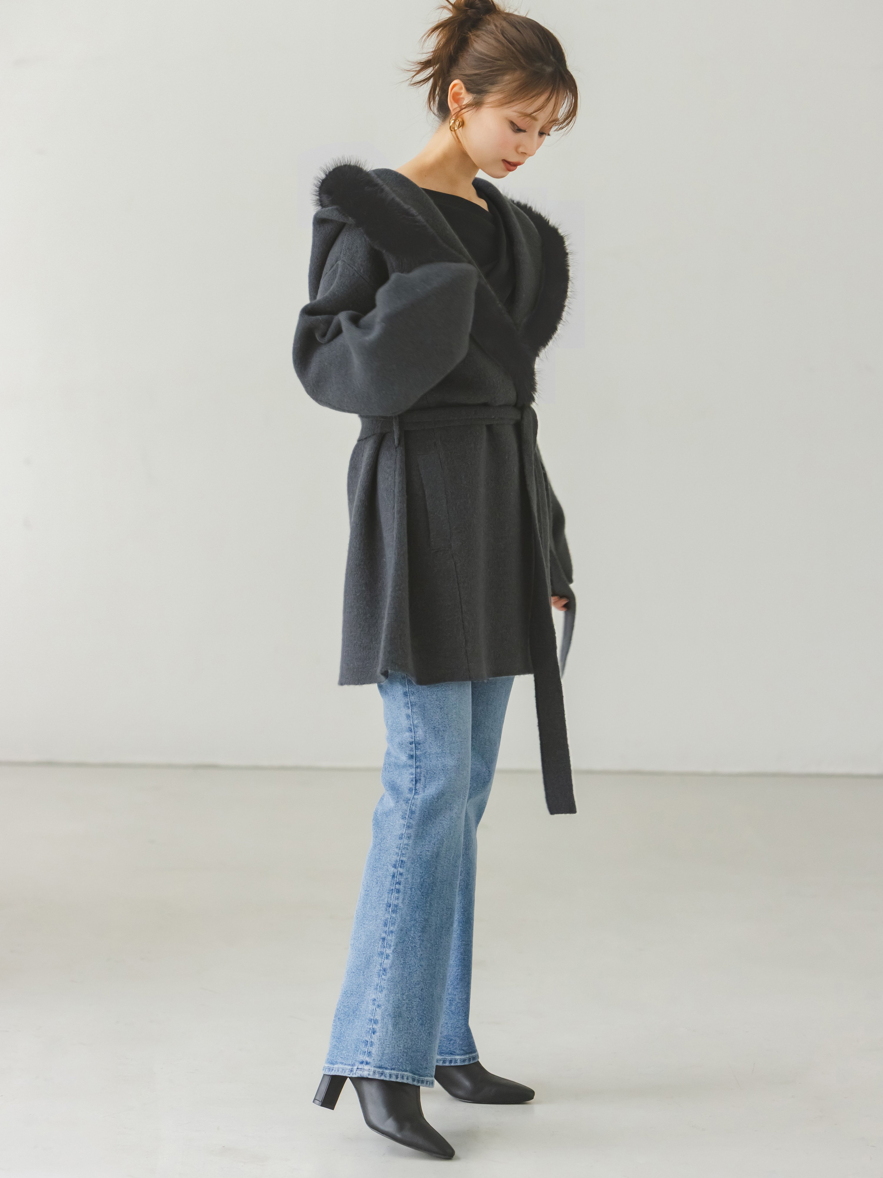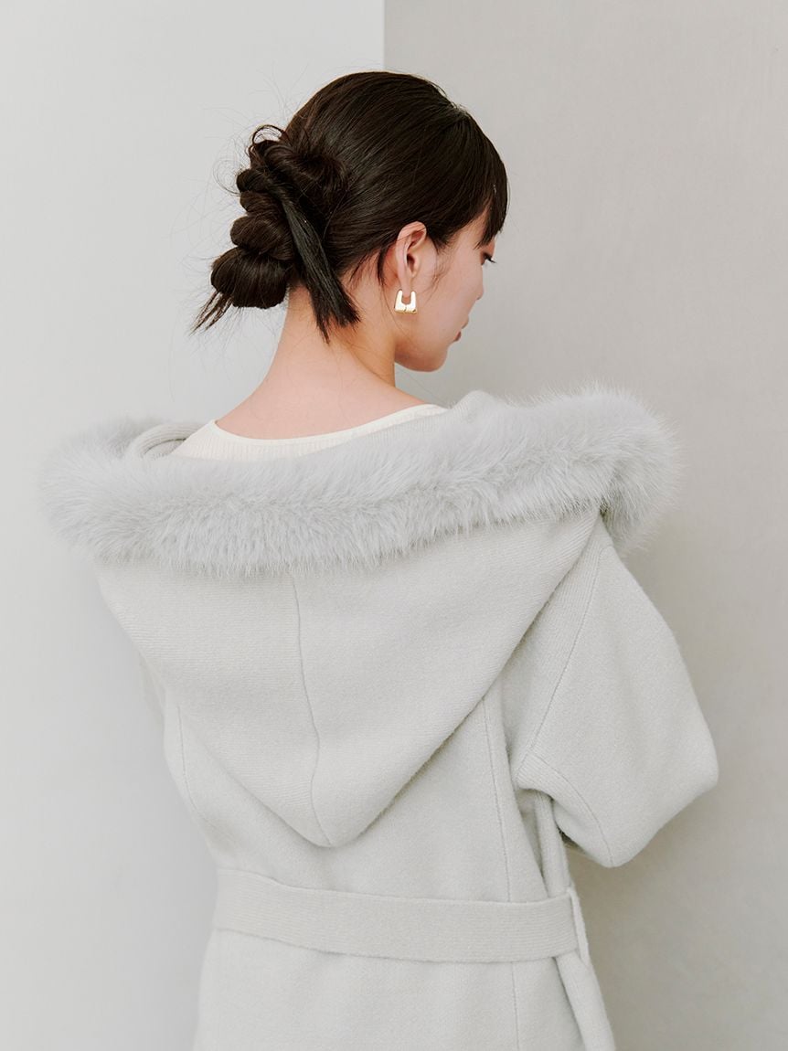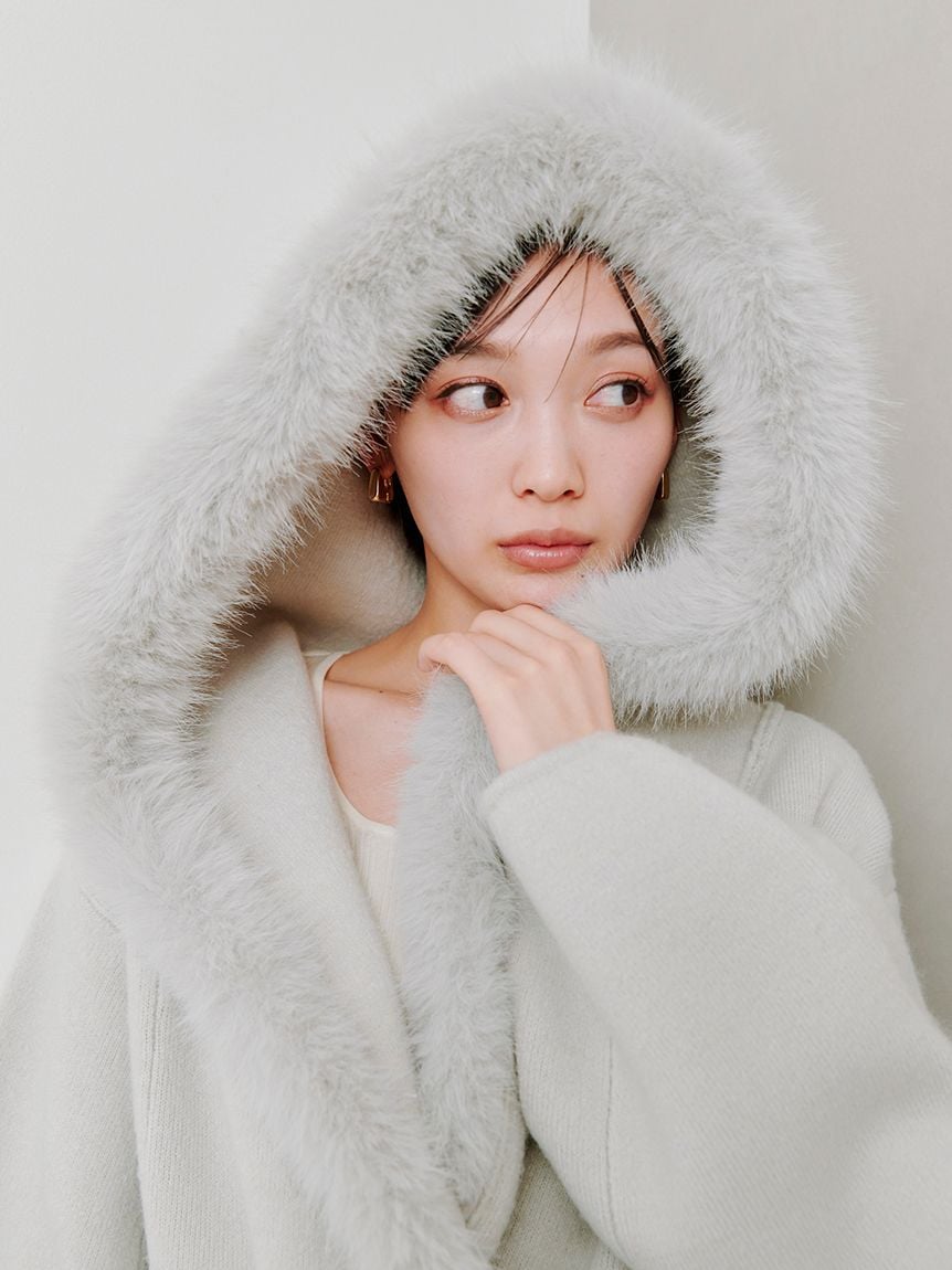 這款針織外套採用細緻編織,觸感柔軟,營造溫柔氣息。大而蓬鬆的帽子巧妙修飾鎖骨線條,帽邊搭配柔軟華麗的仿毛毛裝飾,更增添華麗感。附有腰帶,可依喜好調整版型,袖口圓潤設計,展現女性柔美。