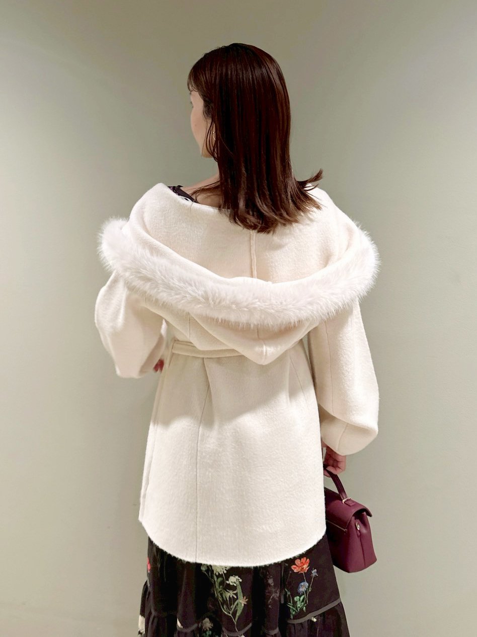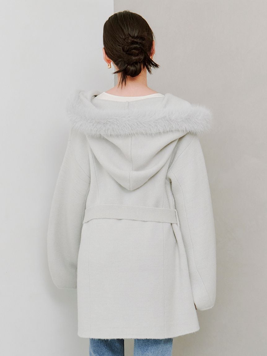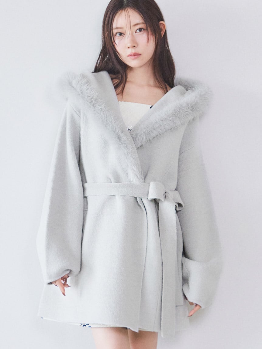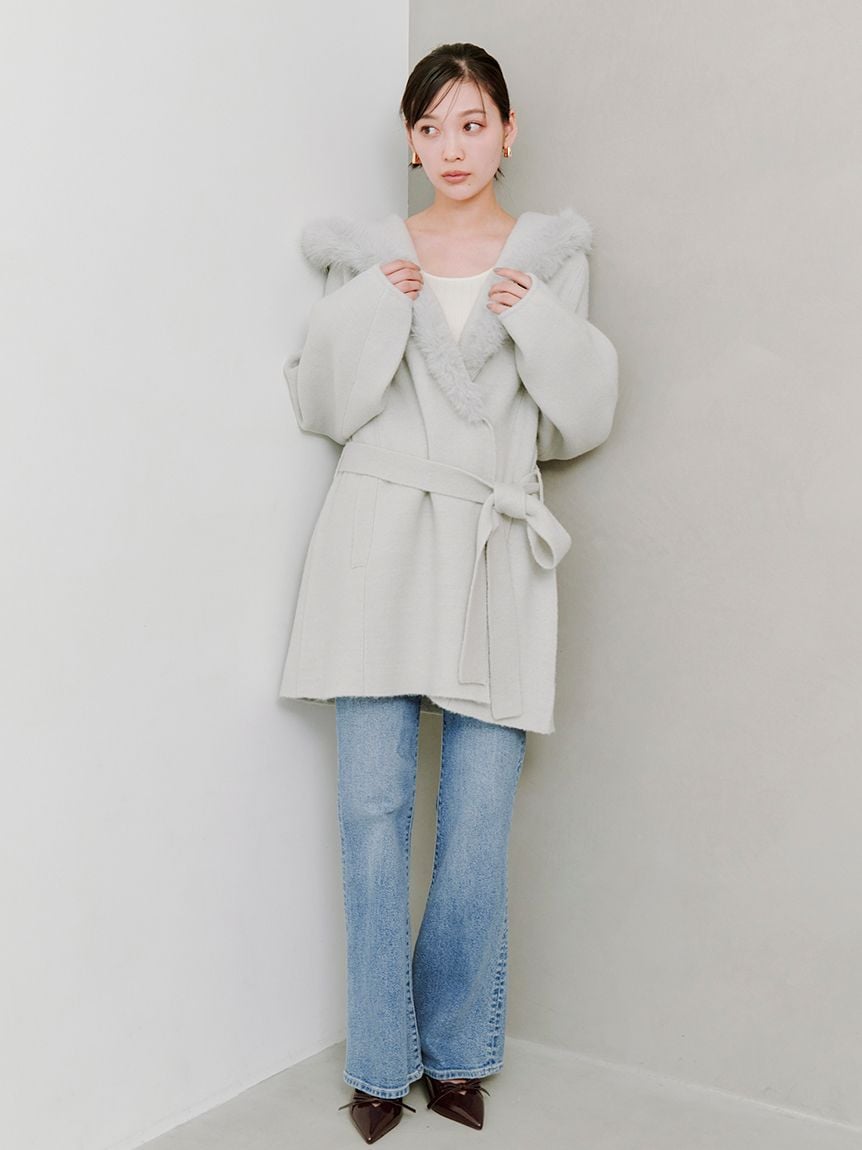 這款針織外套採用細緻編織,觸感柔軟,營造溫柔氣息。大而蓬鬆的帽子巧妙修飾鎖骨線條,帽邊搭配柔軟華麗的仿毛毛裝飾,更增添華麗感。附有腰帶,可依喜好調整版型,袖口圓潤設計,展現女性柔美。