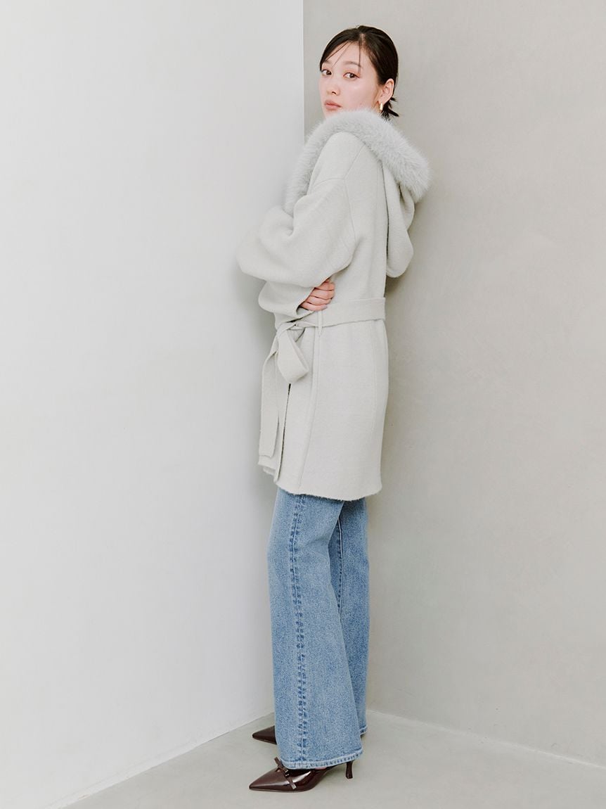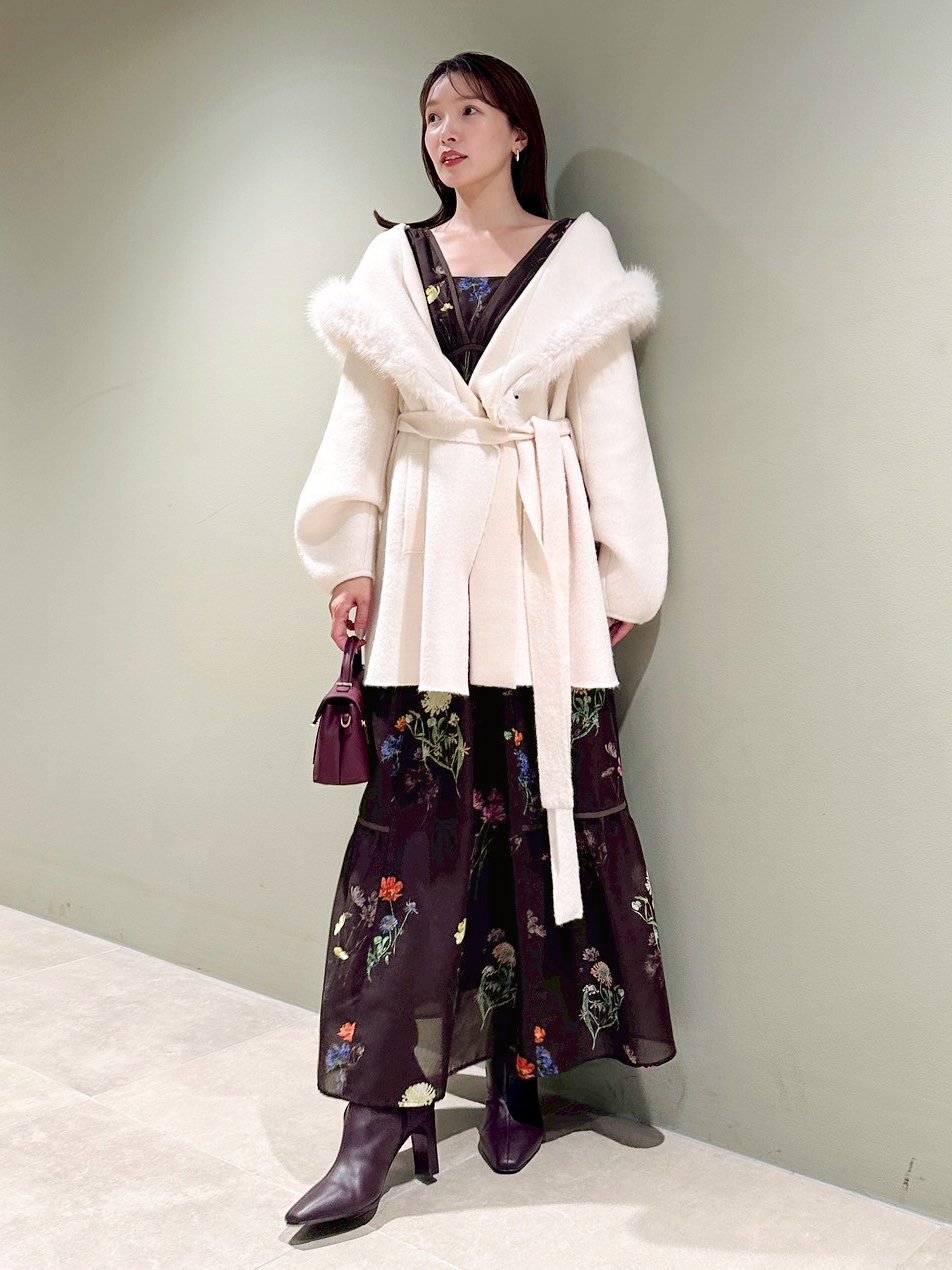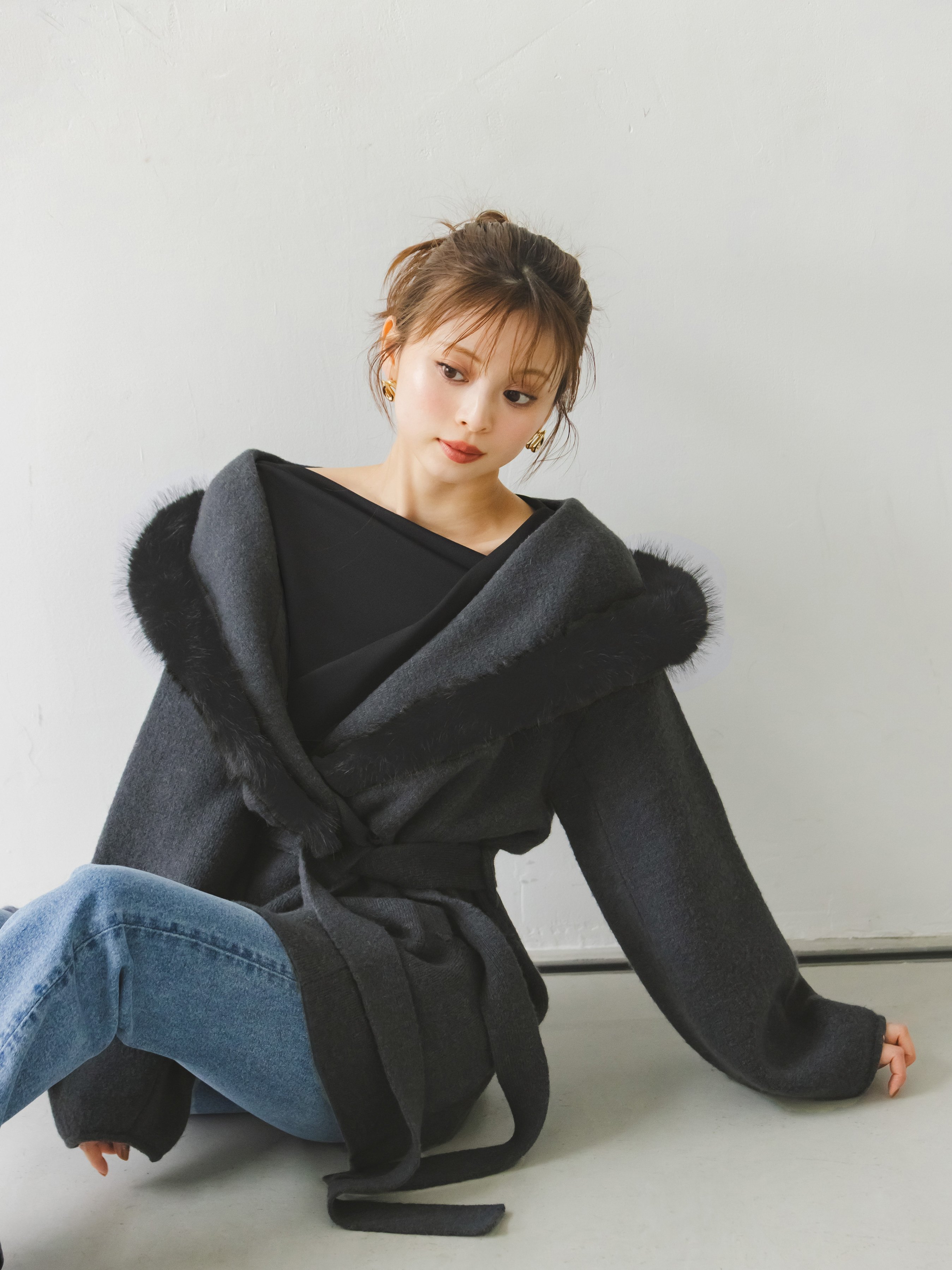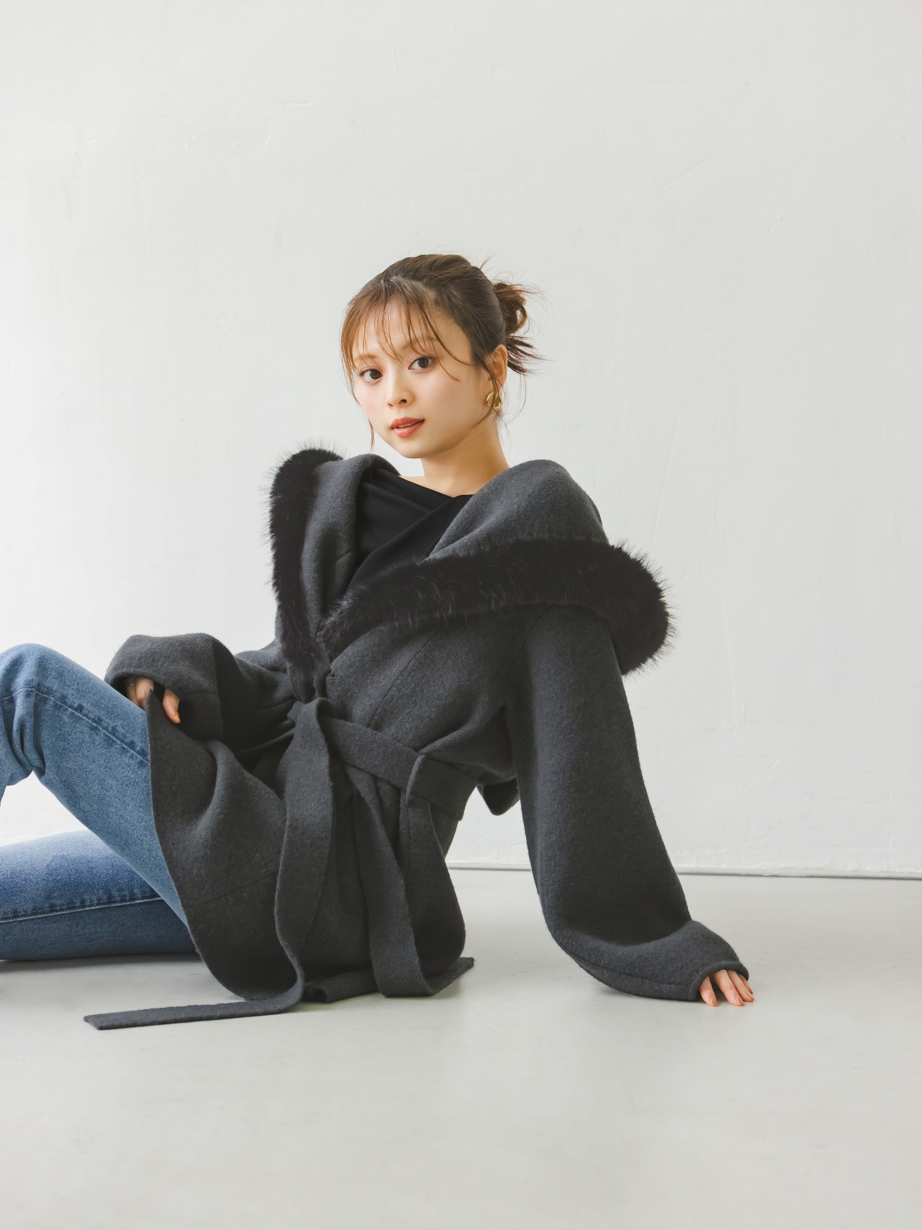 這款針織外套採用細緻編織,觸感柔軟,營造溫柔氣息。大而蓬鬆的帽子巧妙修飾鎖骨線條,帽邊搭配柔軟華麗的仿毛毛裝飾,更增添華麗感。附有腰帶,可依喜好調整版型,袖口圓潤設計,展現女性柔美。