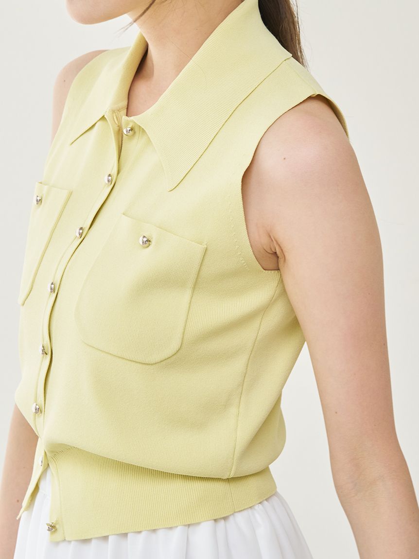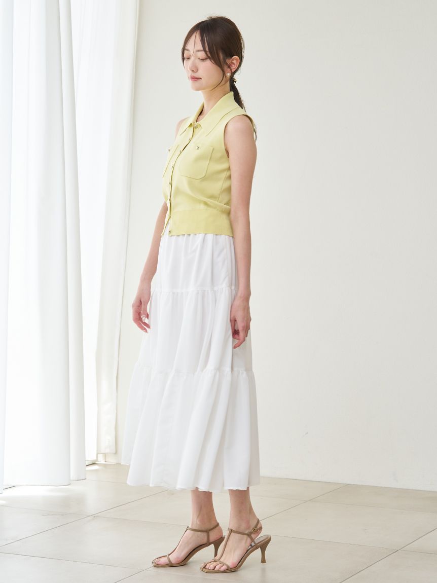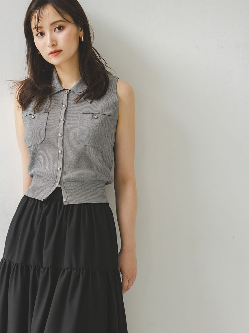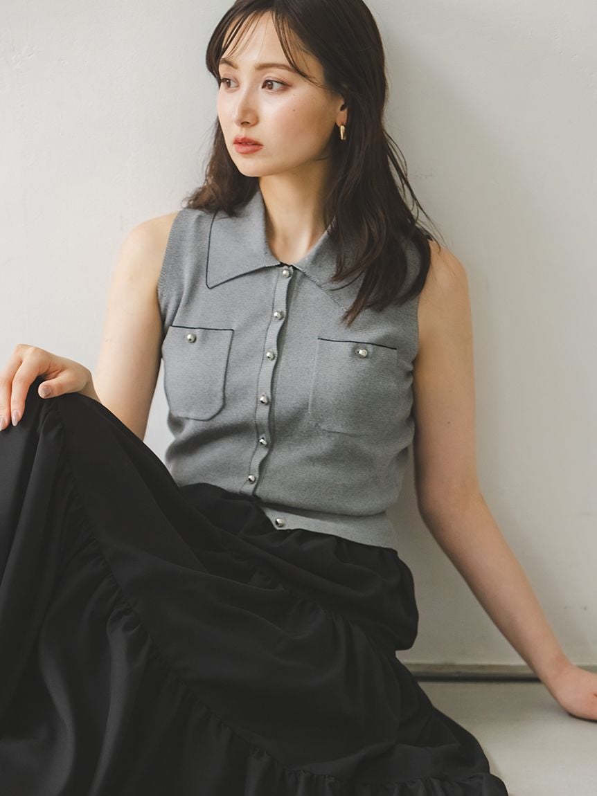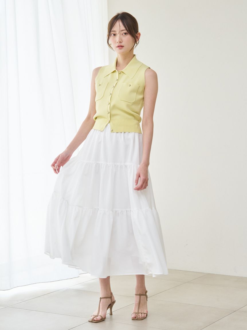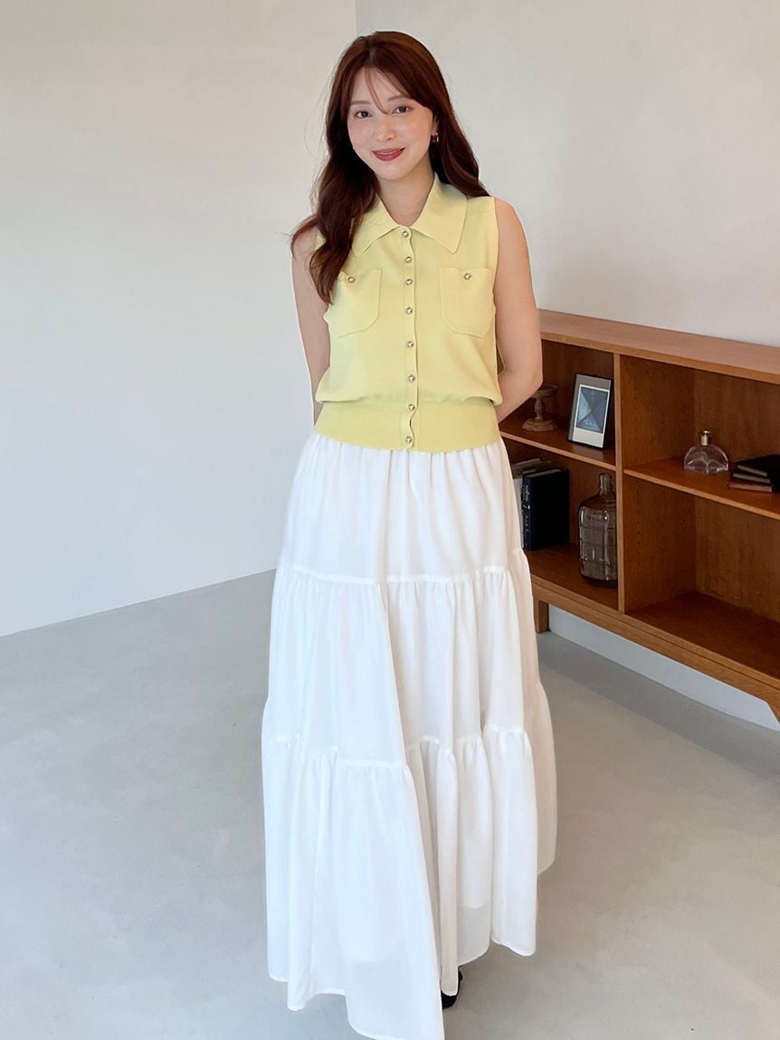 以金屬釦點綴的領口設計針織背心,搭配輕盈柔軟的層次長裙,展現精緻氣質。背心以細緻織紋打造俐落線條,胸前附口袋作為細節點綴,圓潤金屬釦為整體增添雅致光澤。