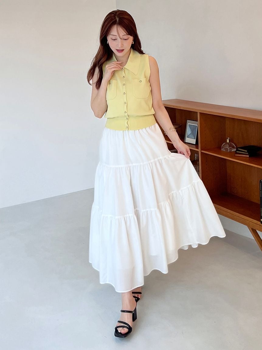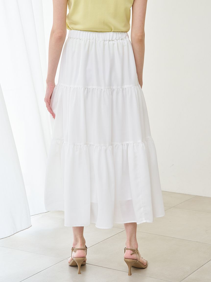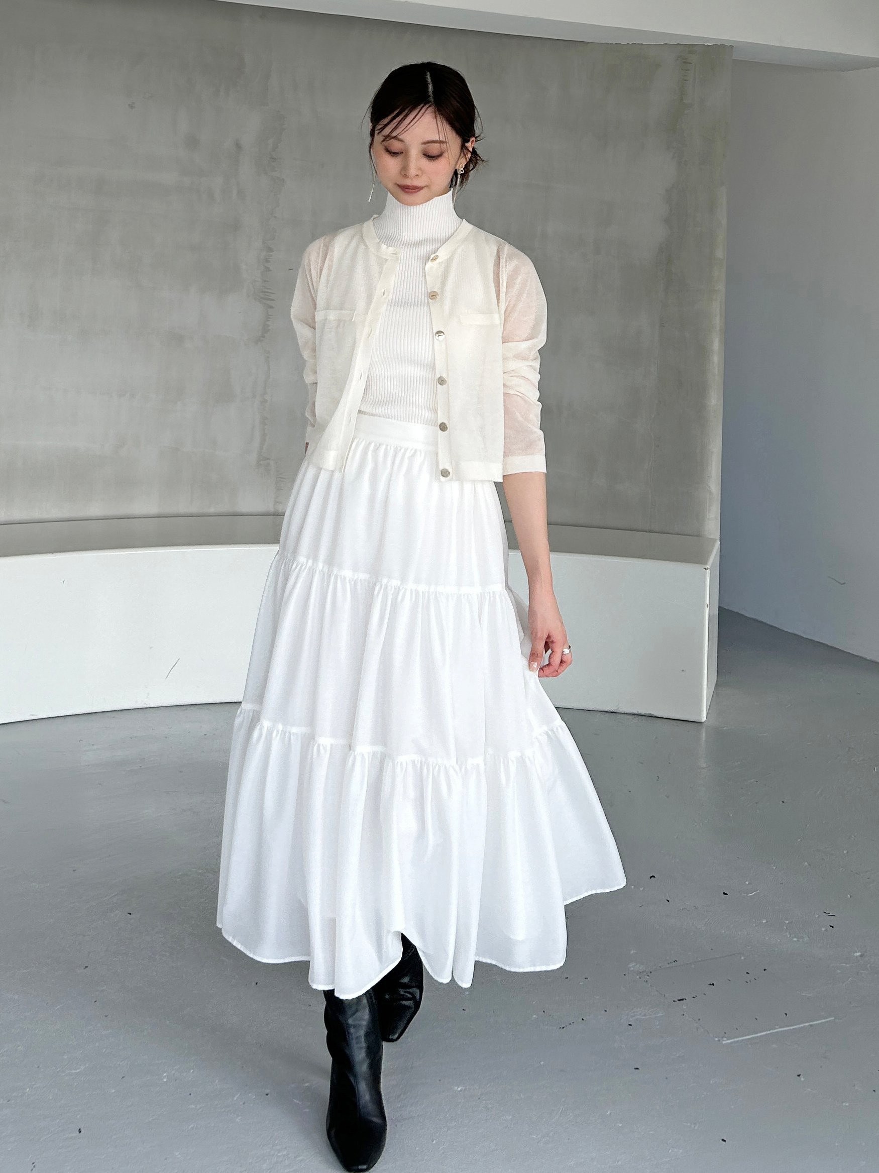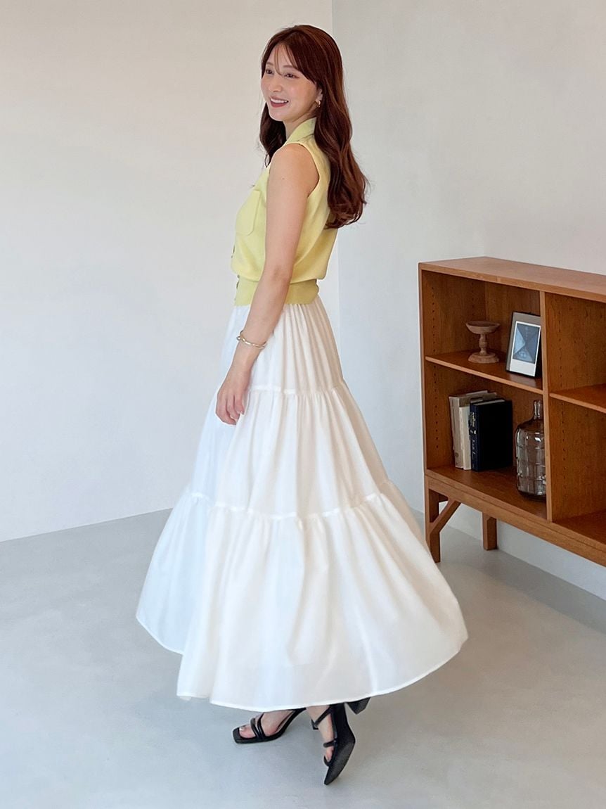 建議可開第一顆釦子,營造自然率性印象。長裙以輕薄布料縫製,展現輕盈蓬度,層層堆疊的裙身比例經過精心調整,呈現柔美動感。腰部為鬆緊設計,穿脫便利,並附內裏可安心著用。