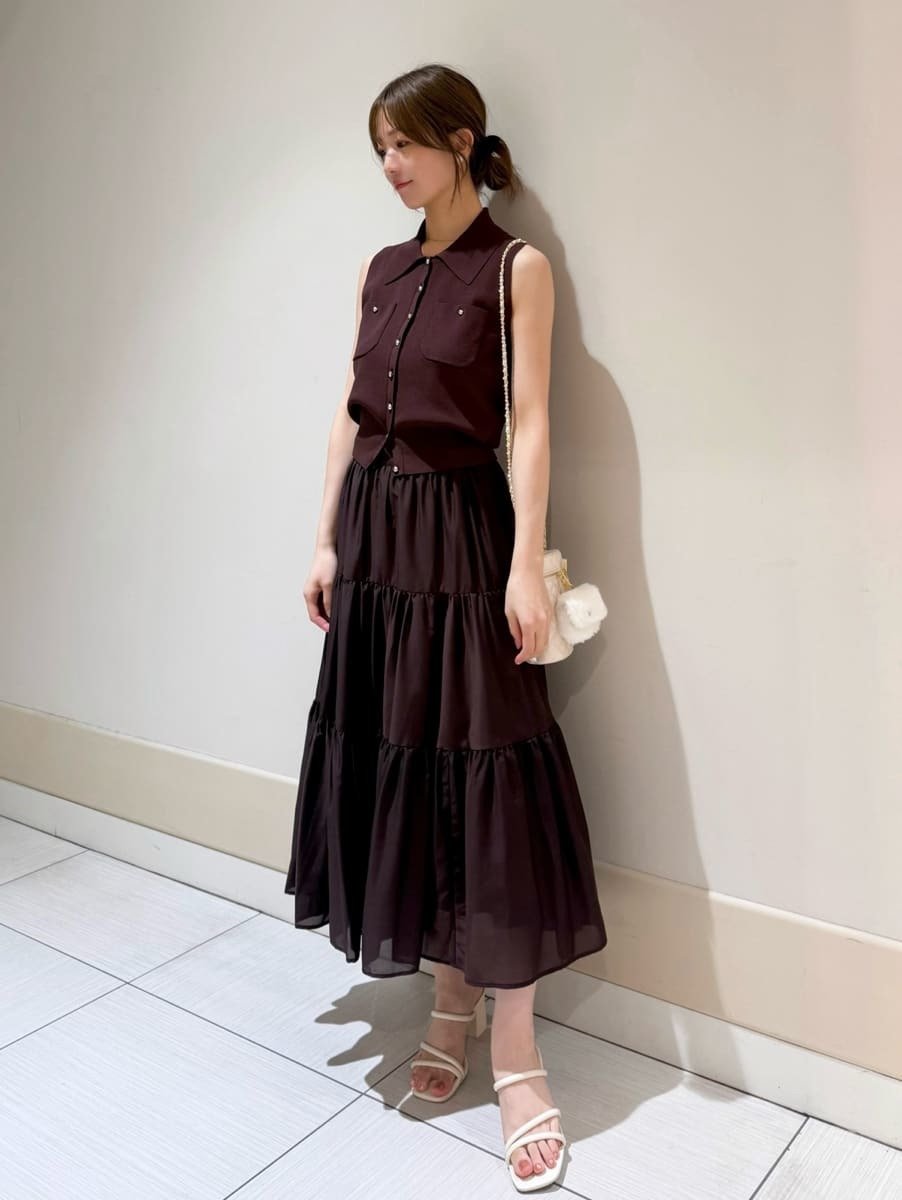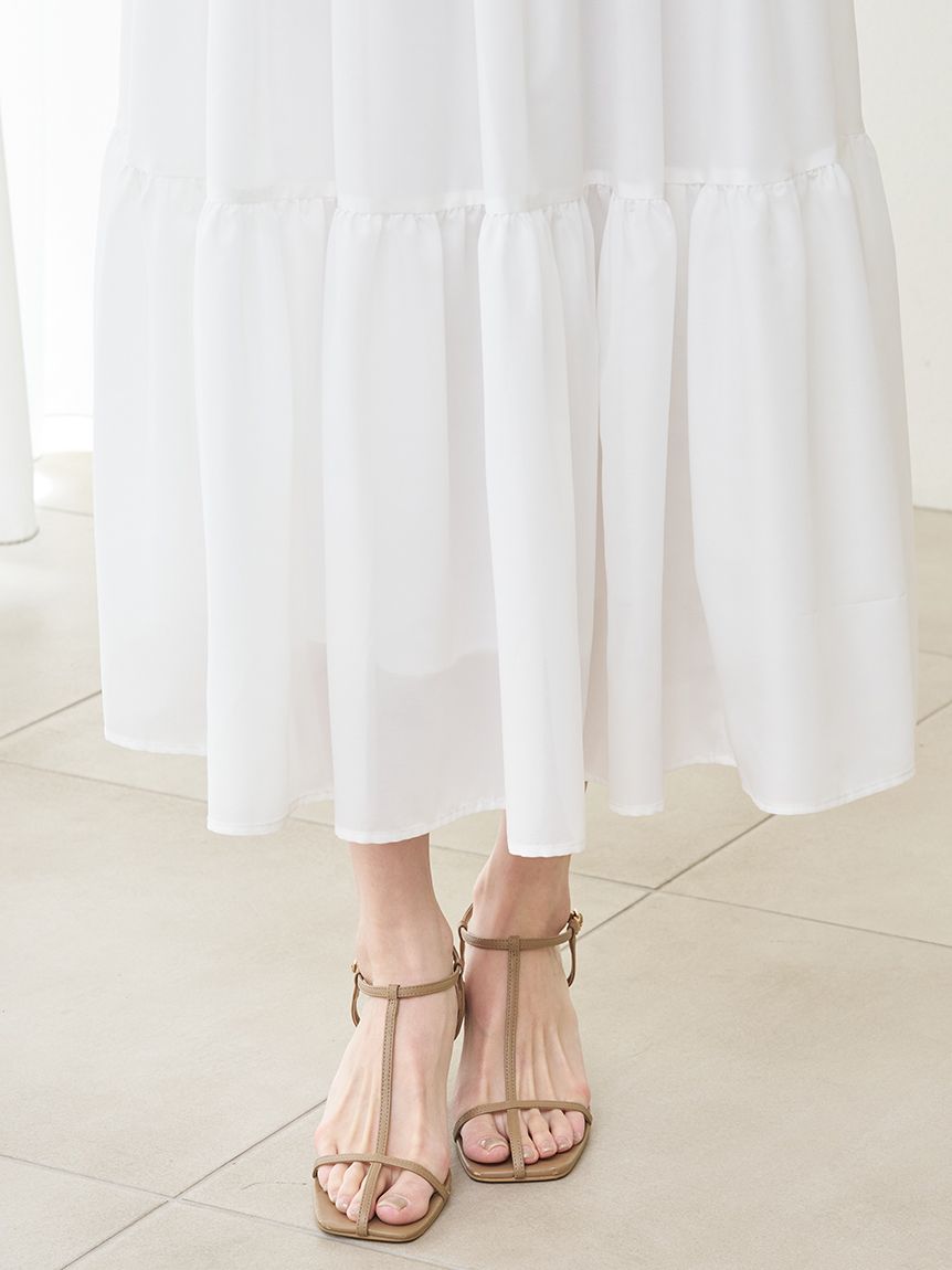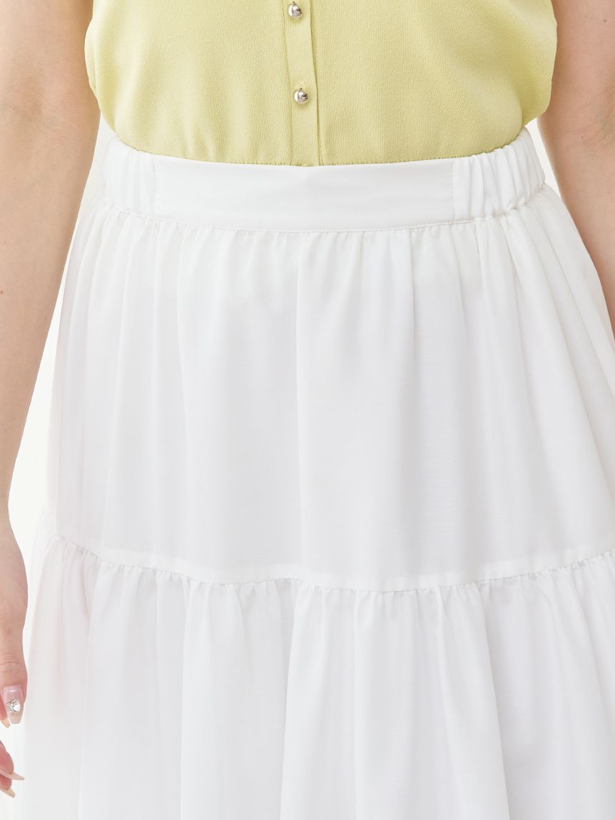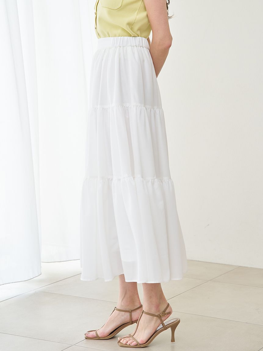 建議可開第一顆釦子,營造自然率性印象。長裙以輕薄布料縫製,展現輕盈蓬度,層層堆疊的裙身比例經過精心調整,呈現柔美動感。腰部為鬆緊設計,穿脫便利,並附內裏可安心著用。