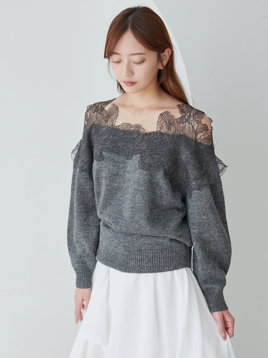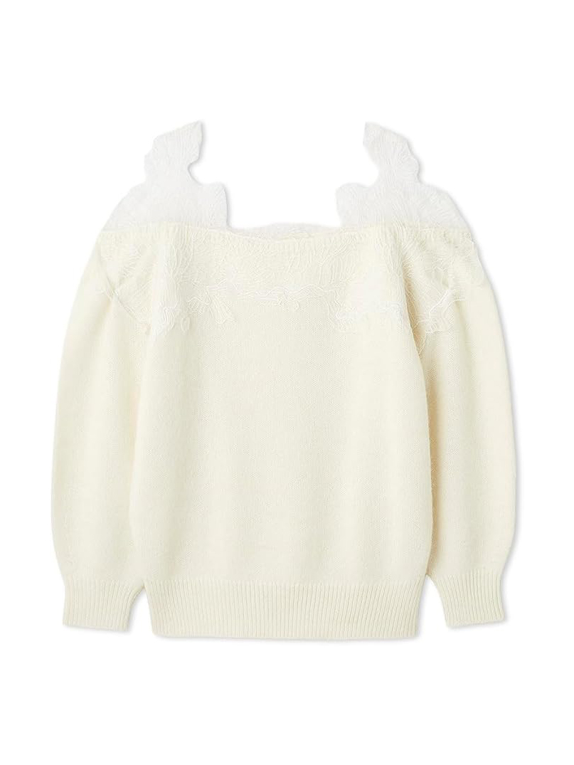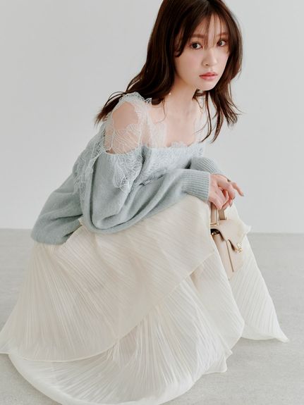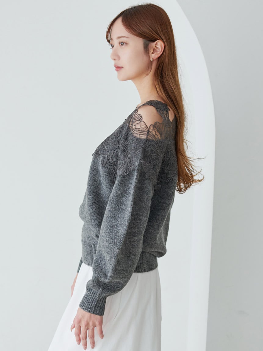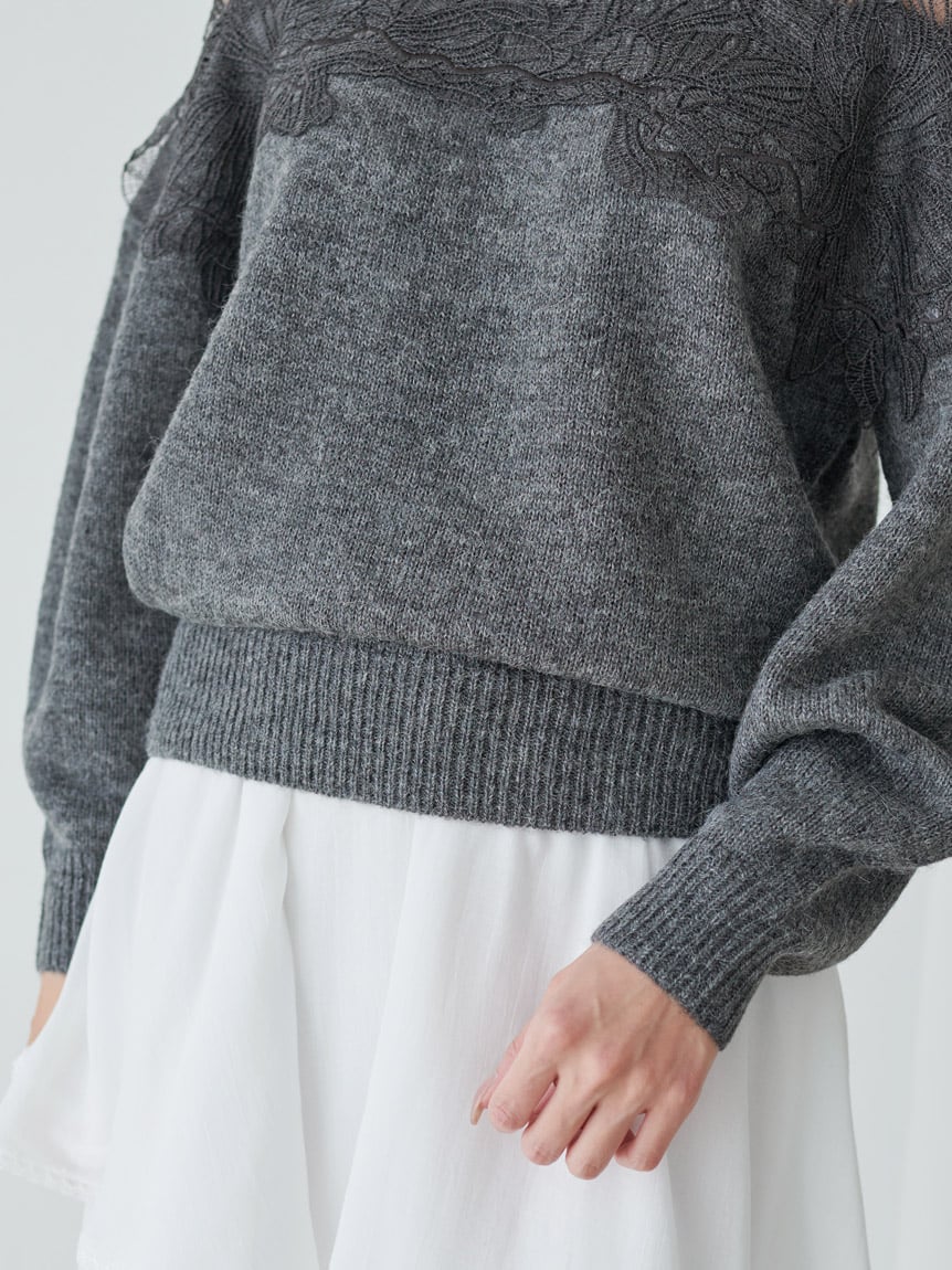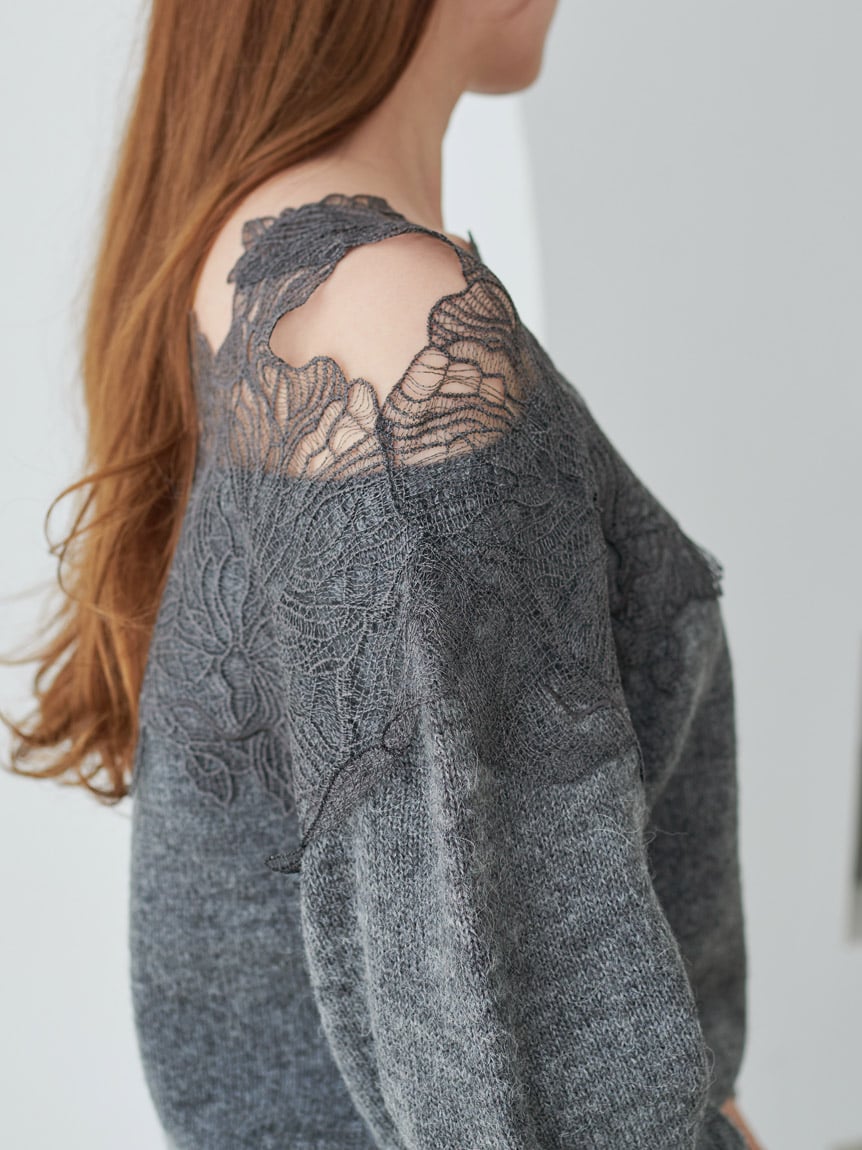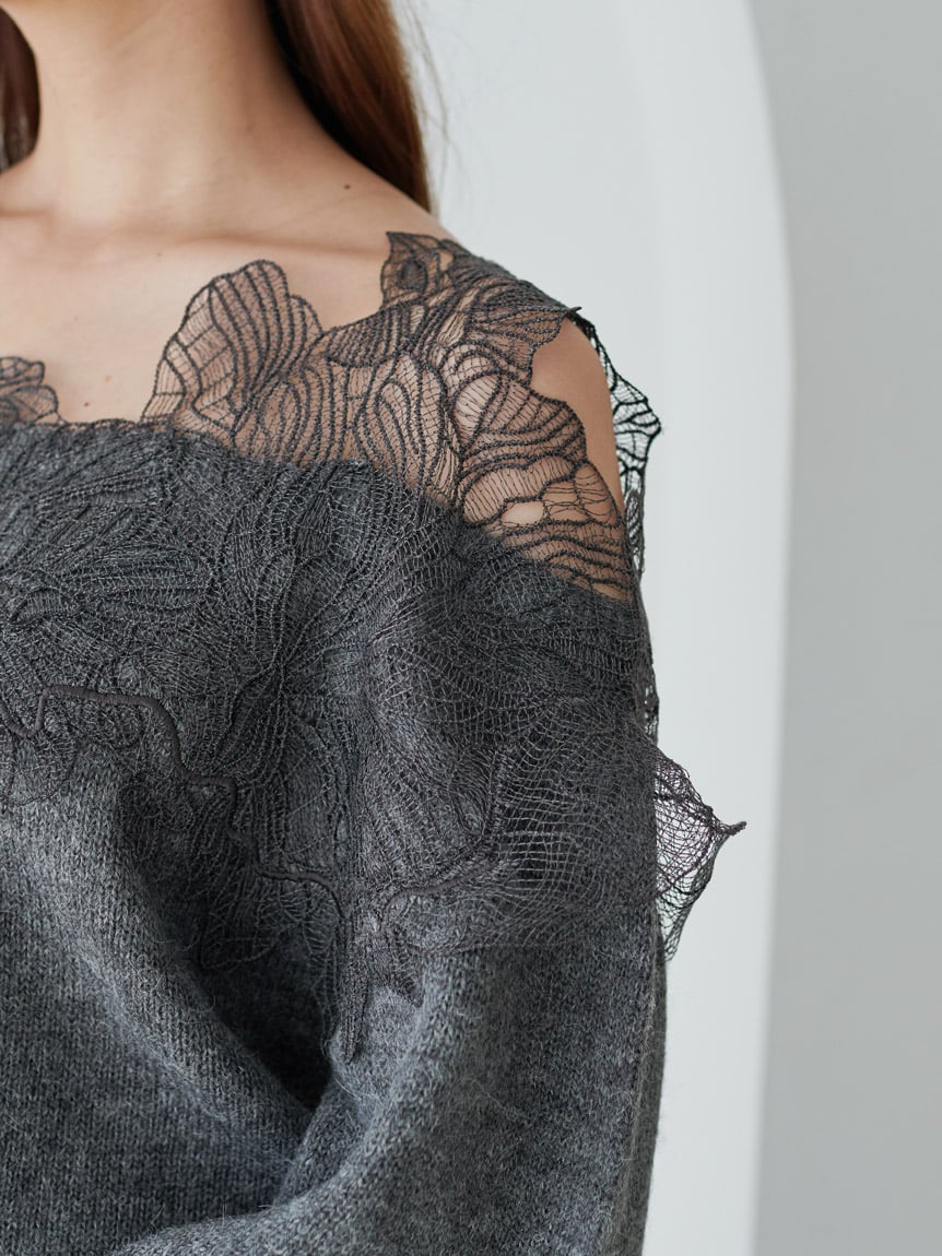 帶有光澤與透膚感的蕾絲,凸顯女性柔美氣息。針織部分採用混紡羊駝毛與羊毛的柔軟保暖素材。寬鬆輪廓營造自然隨性的穿搭感。